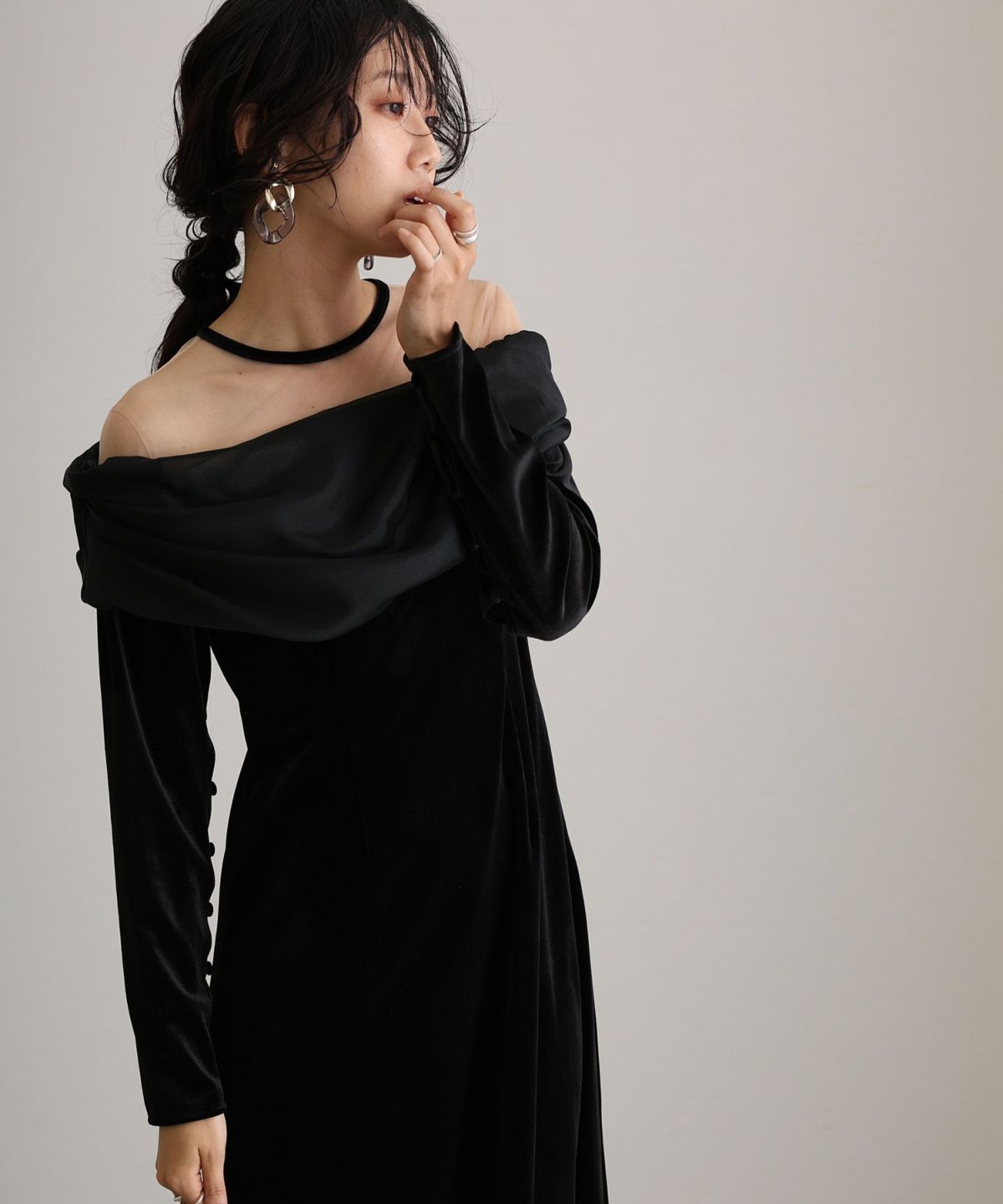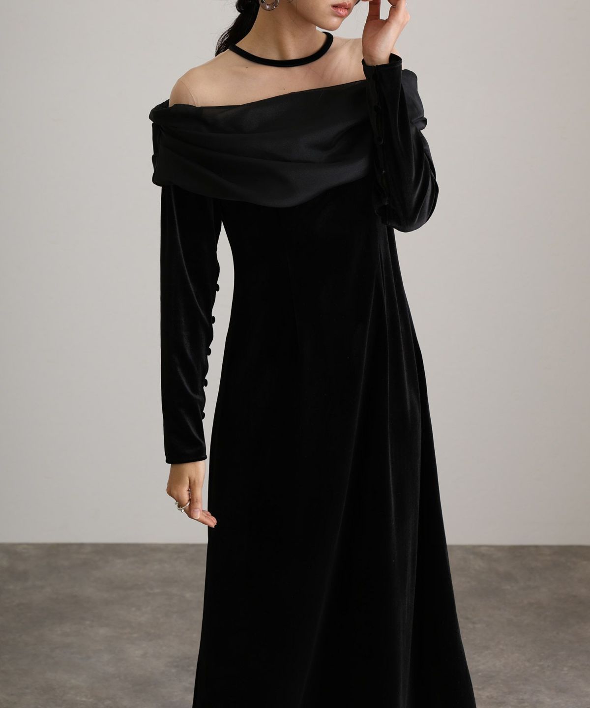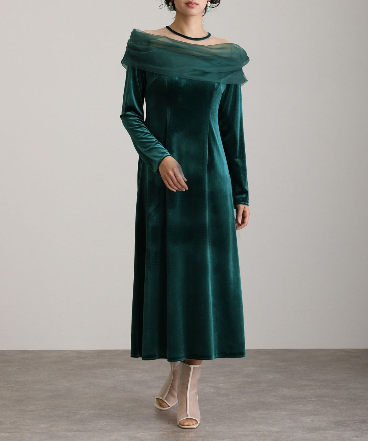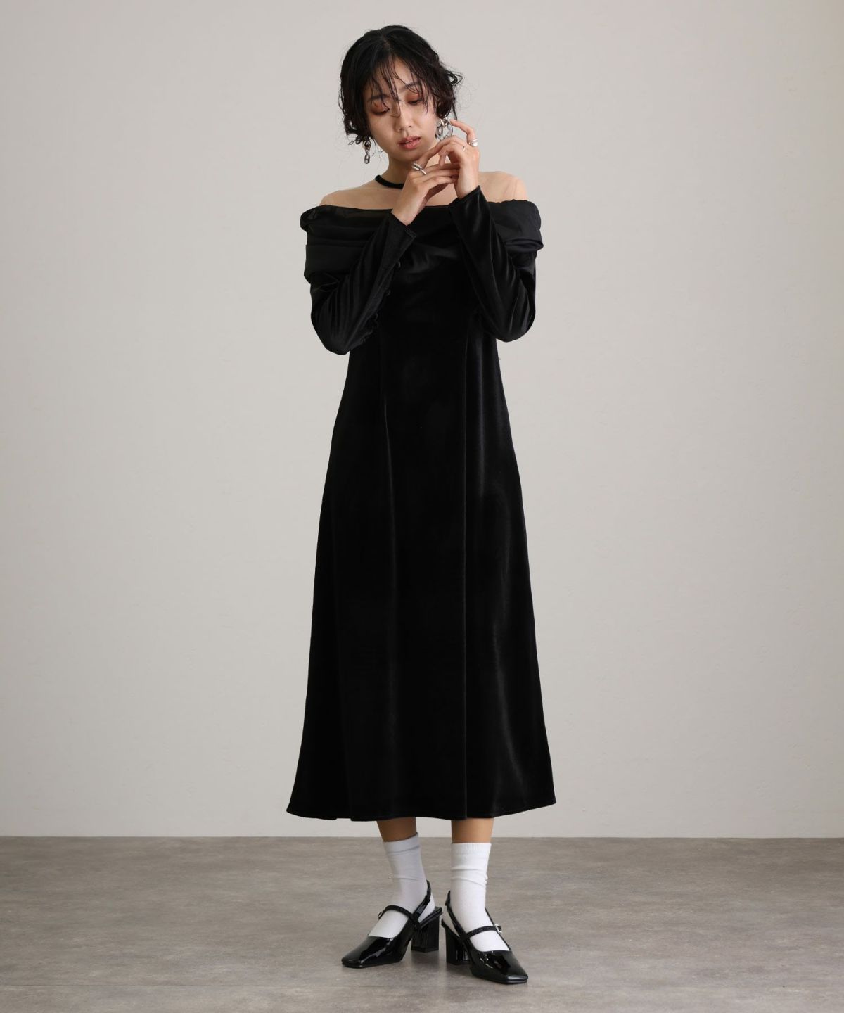光沢感のあるオフショルダーでデコルテを綺麗に オフショルダーベロアドレス