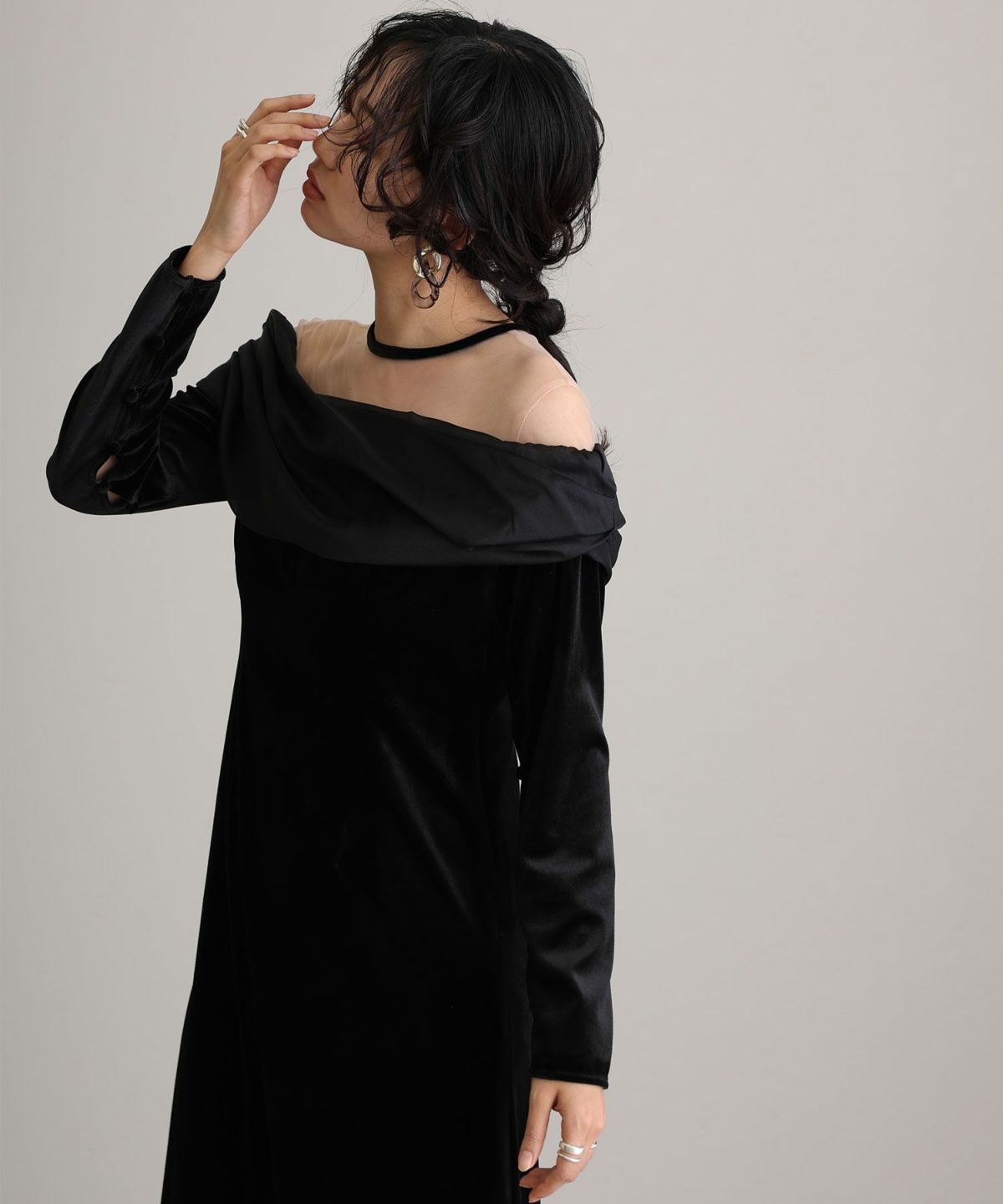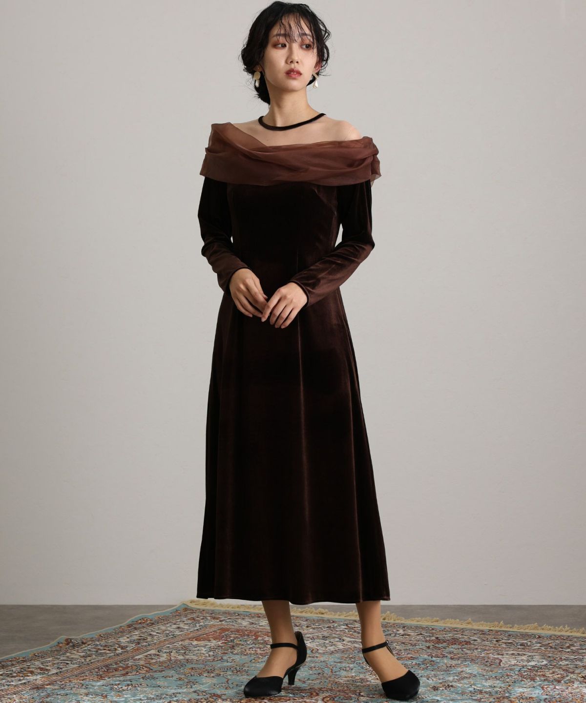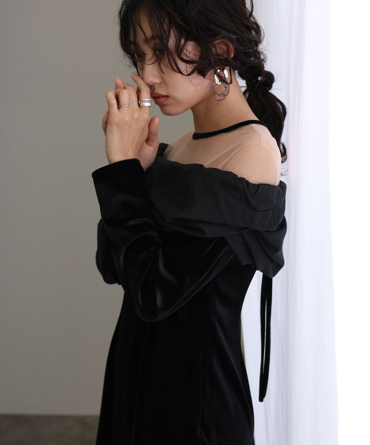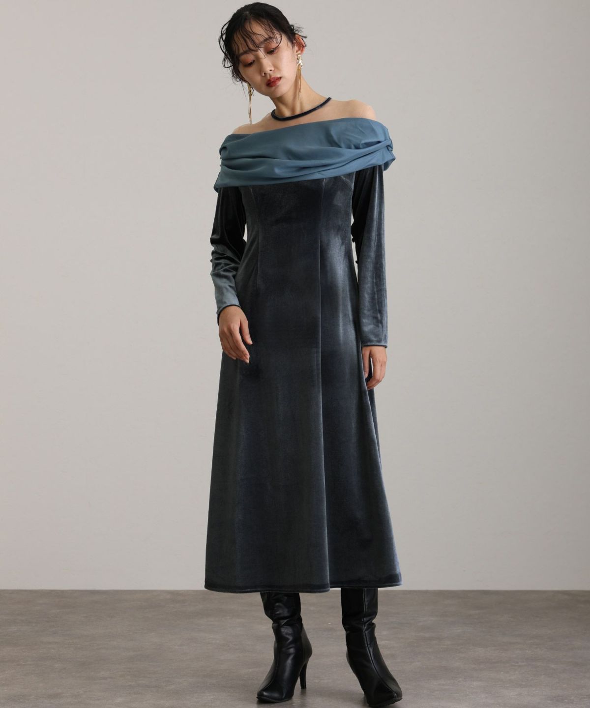 光沢感のあるオフショルダーでデコルテを綺麗に オフショルダーベロアドレス