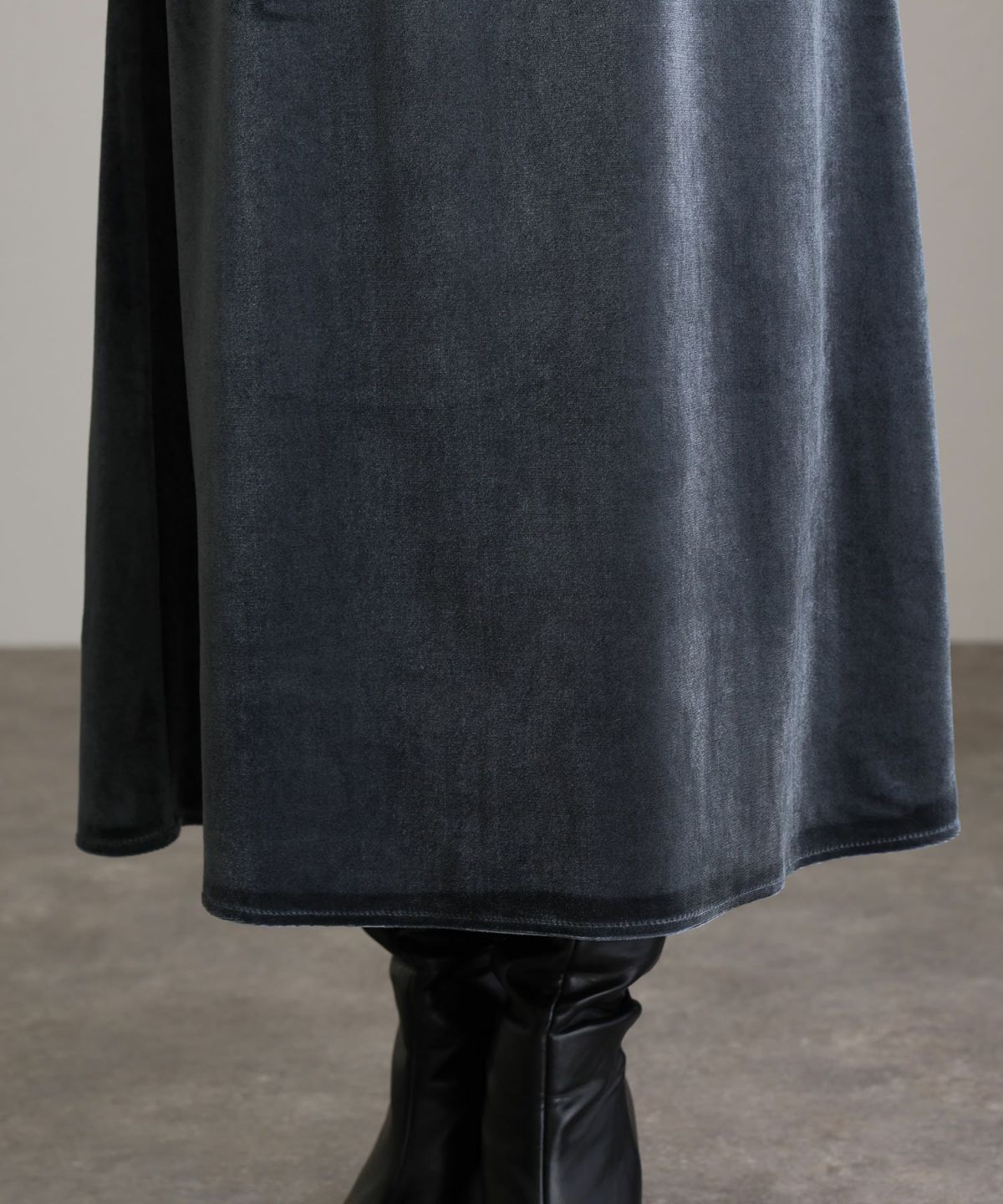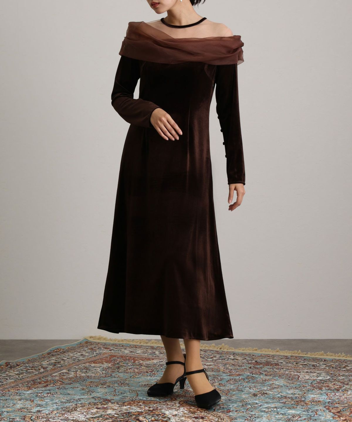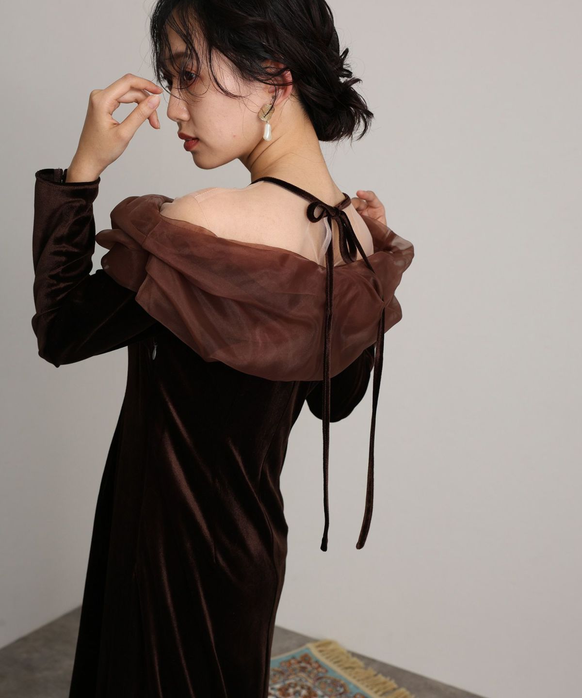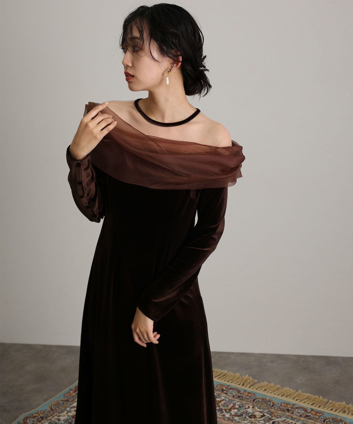 光沢感のあるオフショルダーでデコルテを綺麗に オフショルダーベロアドレス