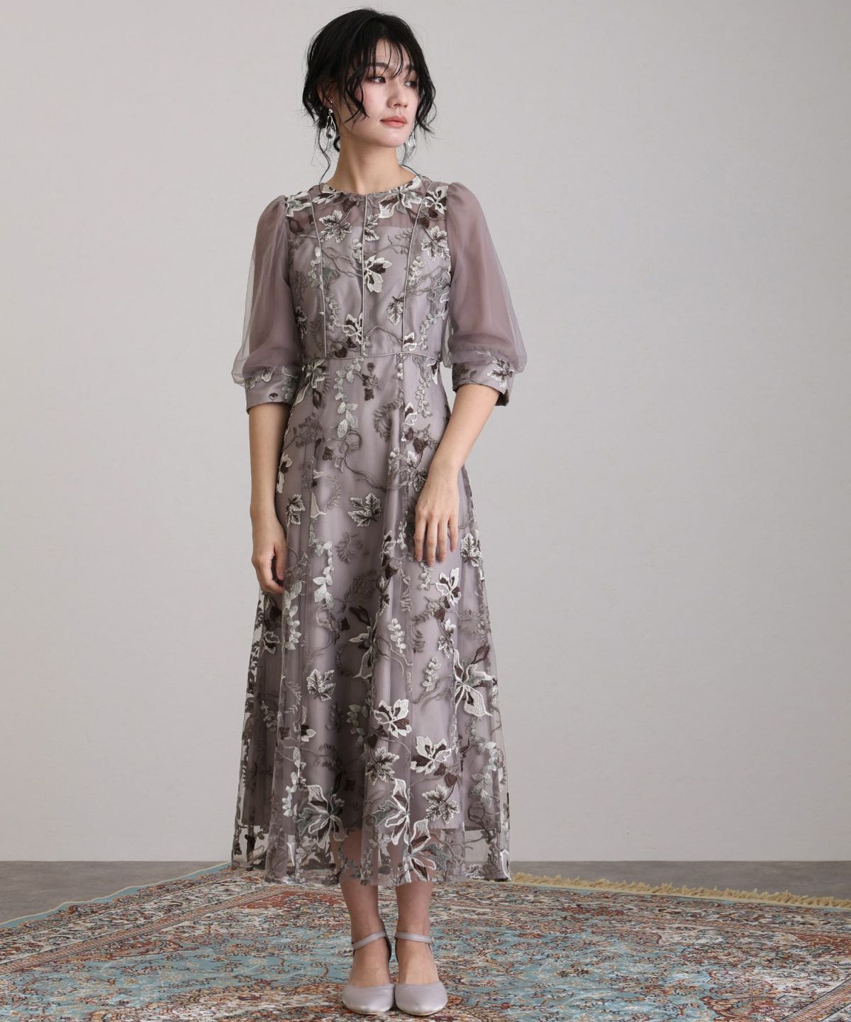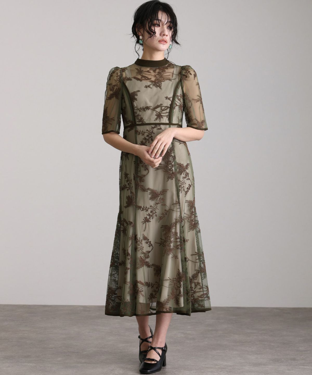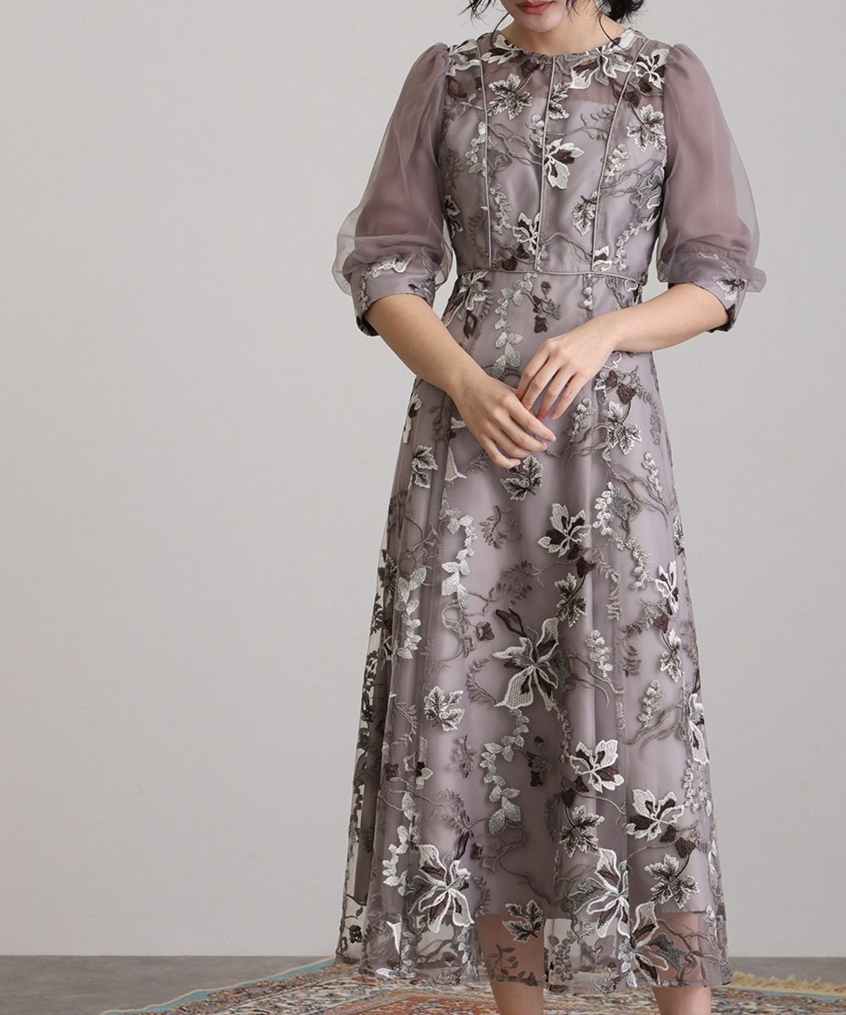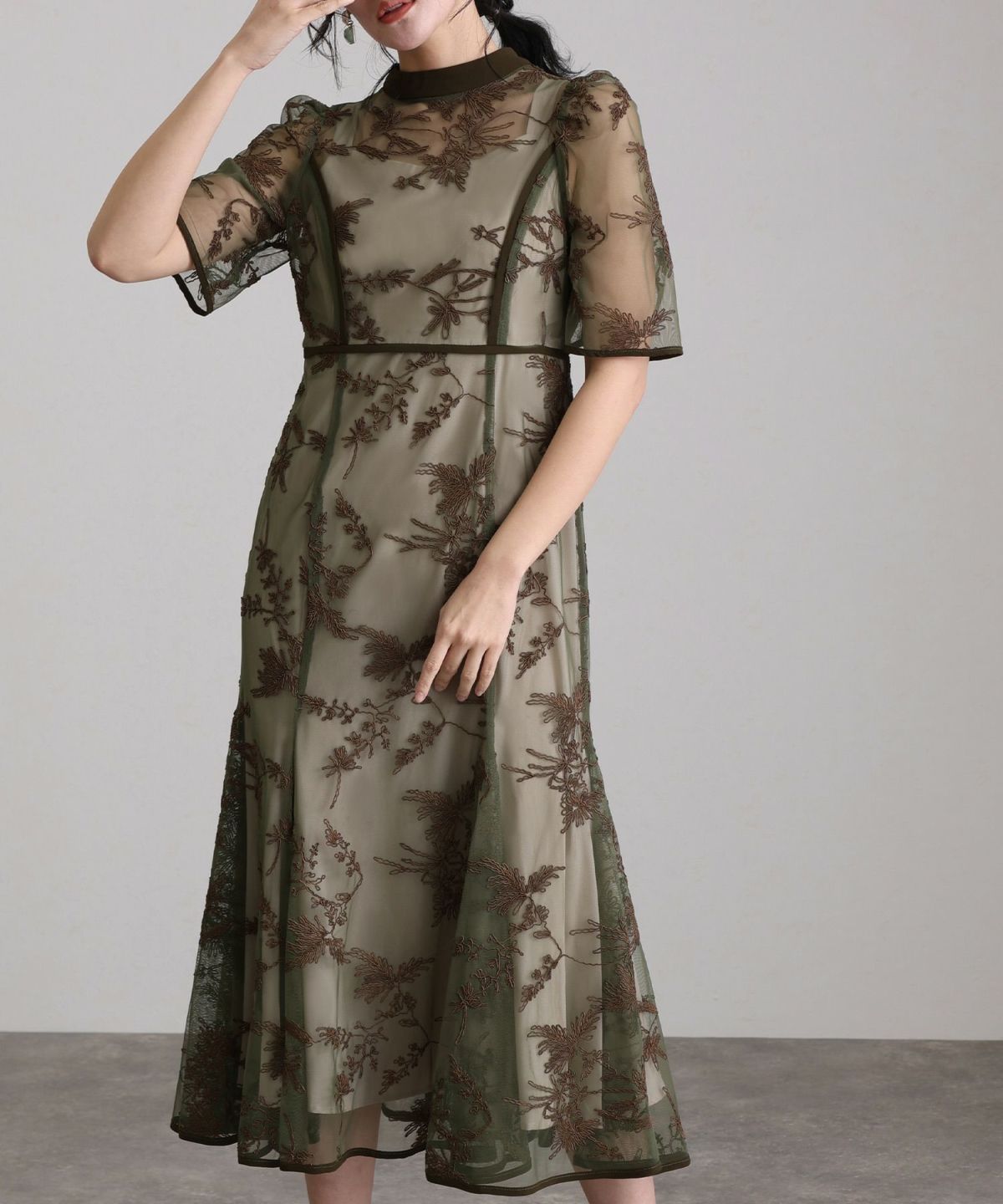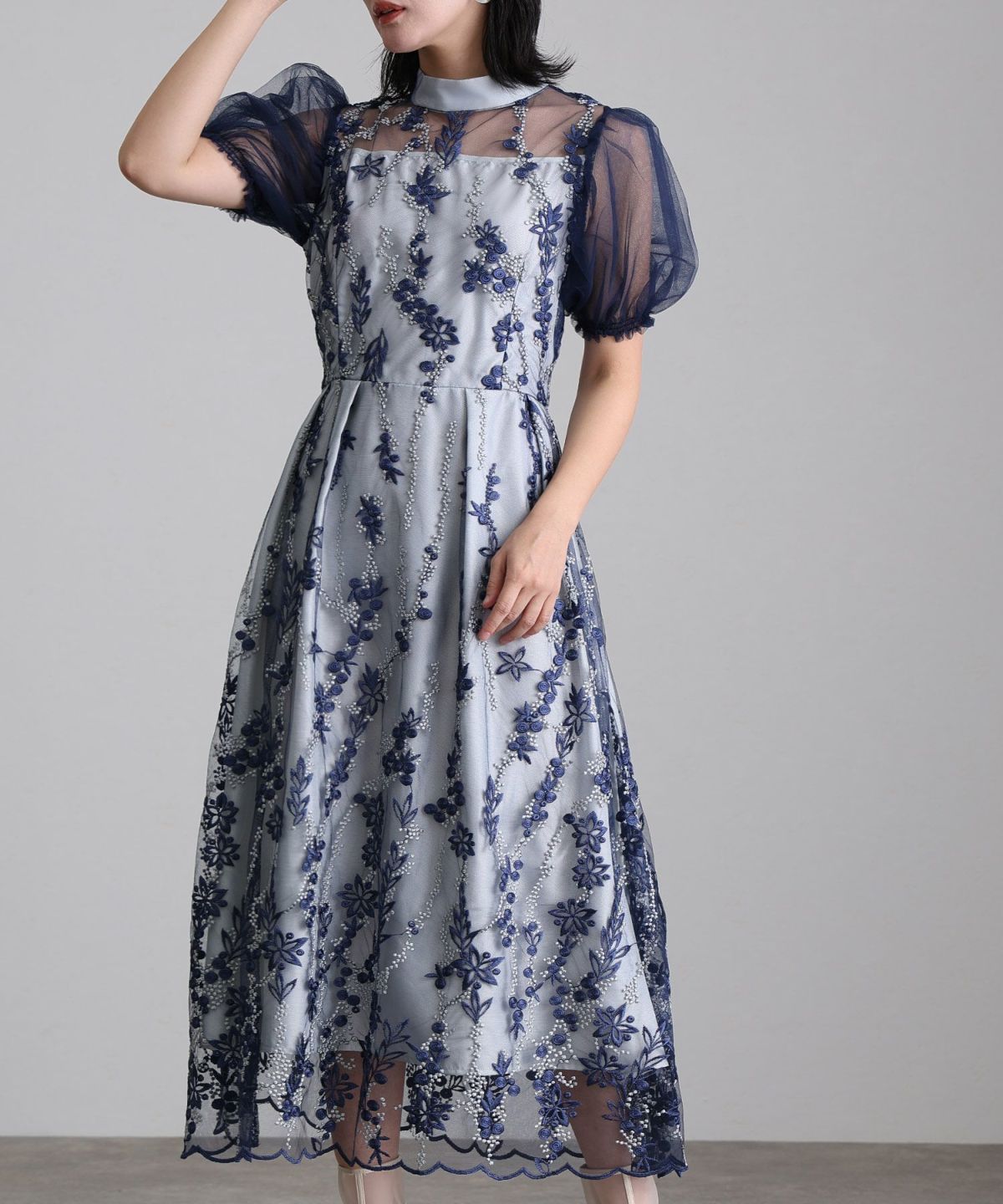 繊細な刺繍レースが施されたエレガントなドレス 総刺繍レースパフスリーブドレス