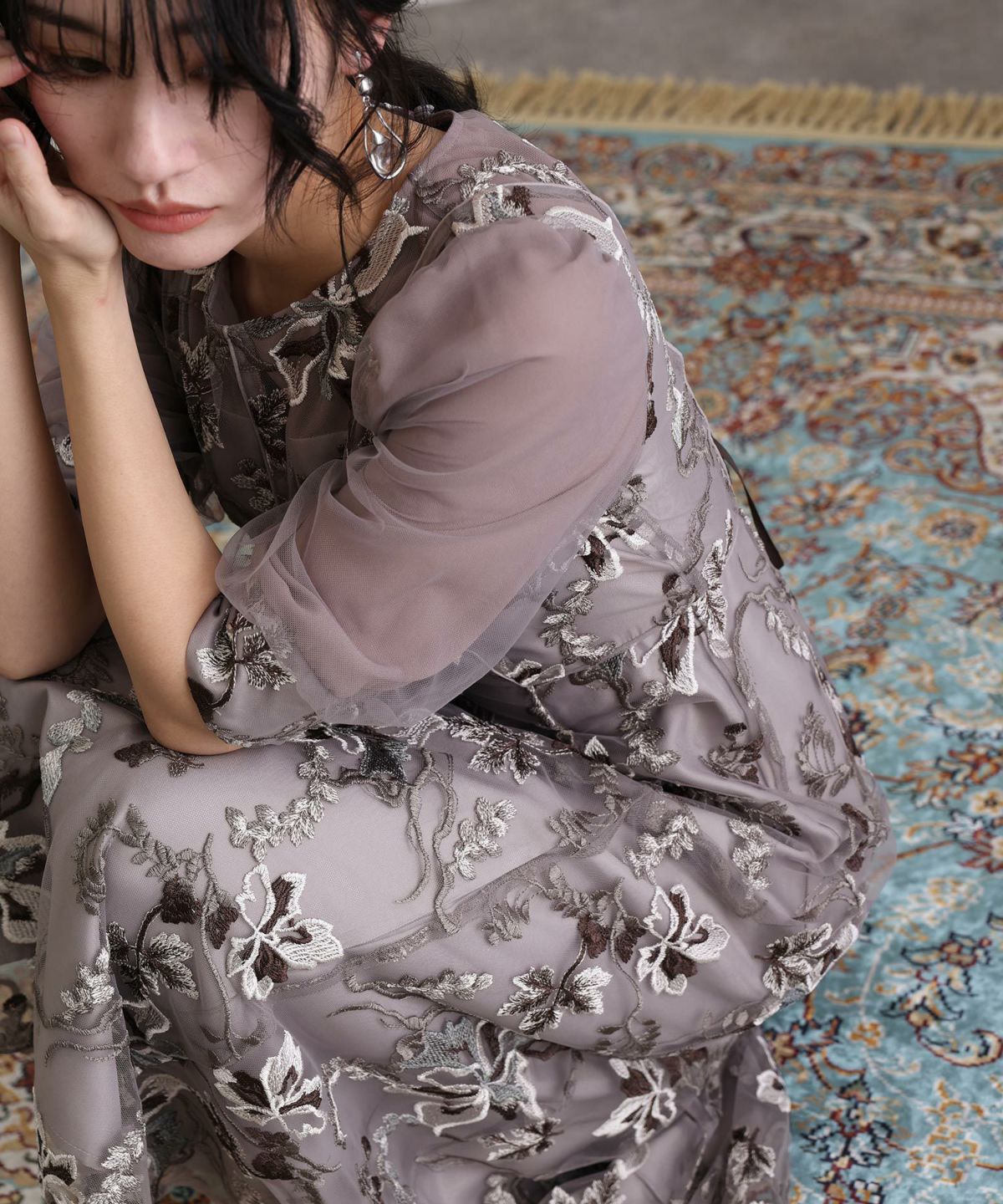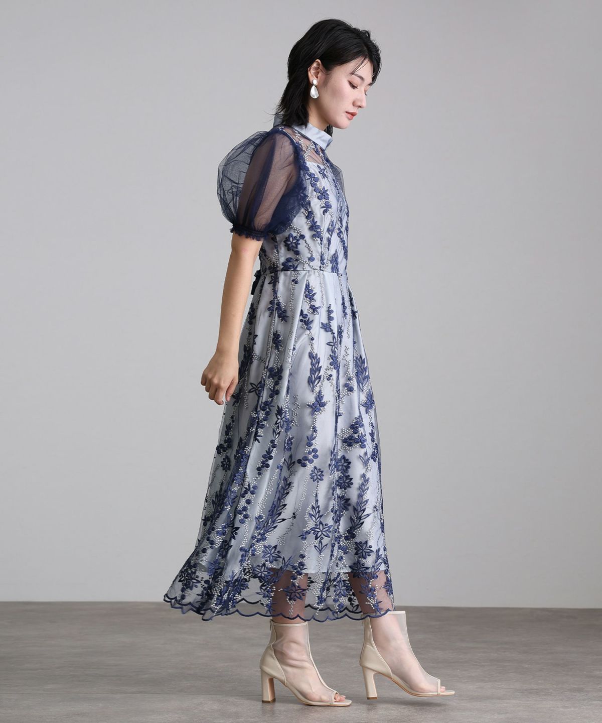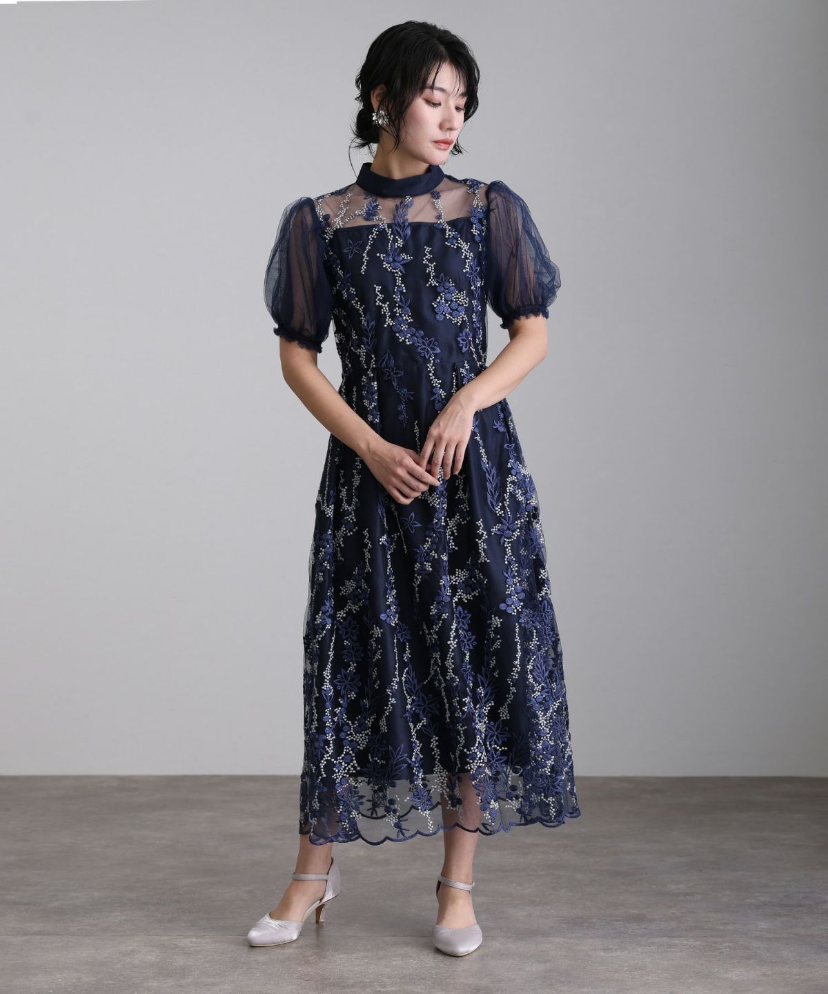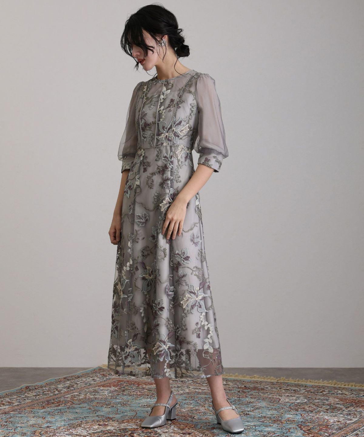 繊細な刺繍レースが施されたエレガントなドレス 総刺繍レースパフスリーブドレス