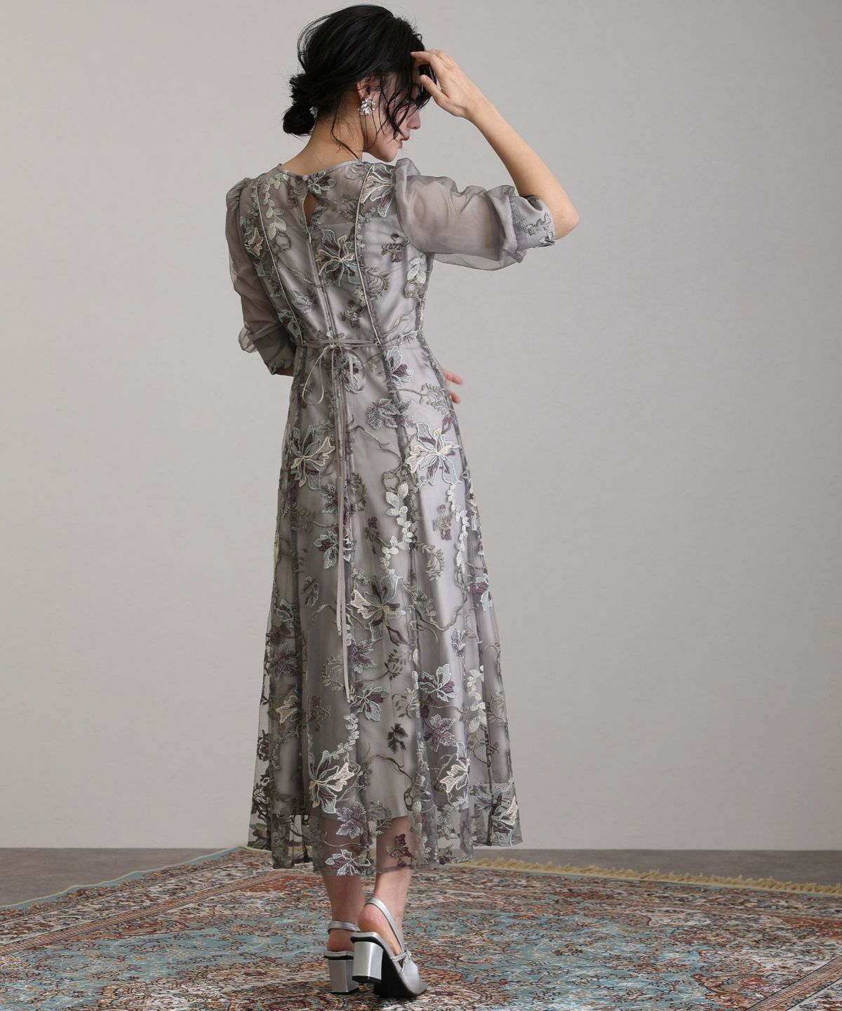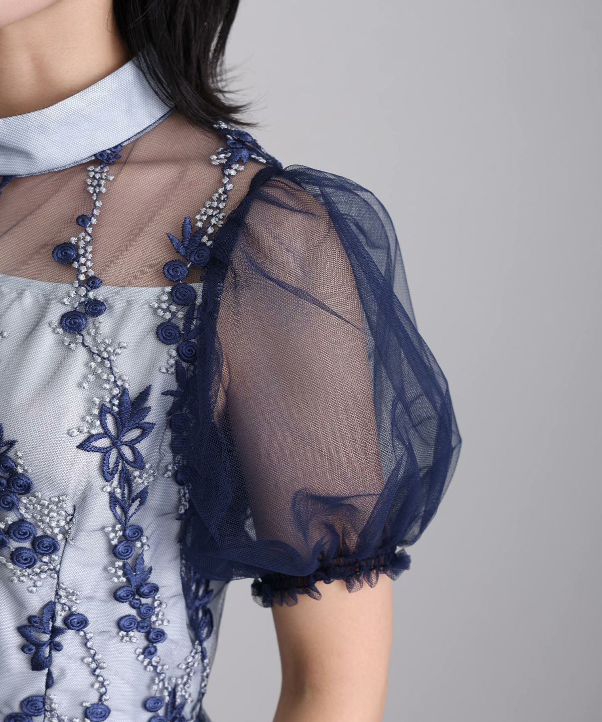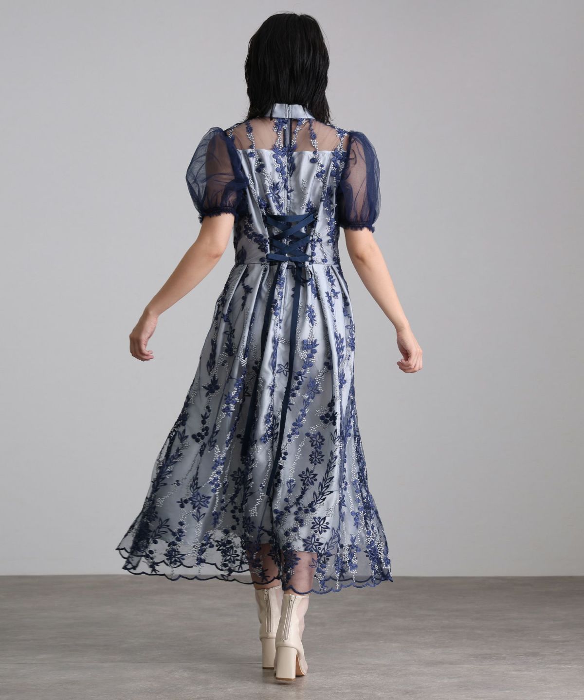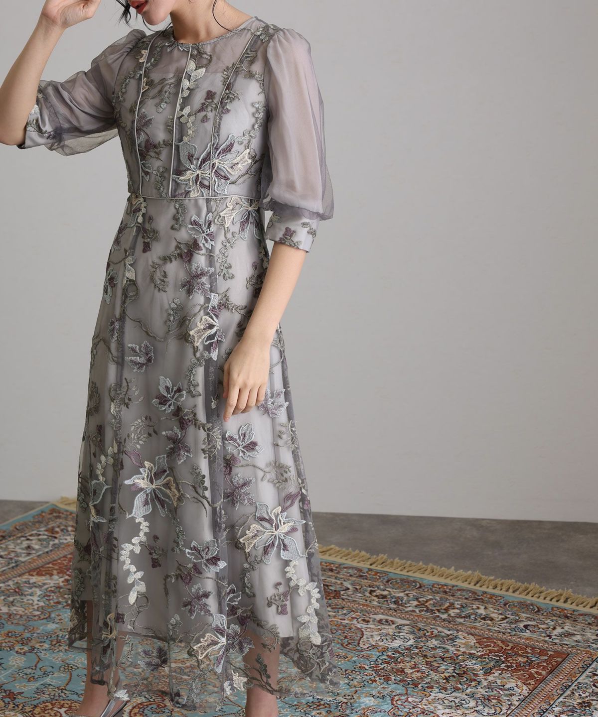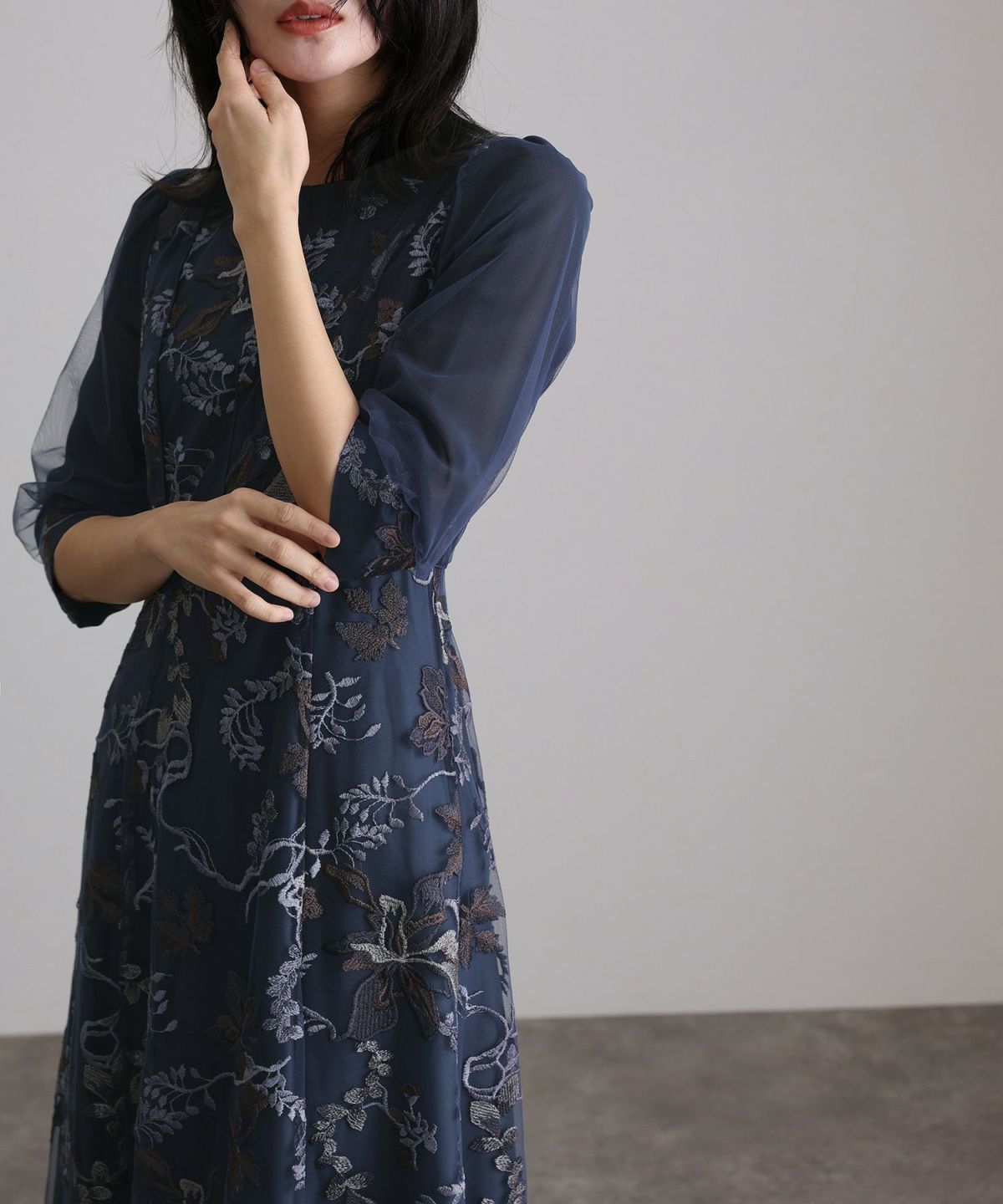 繊細な刺繍レースが施されたエレガントなドレス 総刺繍レースパフスリーブドレス