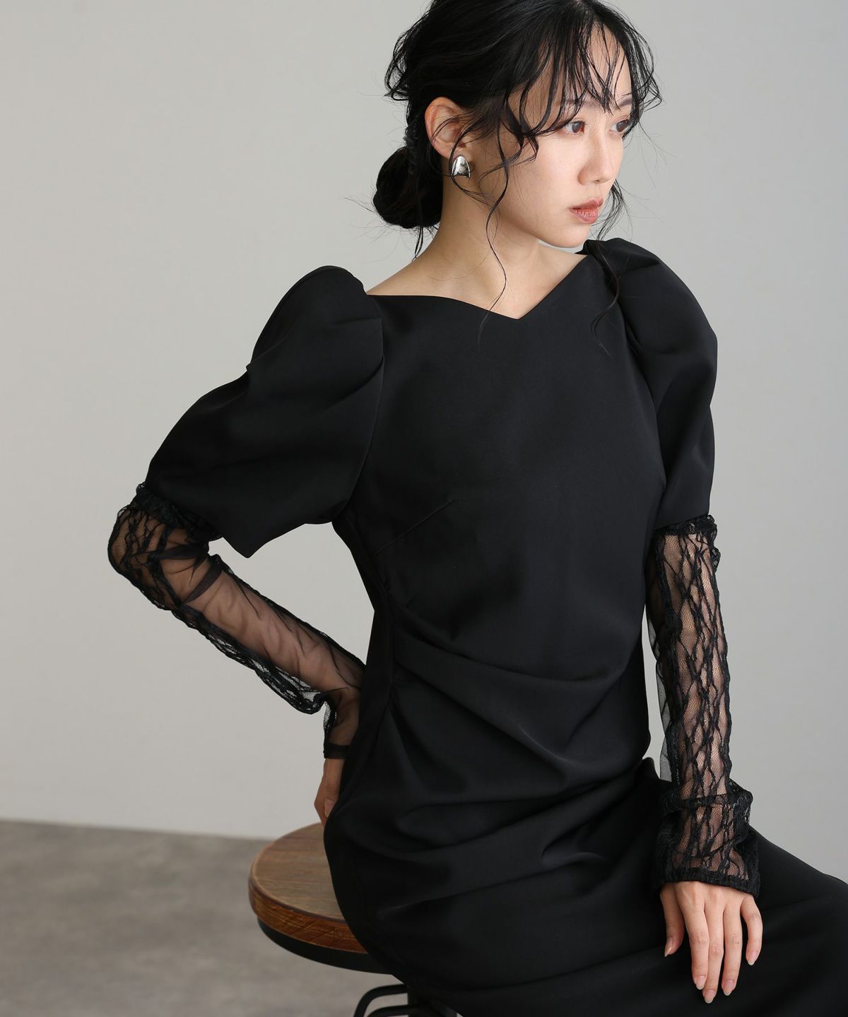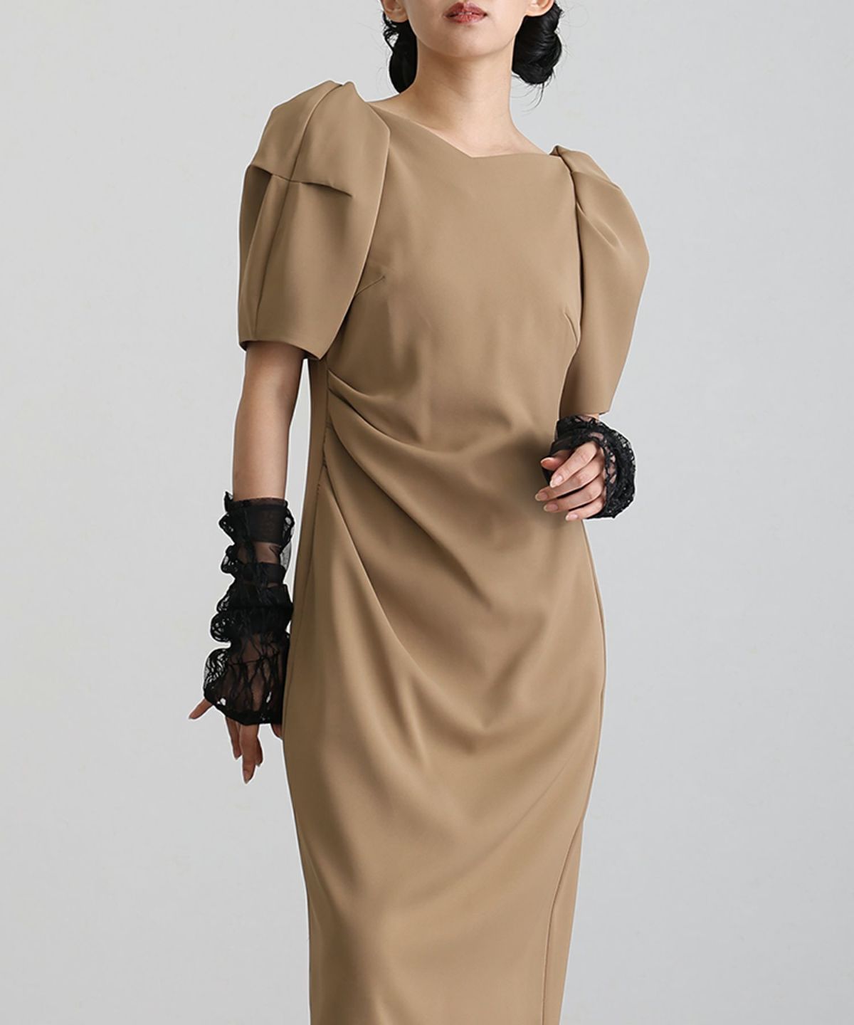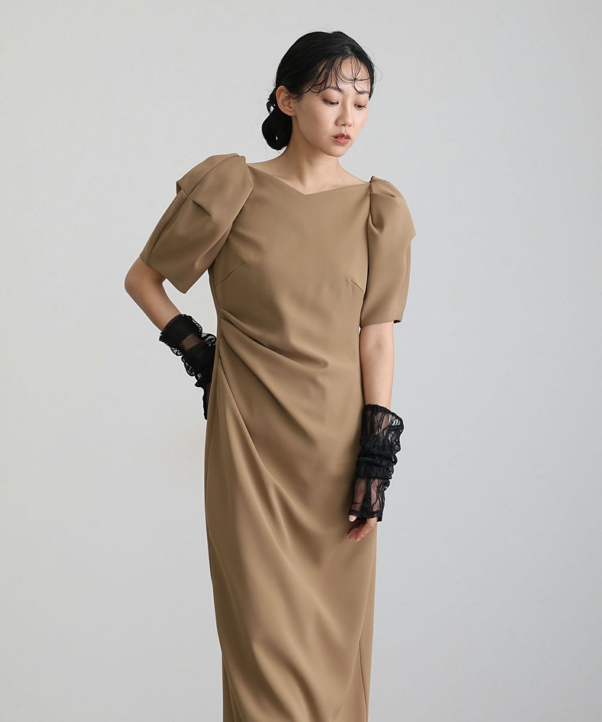 ハートカットと袖口のシャーリングがフェミニンな雰囲気 ハートカットタイトワンピース