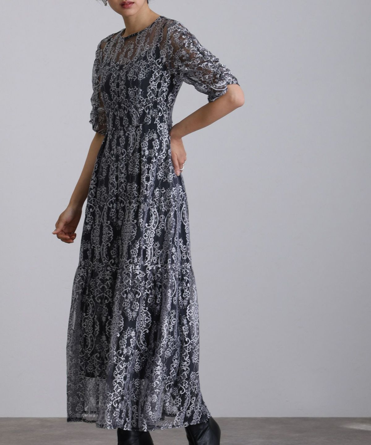 大きめなボタニカル柄のレースが華やか 刺繍レースマーメイドワンピース