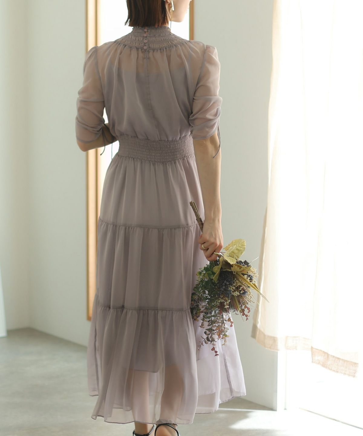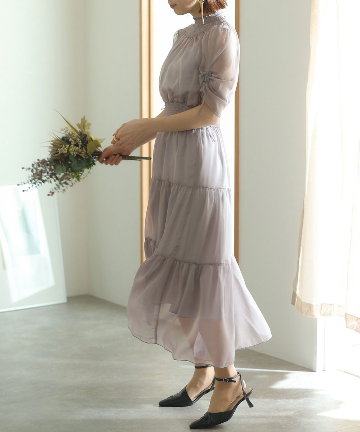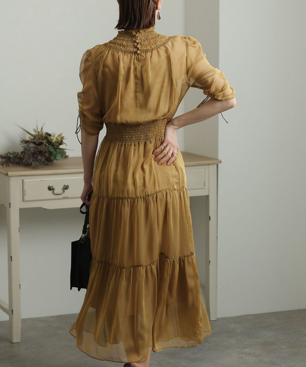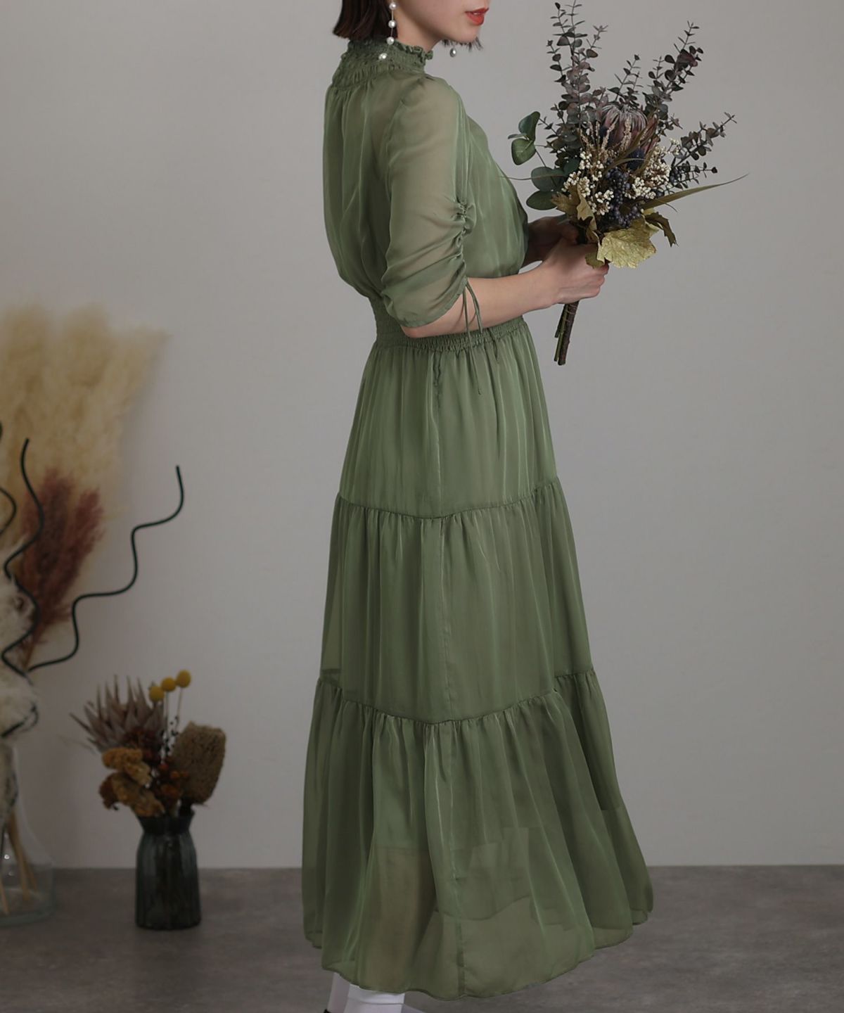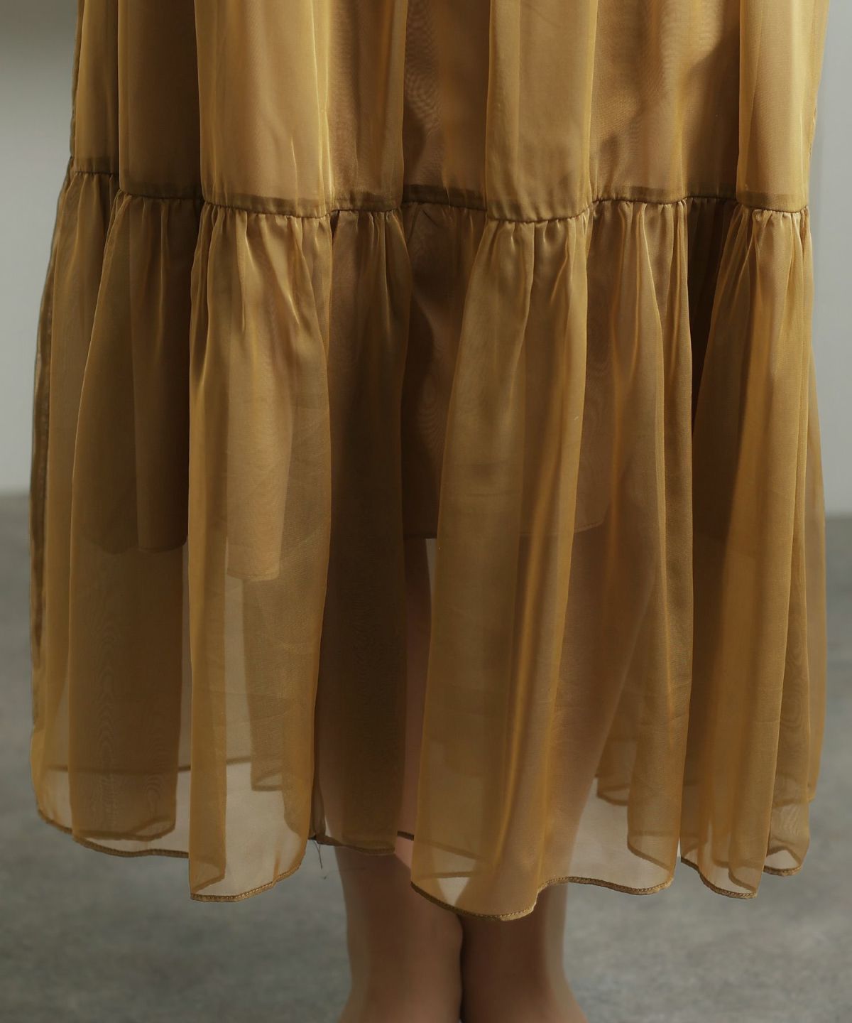 オーロラのようなロマンティックな光沢感 偏光オーガンジーティアードロングワンピース