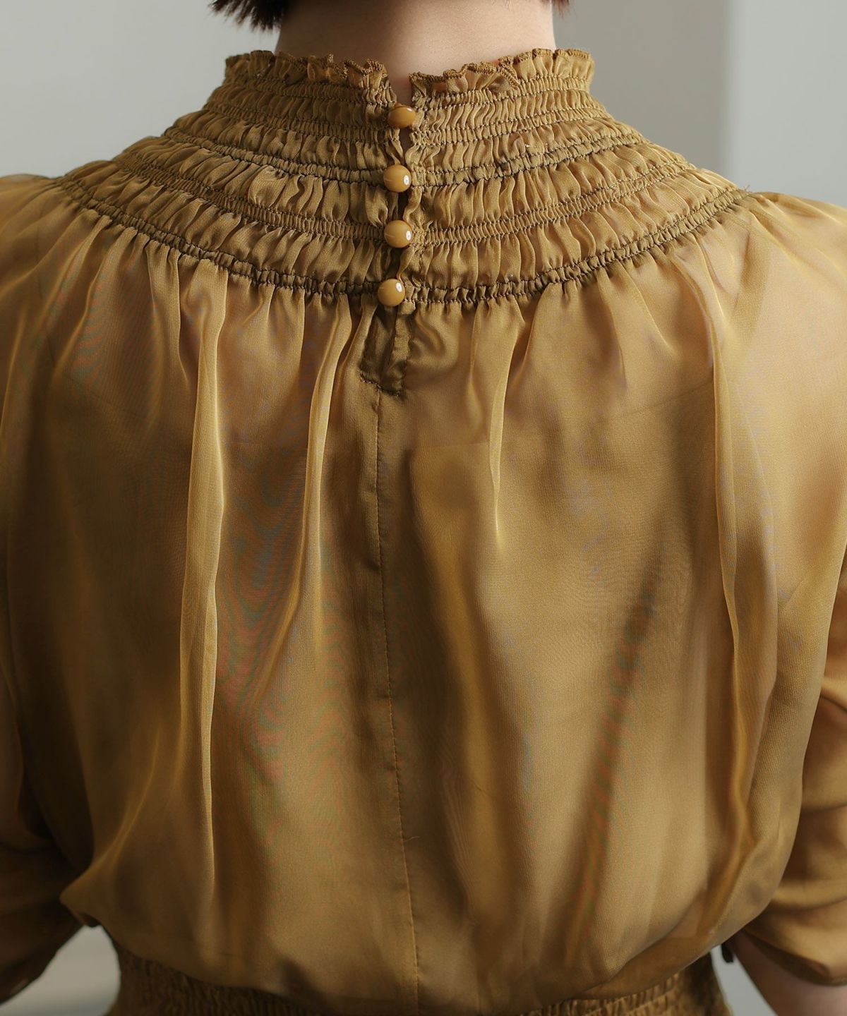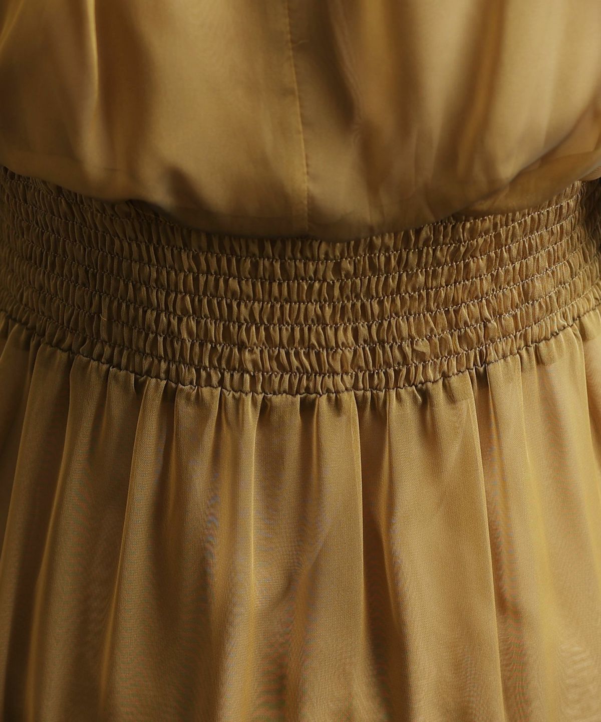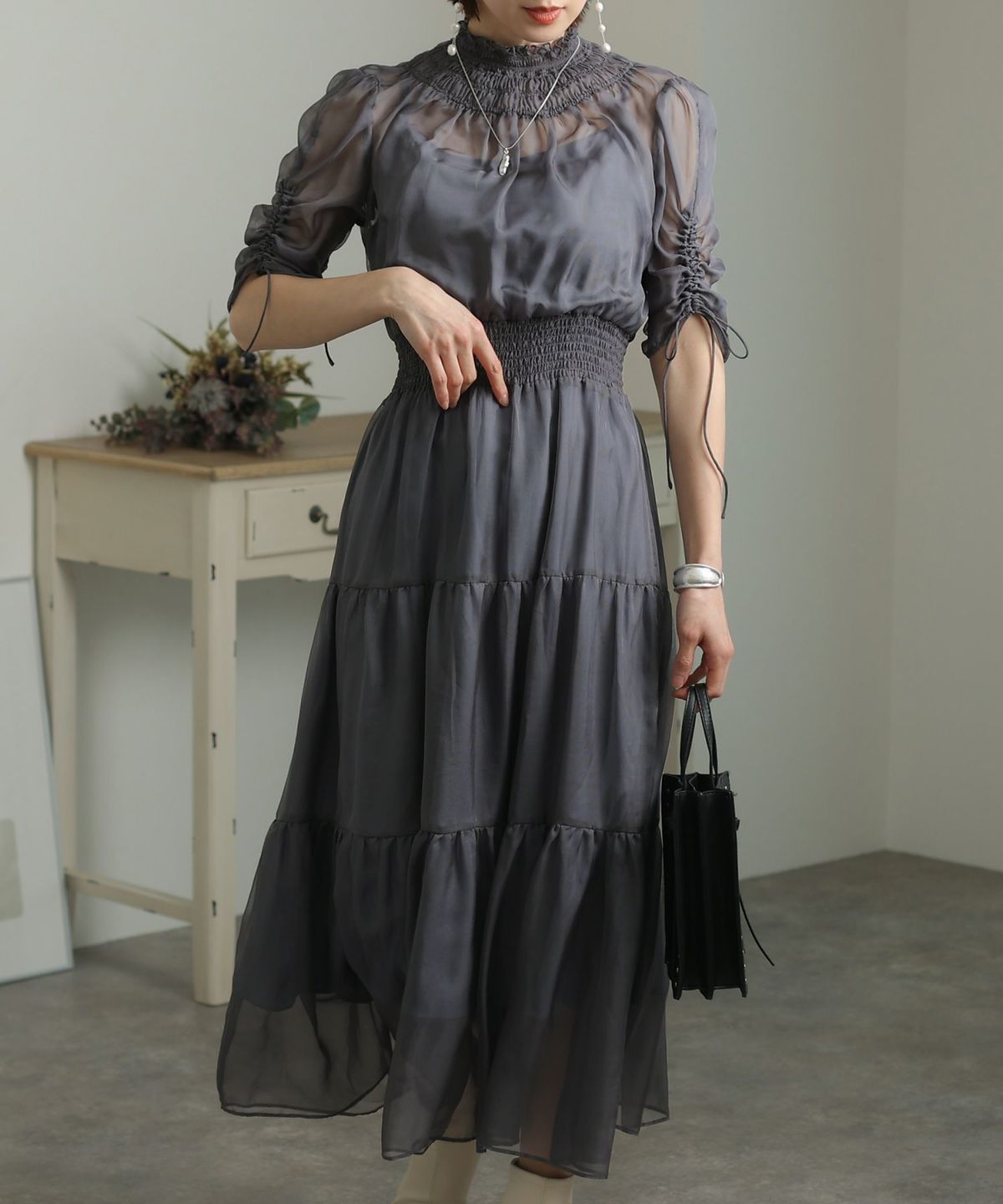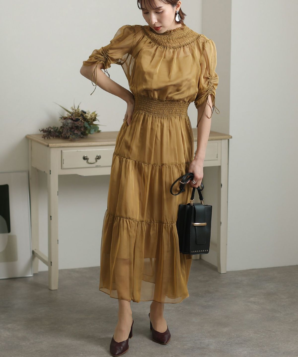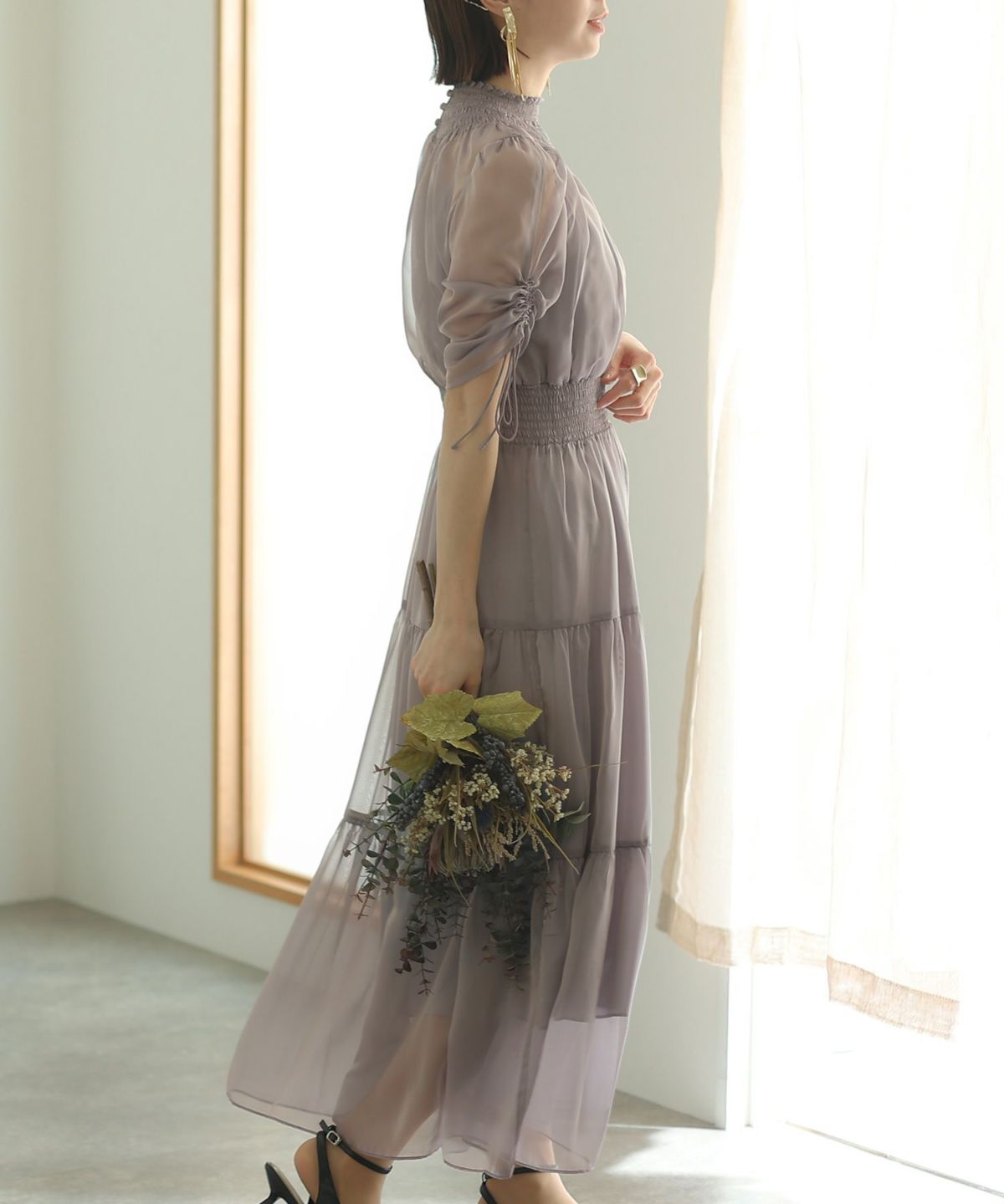 オーロラのようなロマンティックな光沢感 偏光オーガンジーティアードロングワンピース