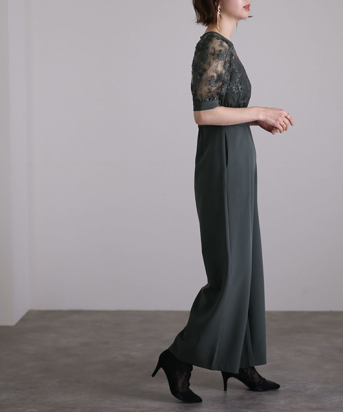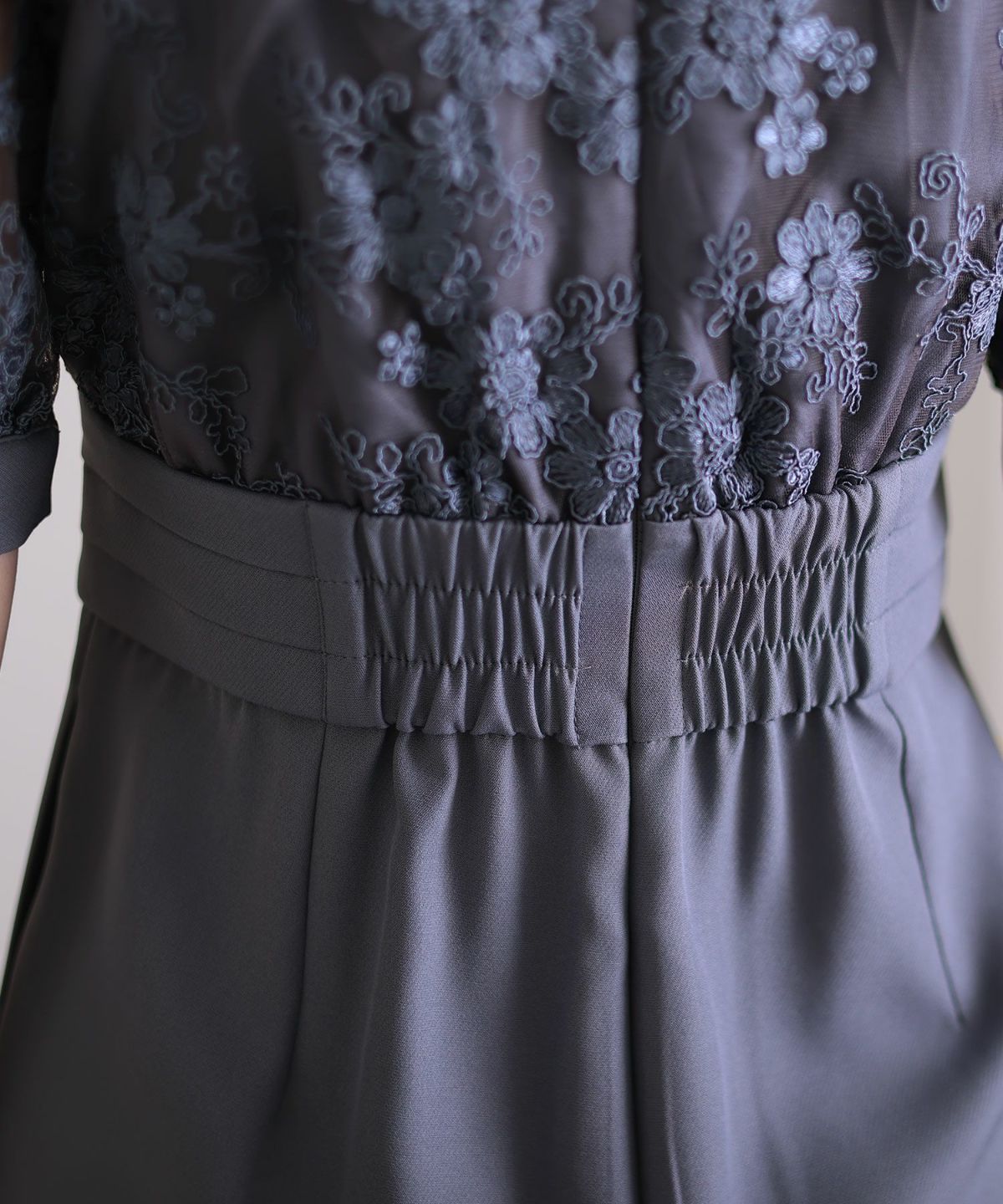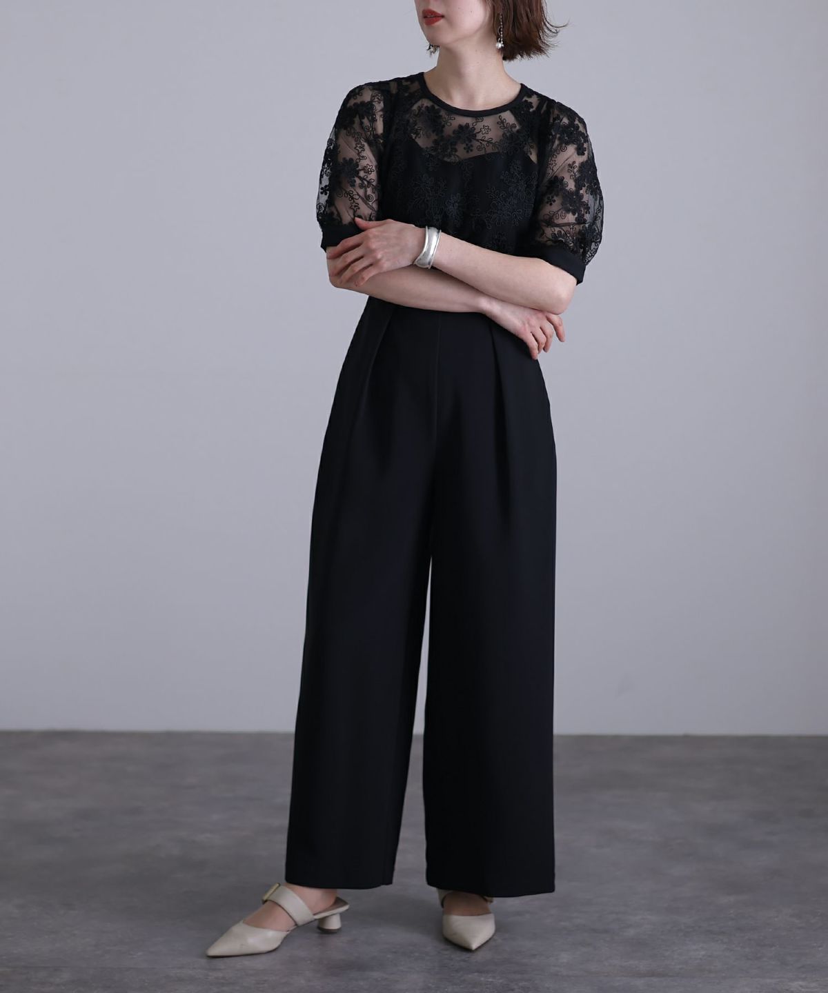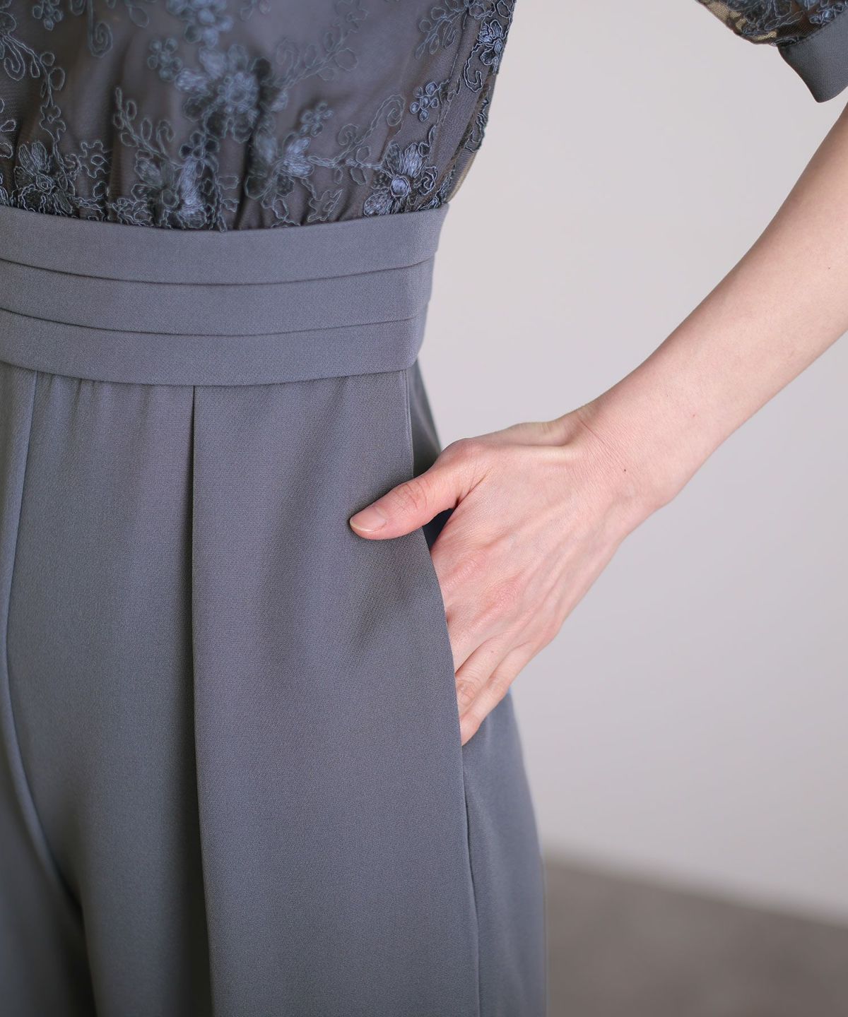 チュール刺繍×ケミカルレース フラワーレース切り替えパンツドレス