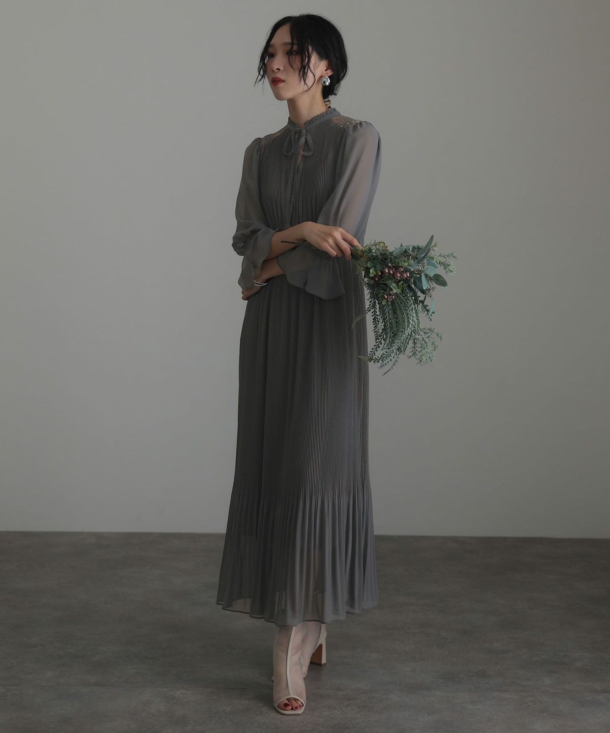 可愛い×シック ショルダーレース切り替えシフォンプリーツワンピース