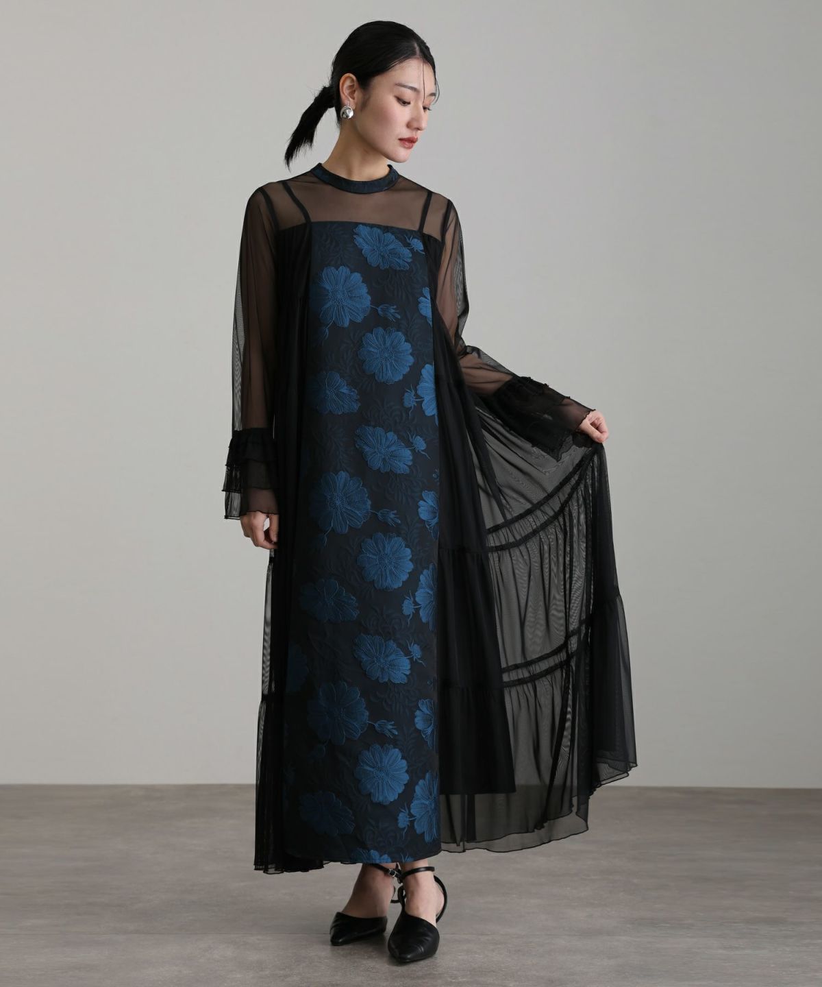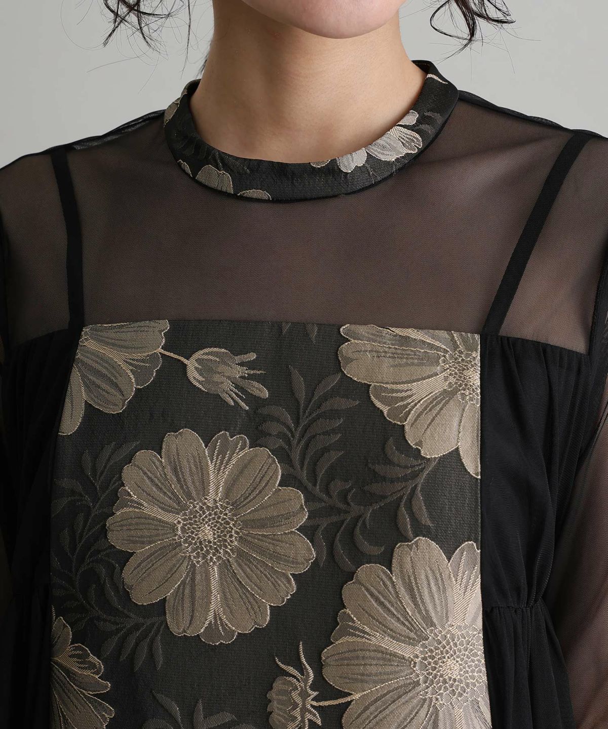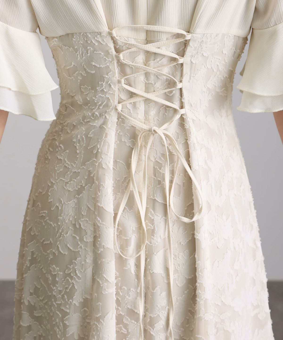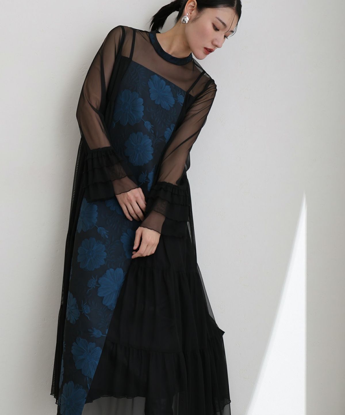 ジャガード素材×楊柳シフォンミックス ジャガードフレアドレス