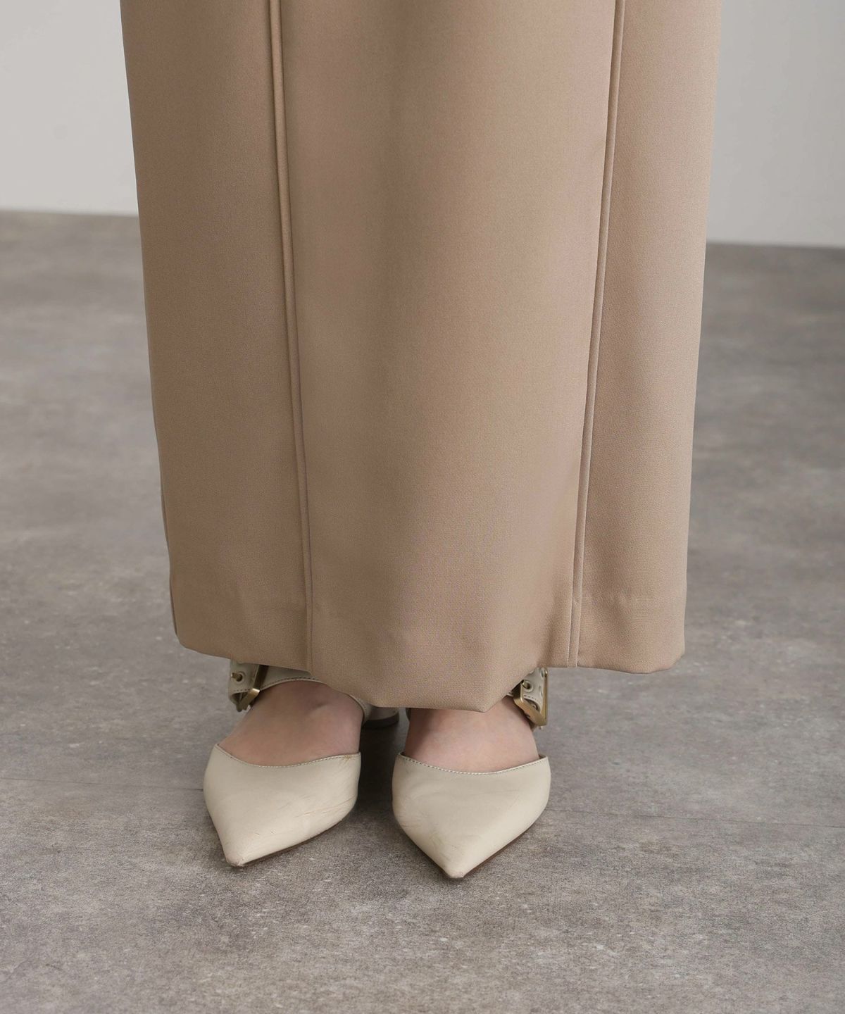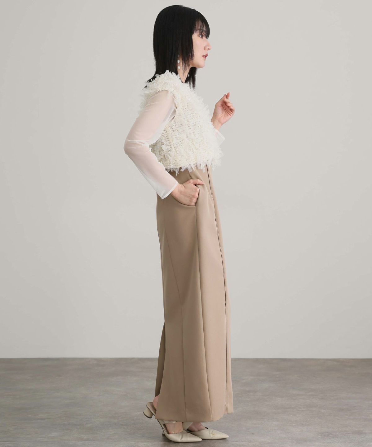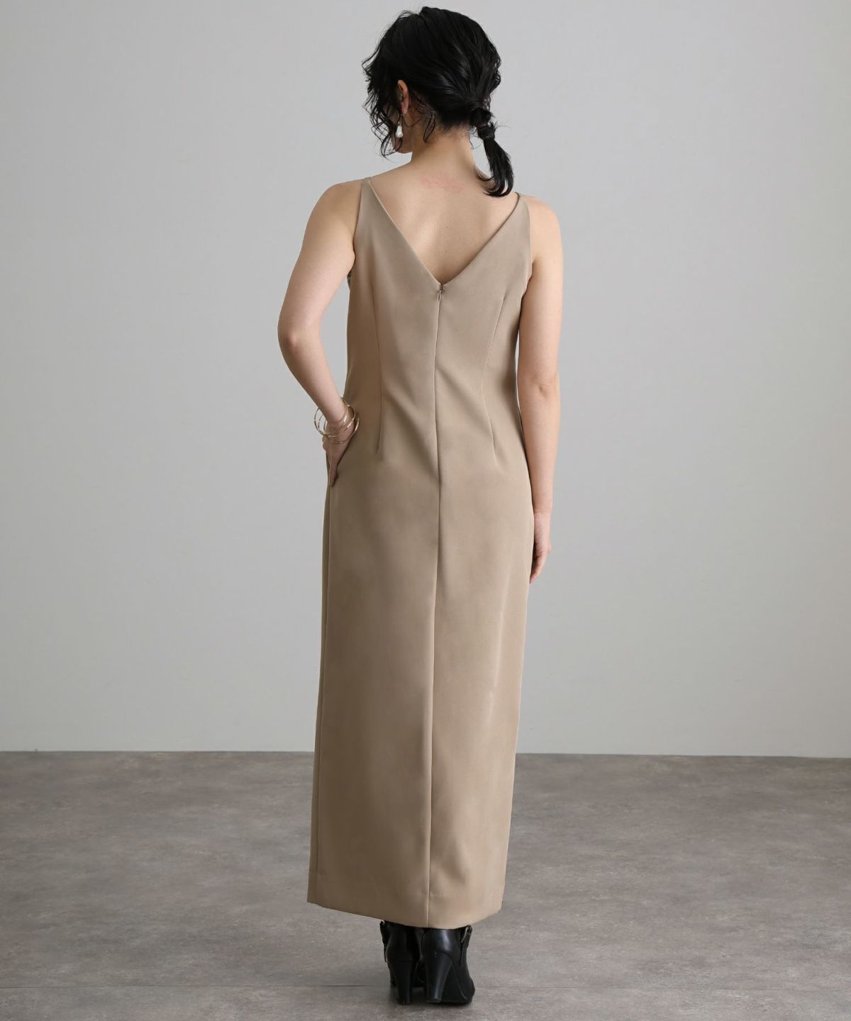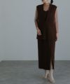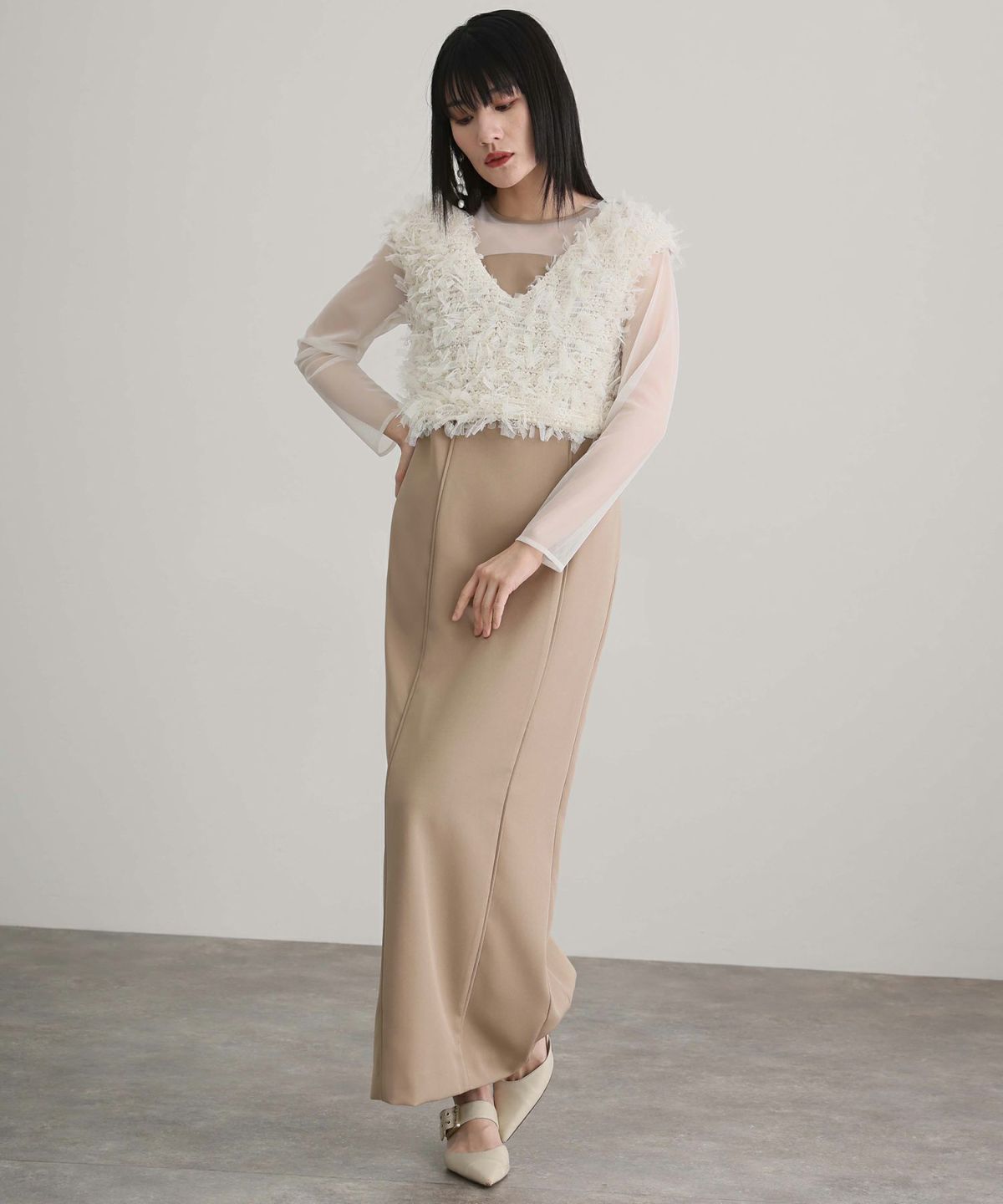 スカートのスリットによるさり気ない肌見せでこなれ感を演出 2wayジレ付きワンピース