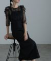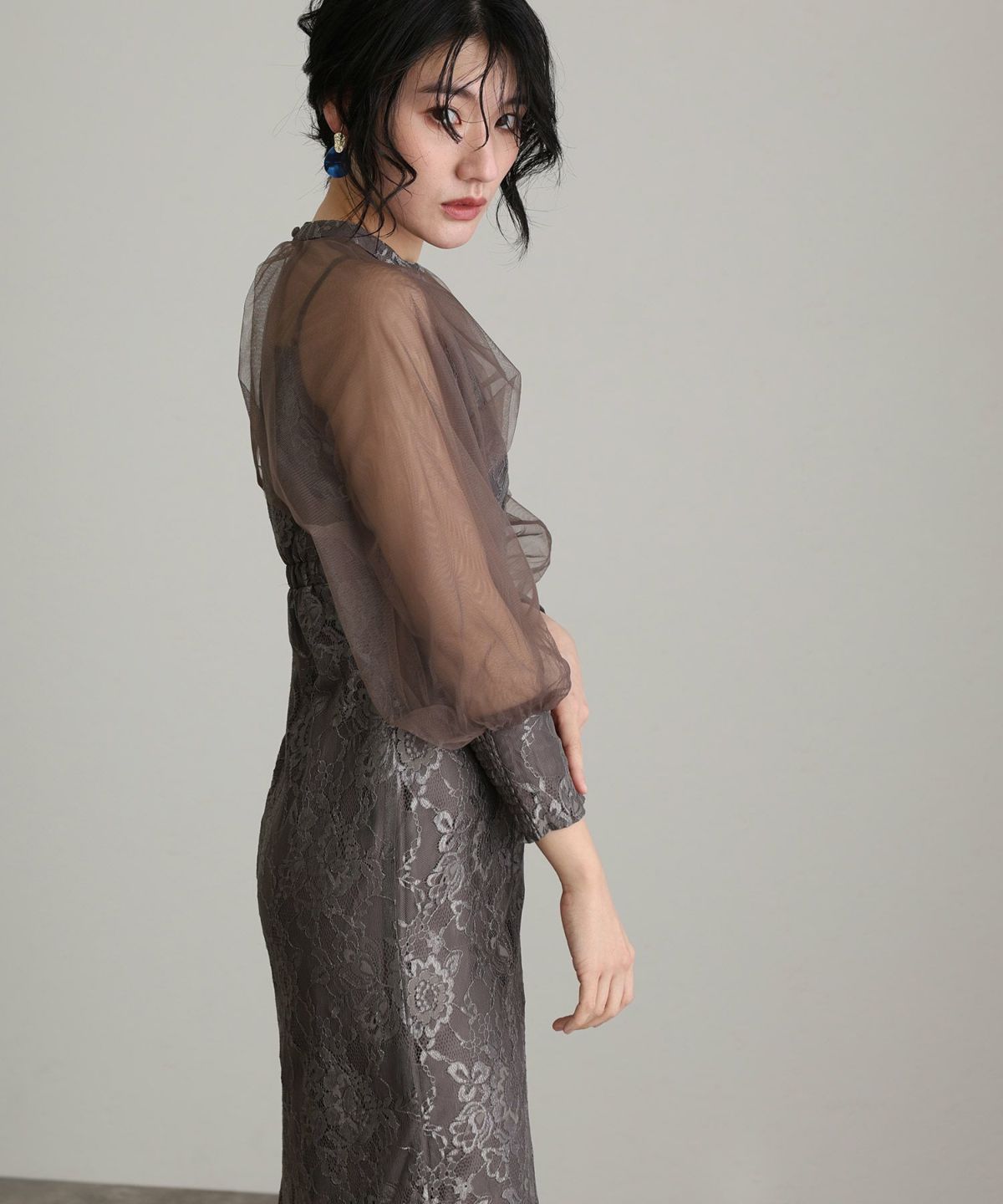 袖の程よい透け感で上品な印象に レースハイウエスト切替えマーメイドワンピース