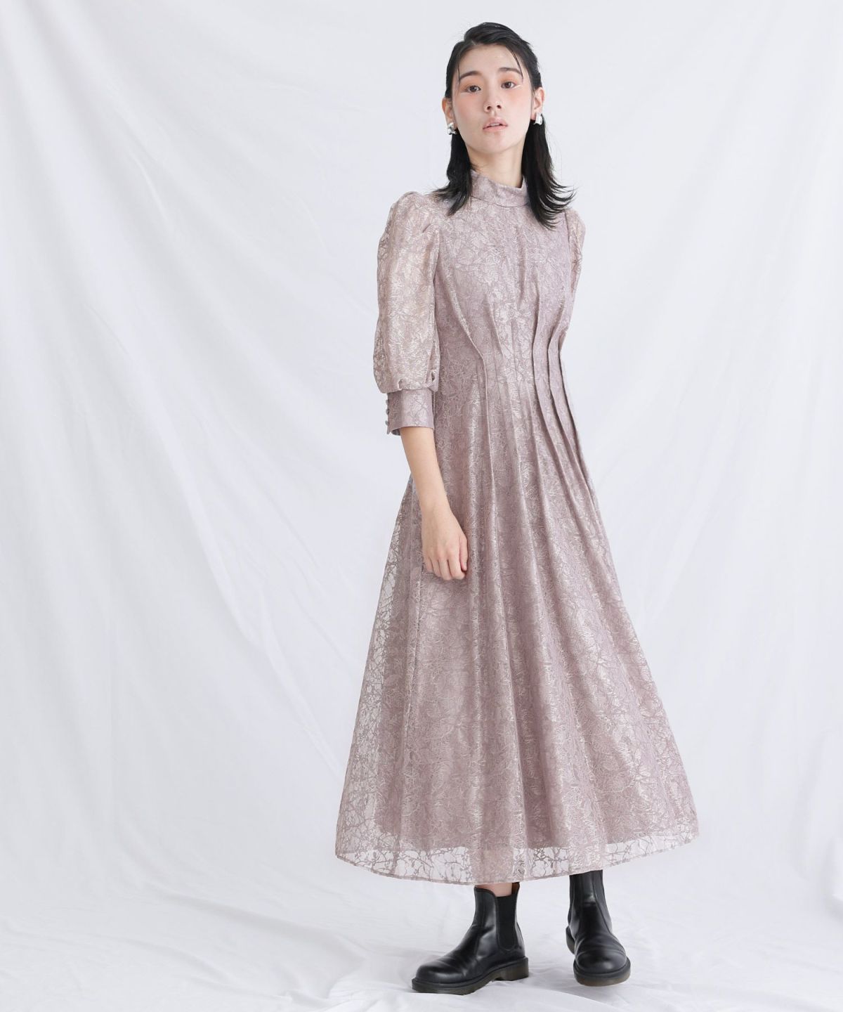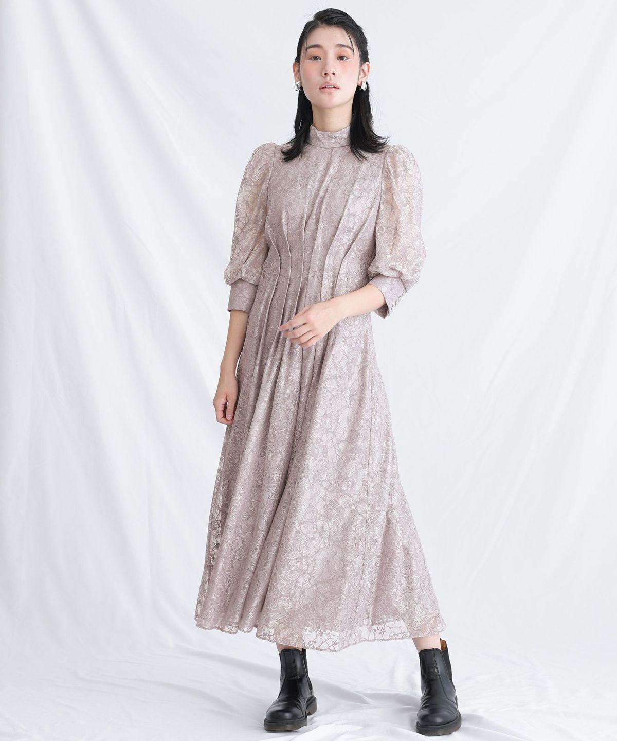 無地の生地にレースが施されたフェミニンなドレス ハイネック切替レースドレス