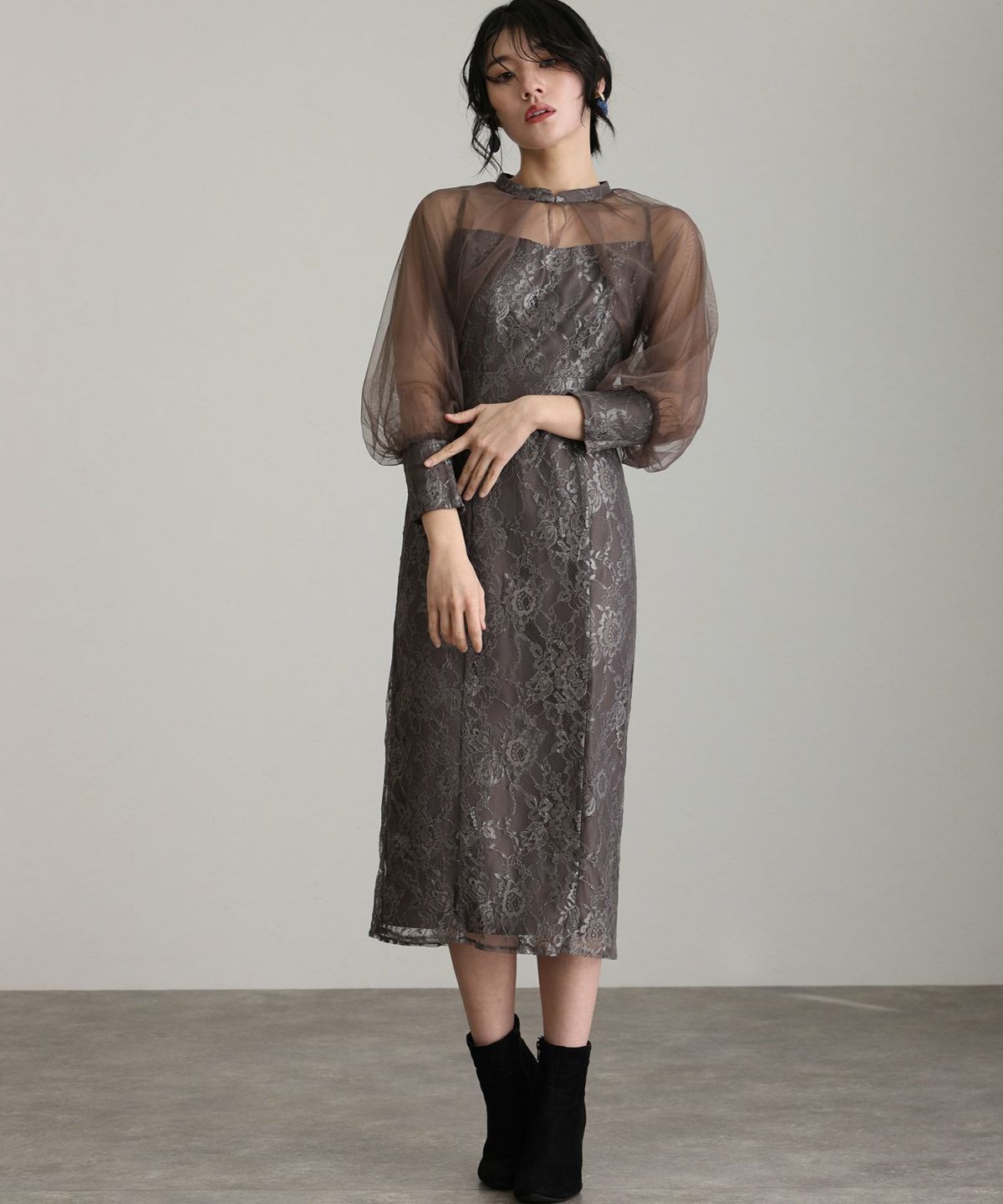 オーガンジーの透け感が上品 オーガンジースリーブ切替レースワンピース