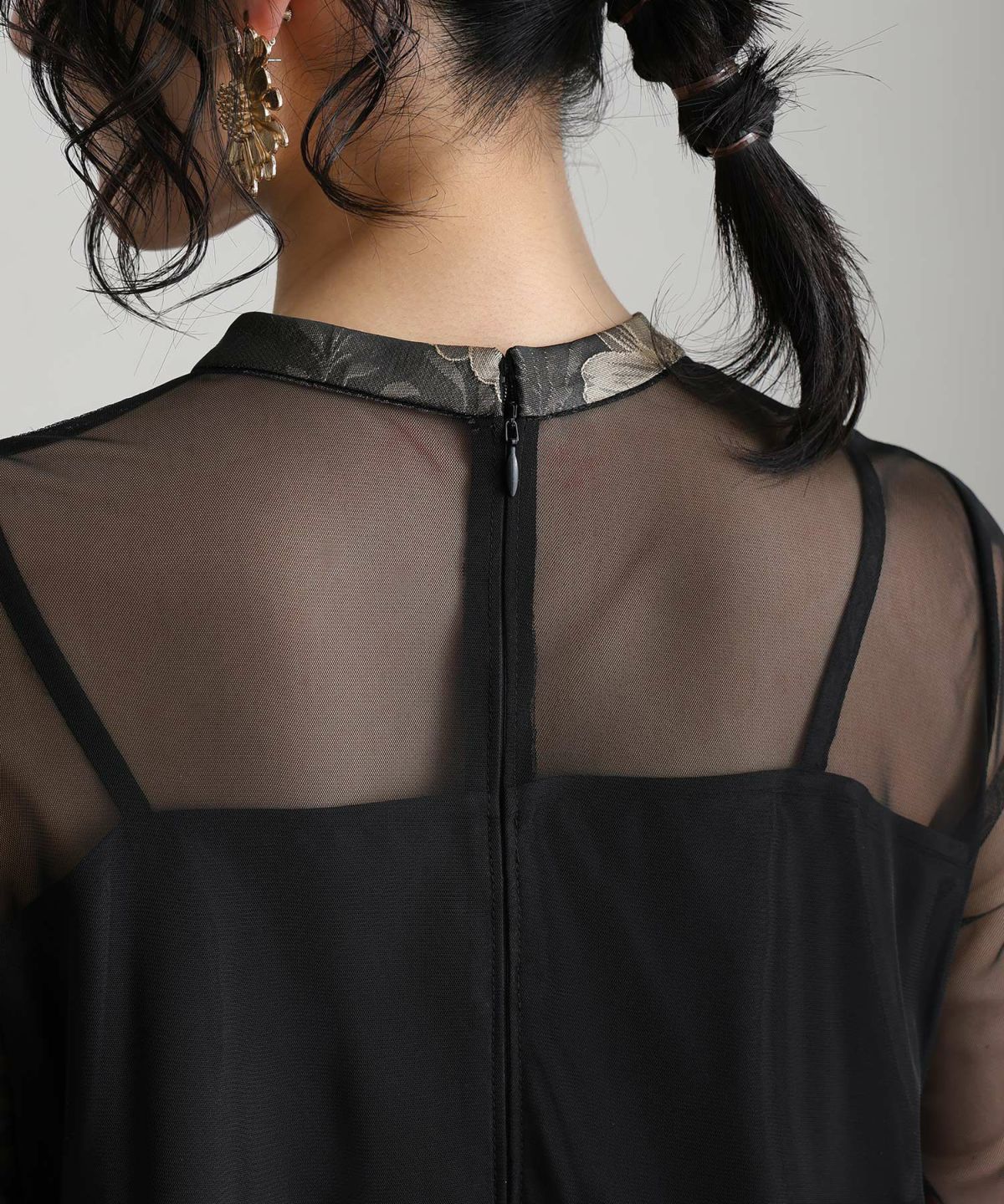 スタンドネックの首元で洗練された印象に チュール×刺繍タイトワンピース