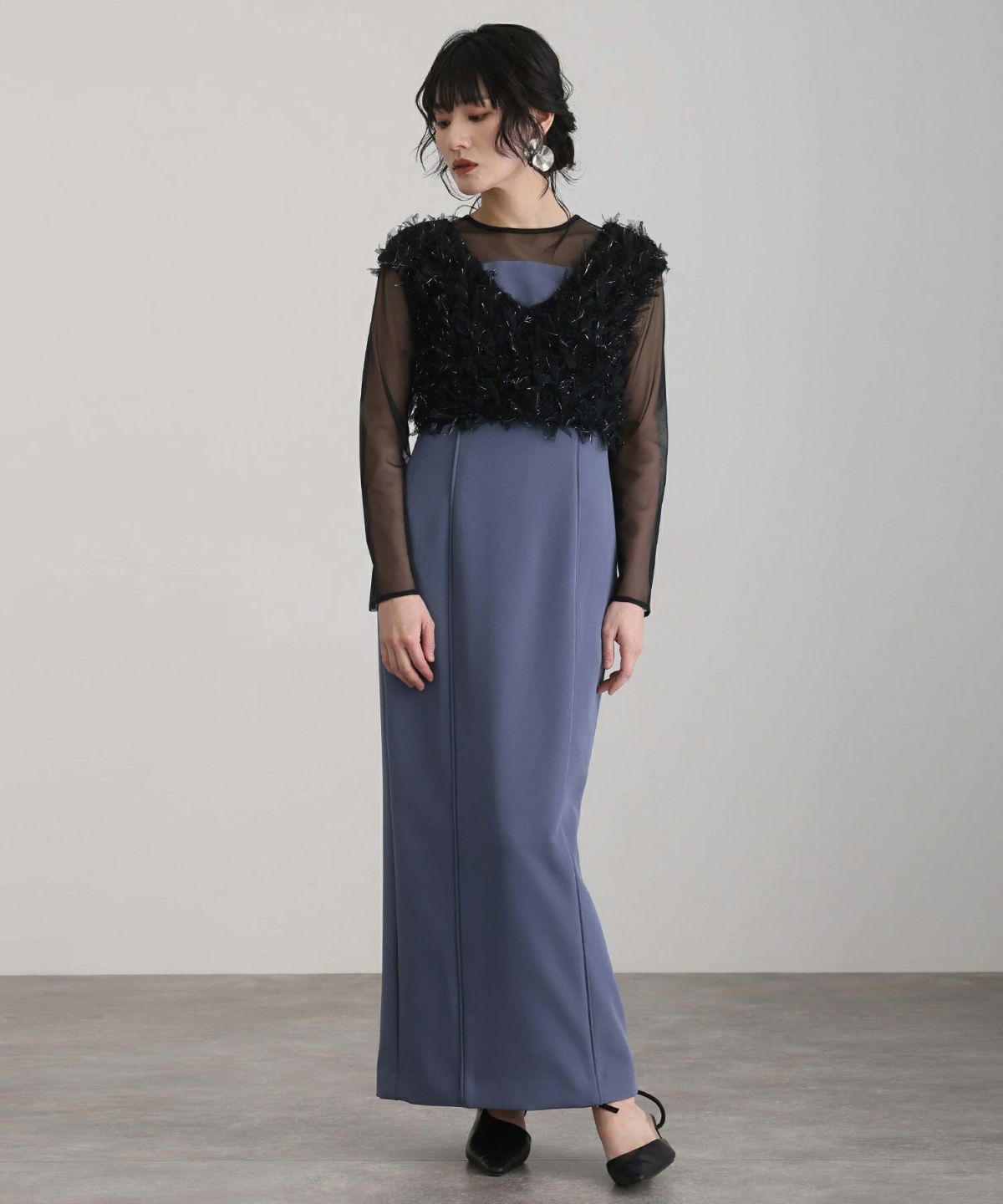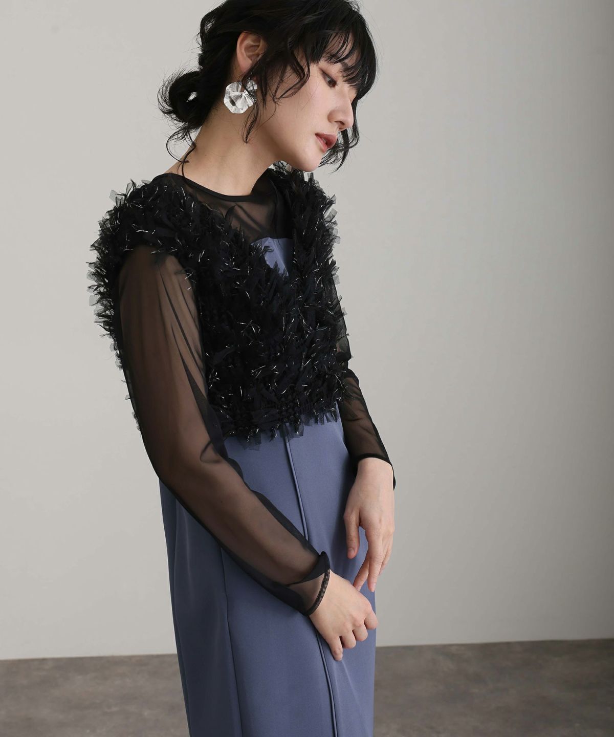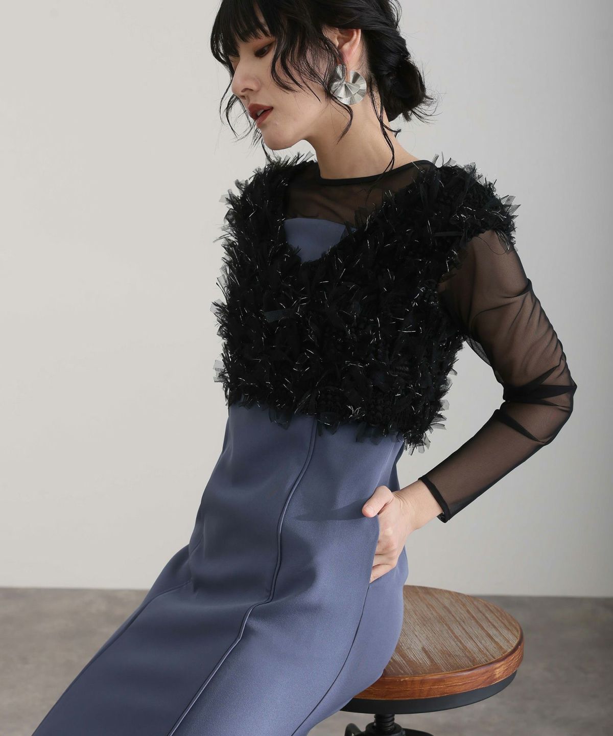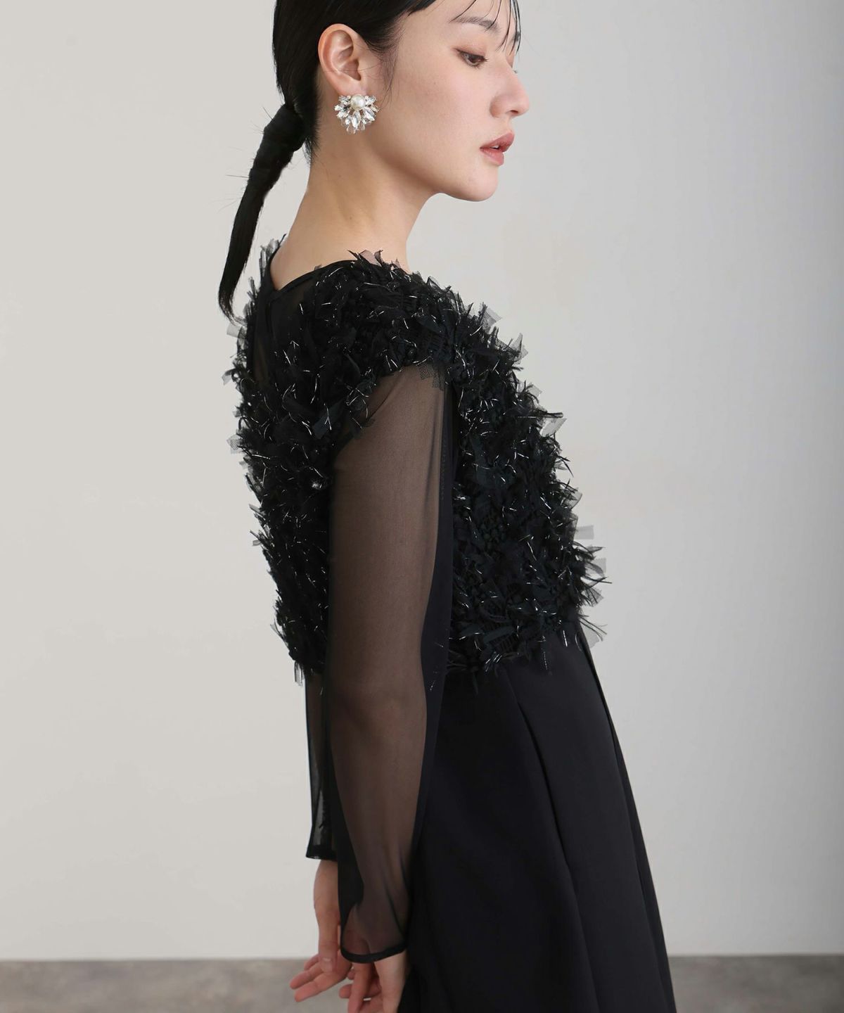 ラメ糸の上品な煌めき フェザーフラワーレイヤードドレス