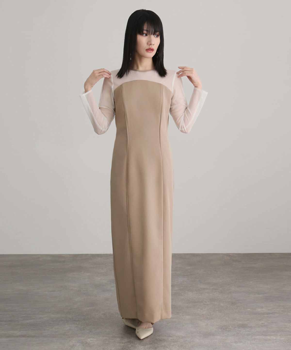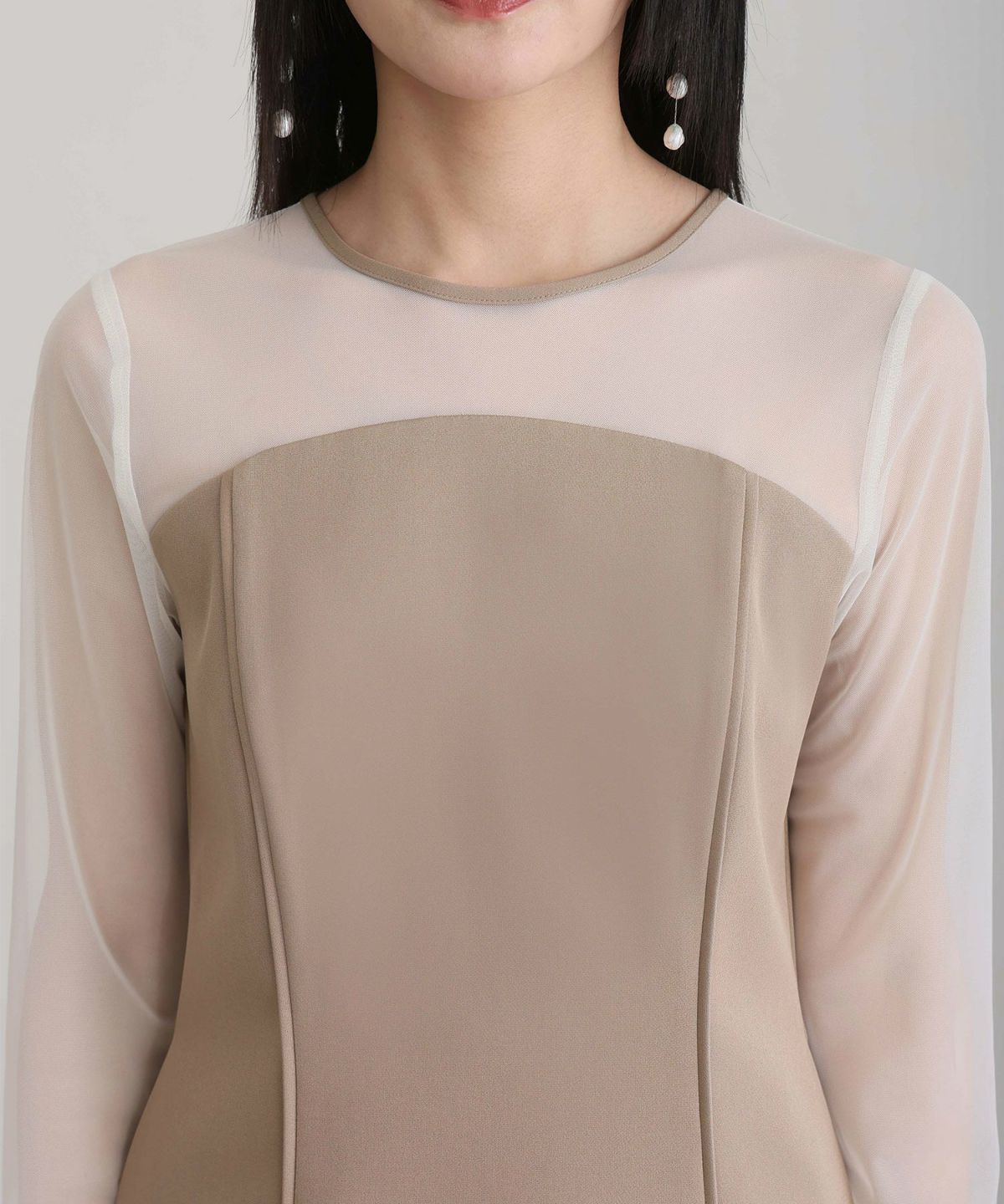 デコルテのシアー感が上品 袖切り替えタイトワンピース