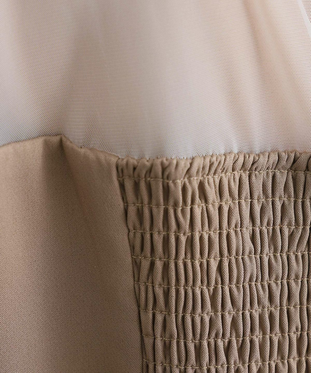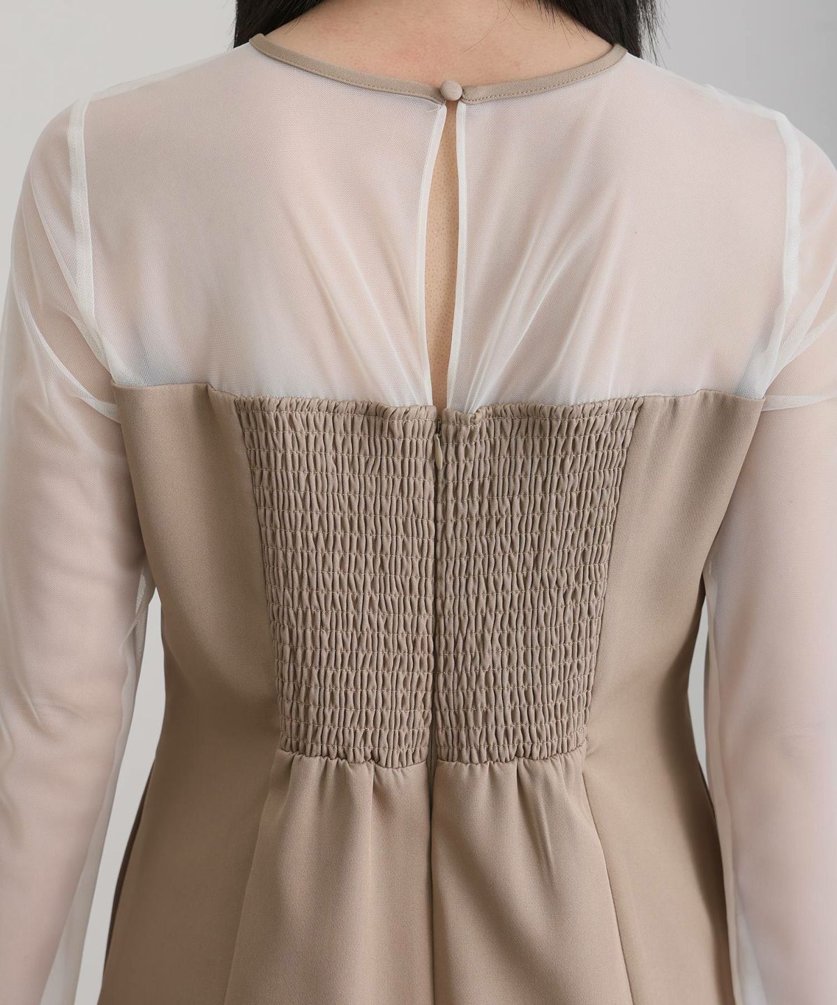 袖口のシャーリングで華奢見え効果も レース×オーガンジー切り替えワンピース