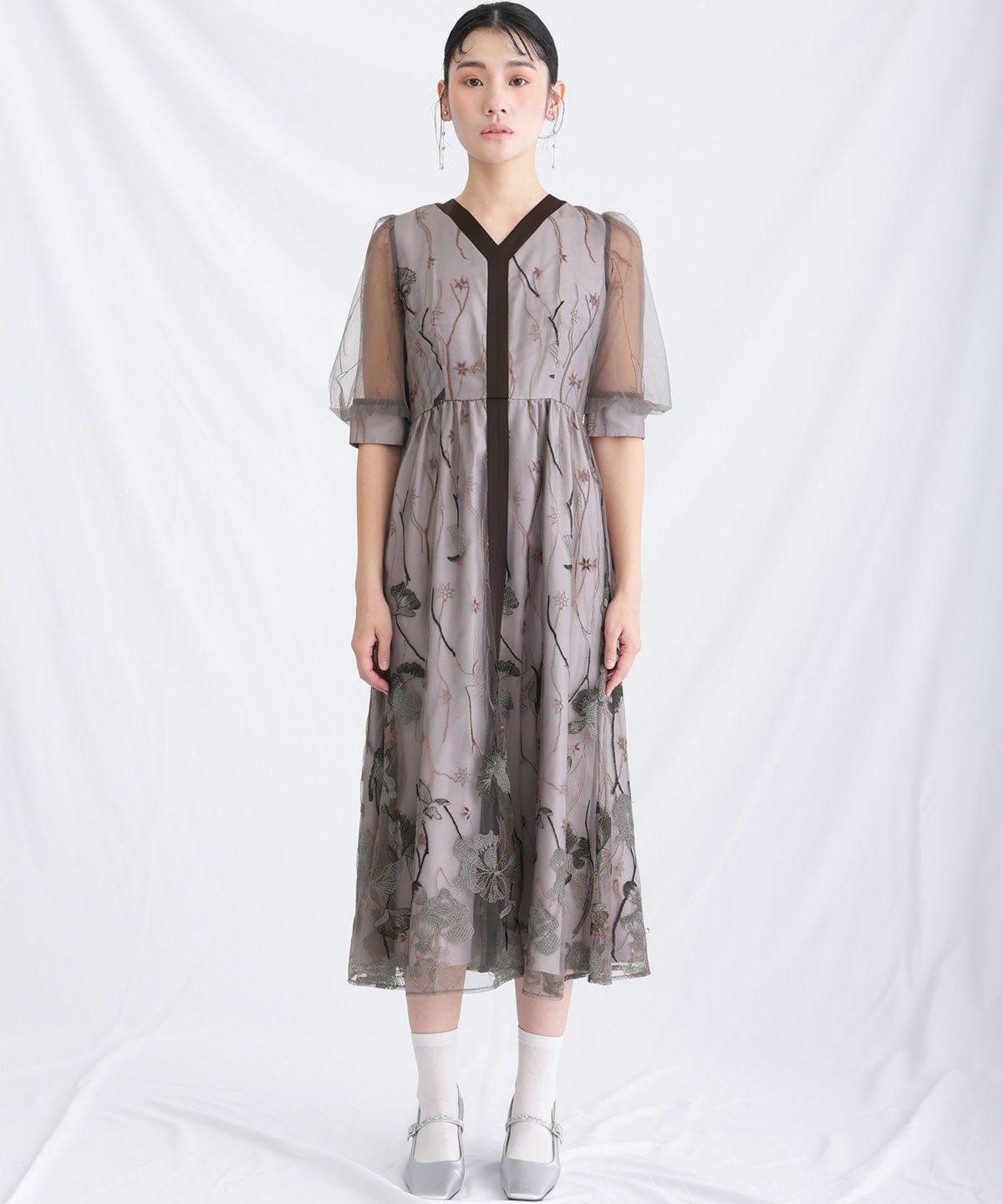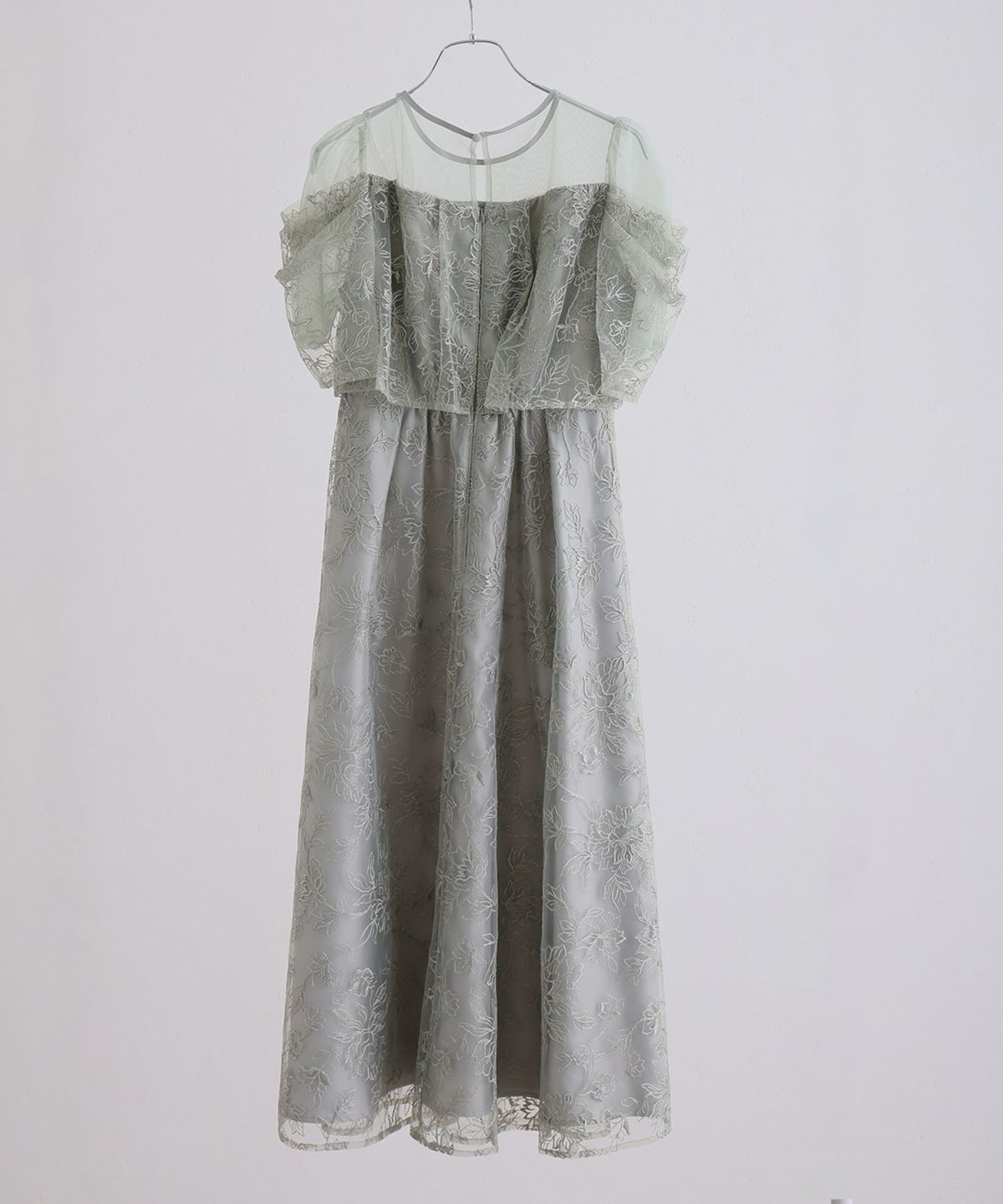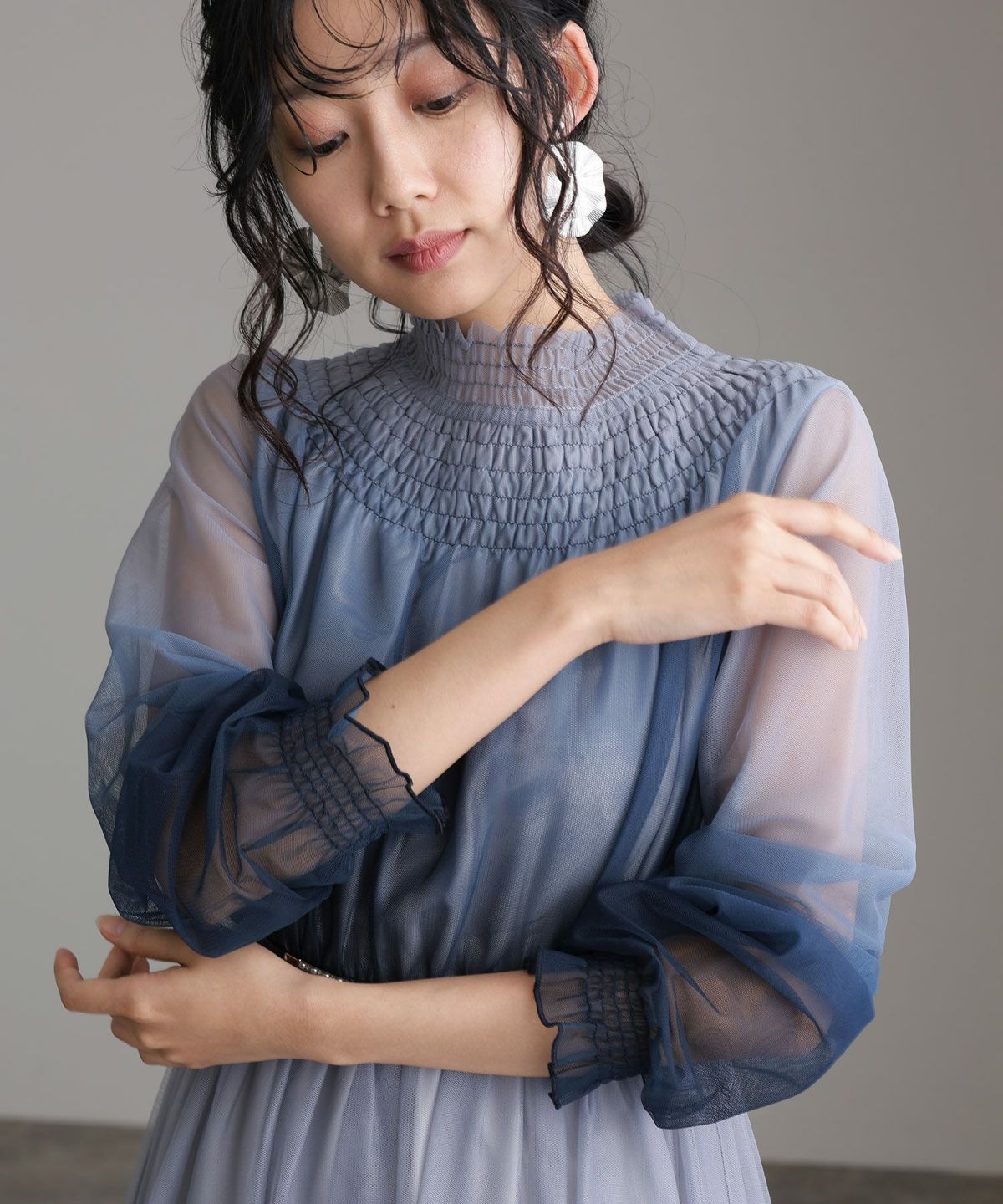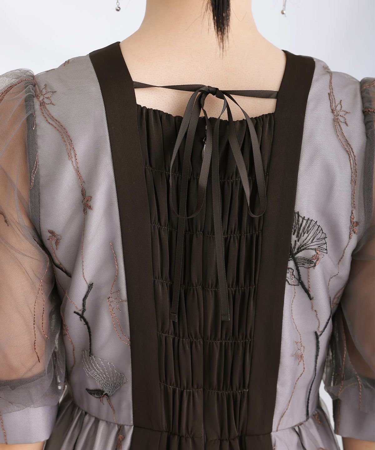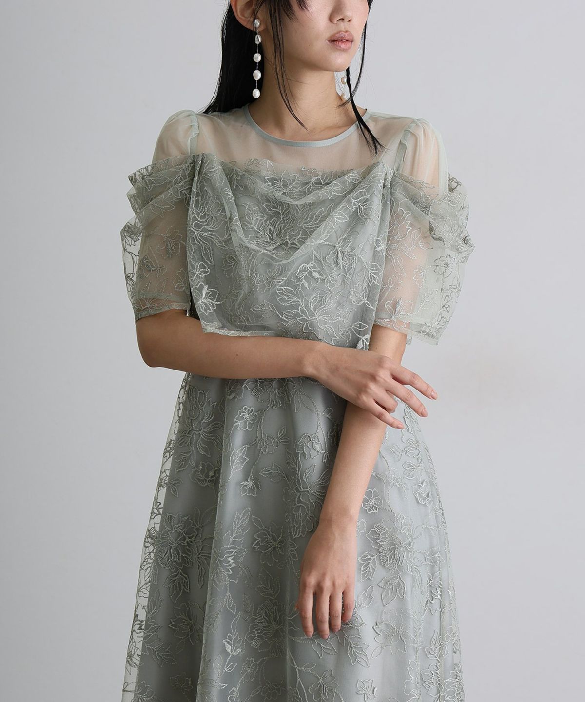 ギャザースリーブが大人可愛い 刺繍チュールシアーワンピース