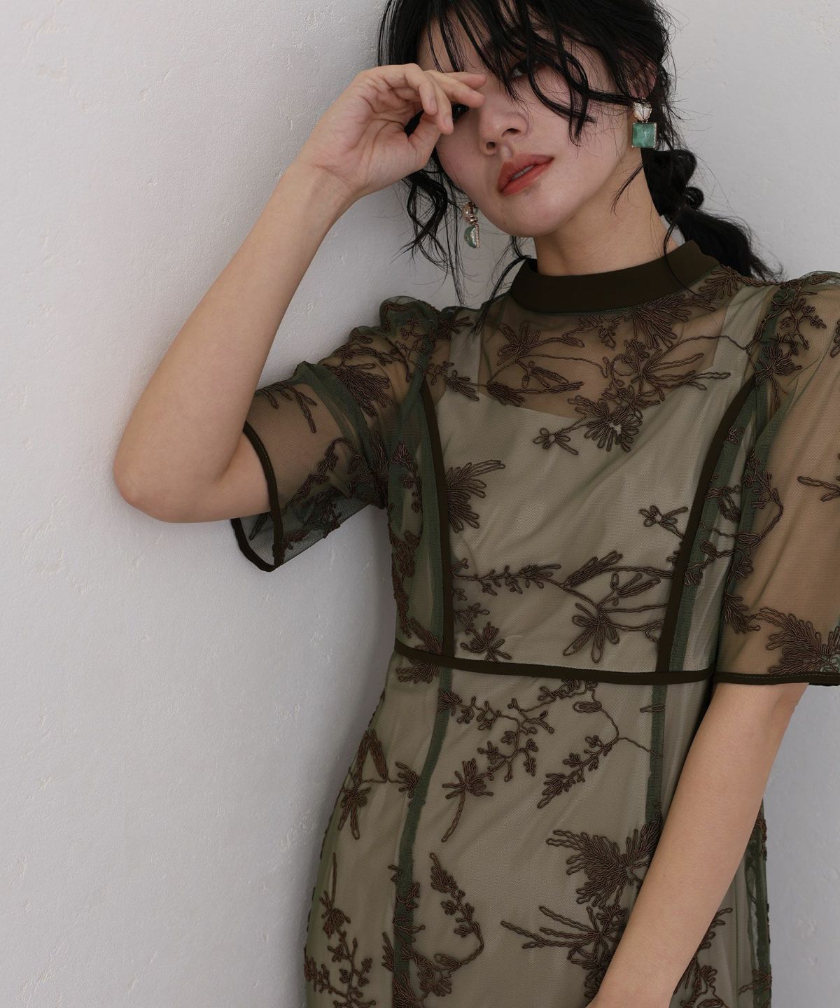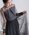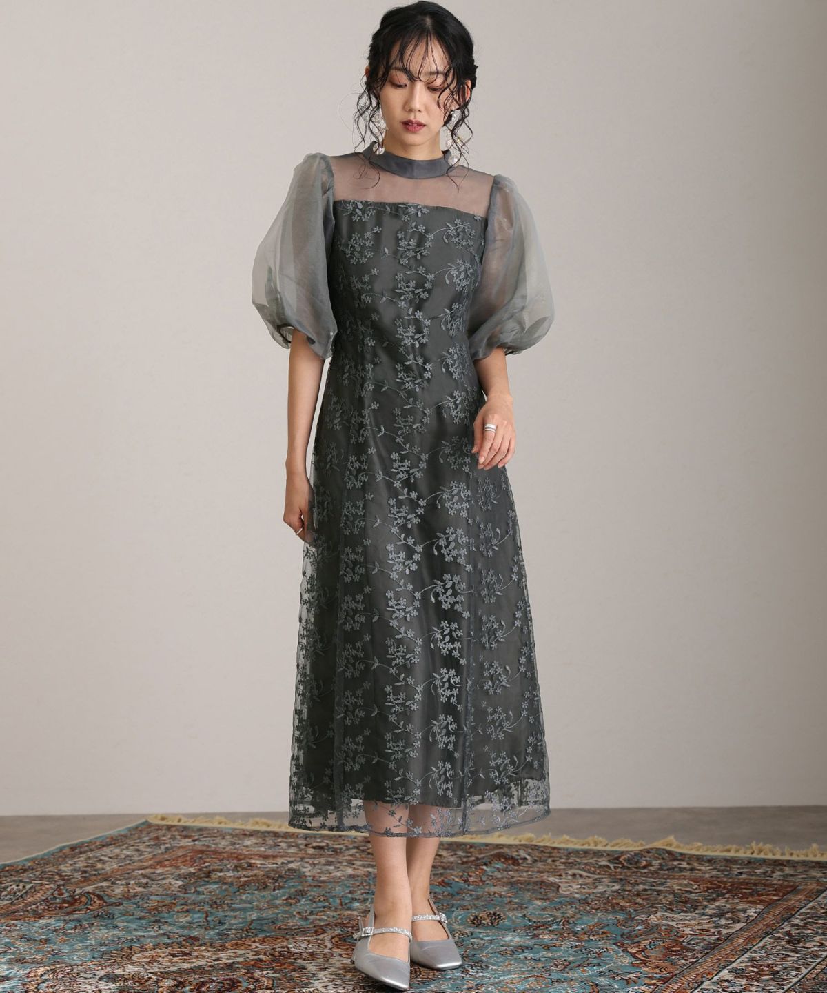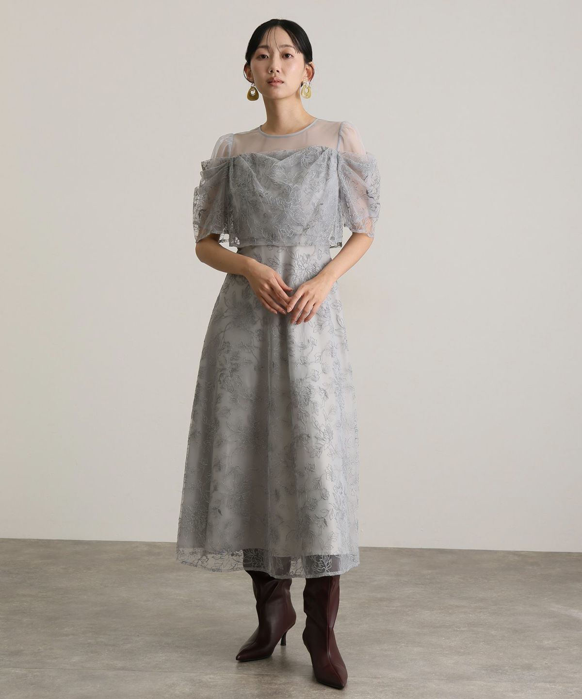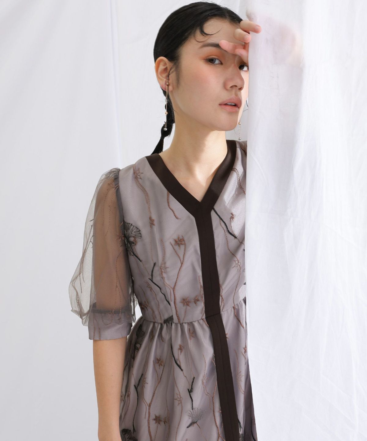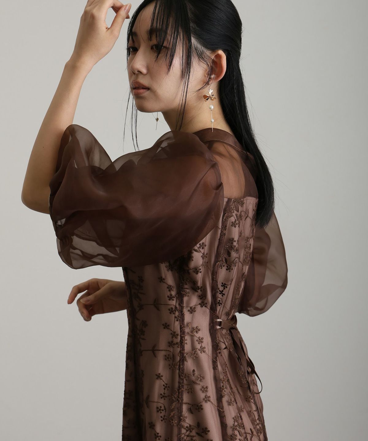 ギャザースリーブが大人可愛い 刺繍チュールシアーワンピース