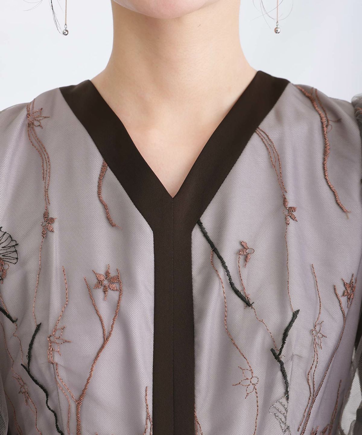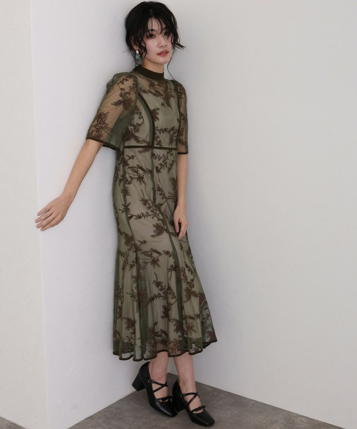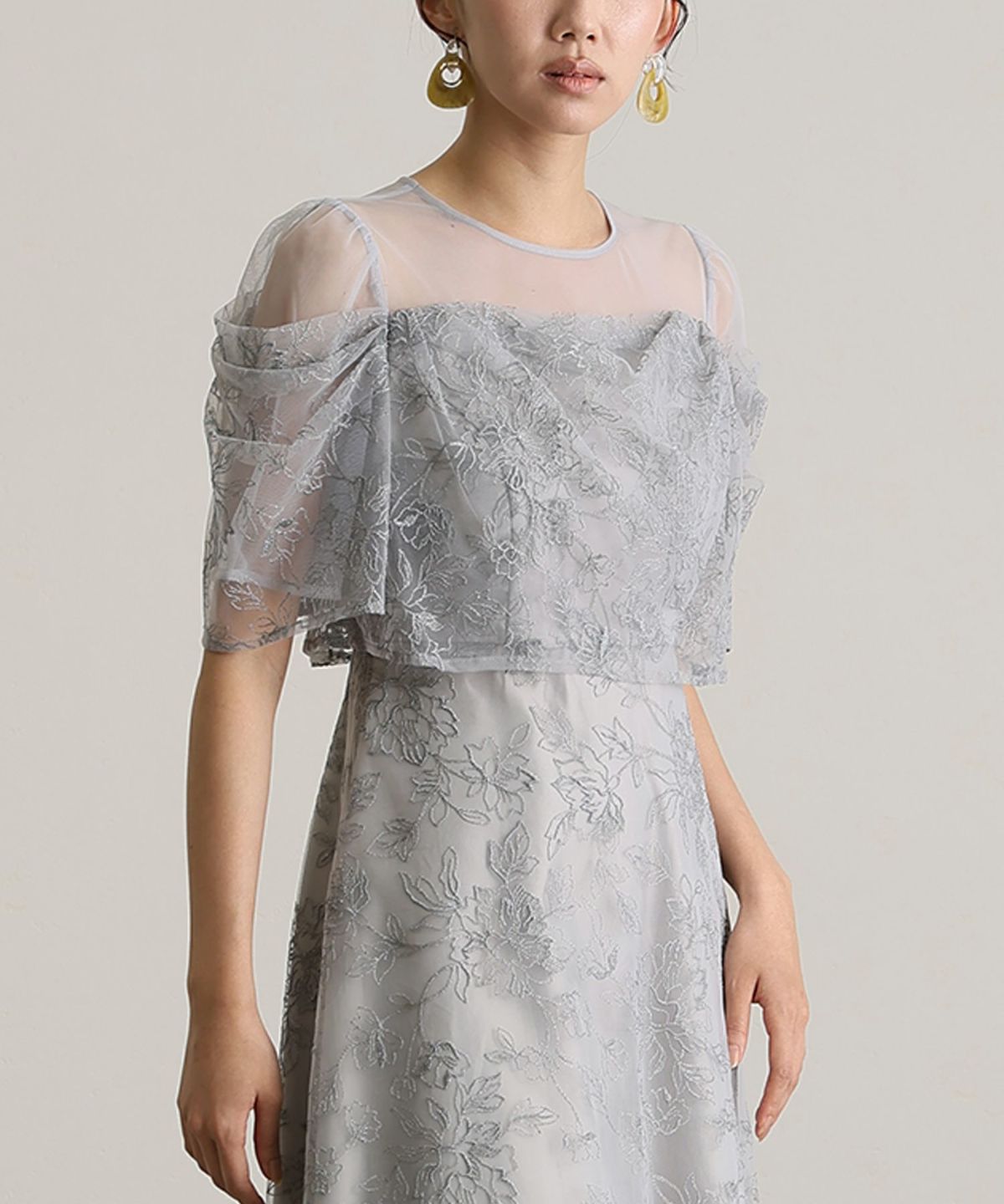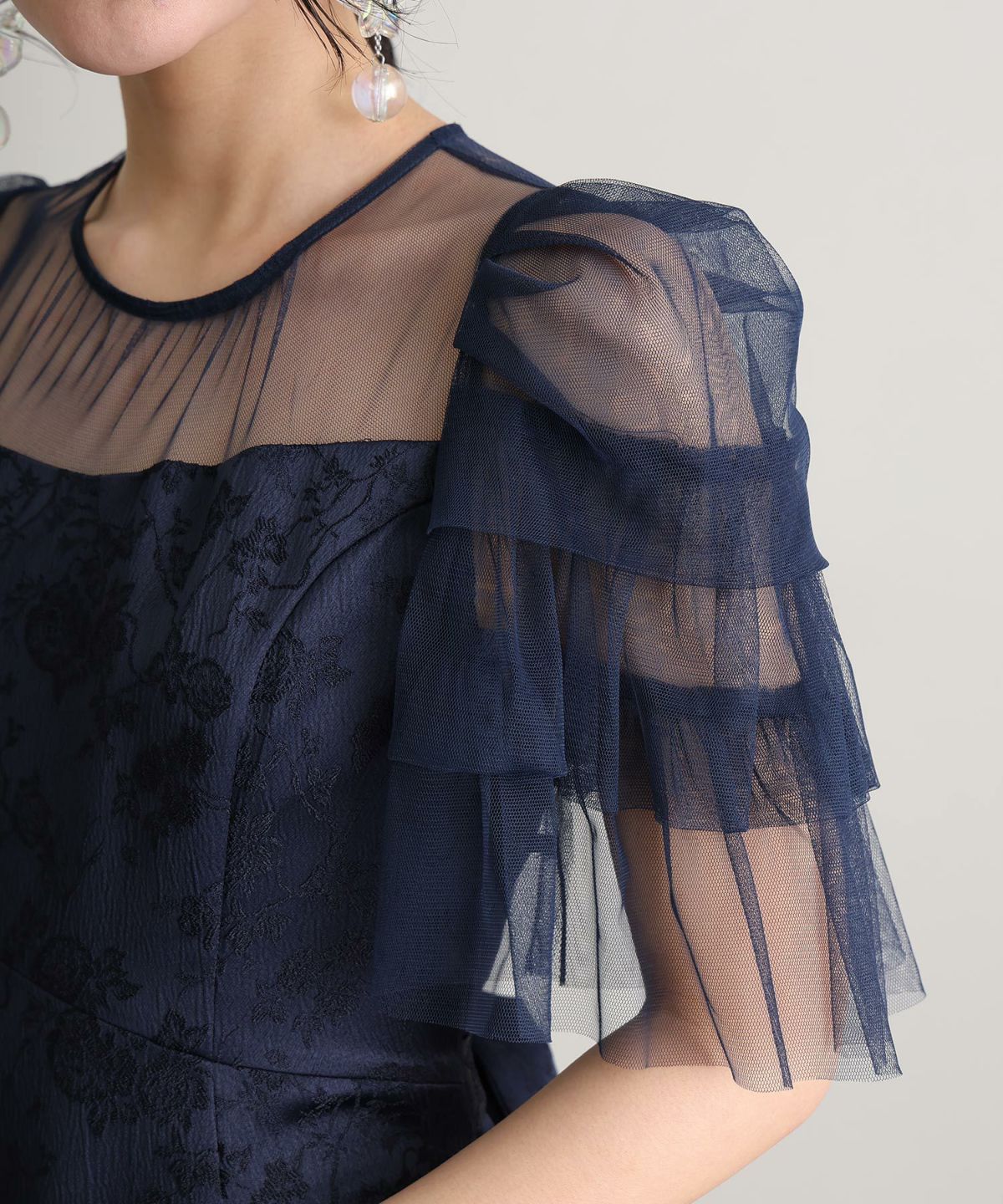 ギャザースリーブが大人可愛い 刺繍チュールシアーワンピース