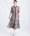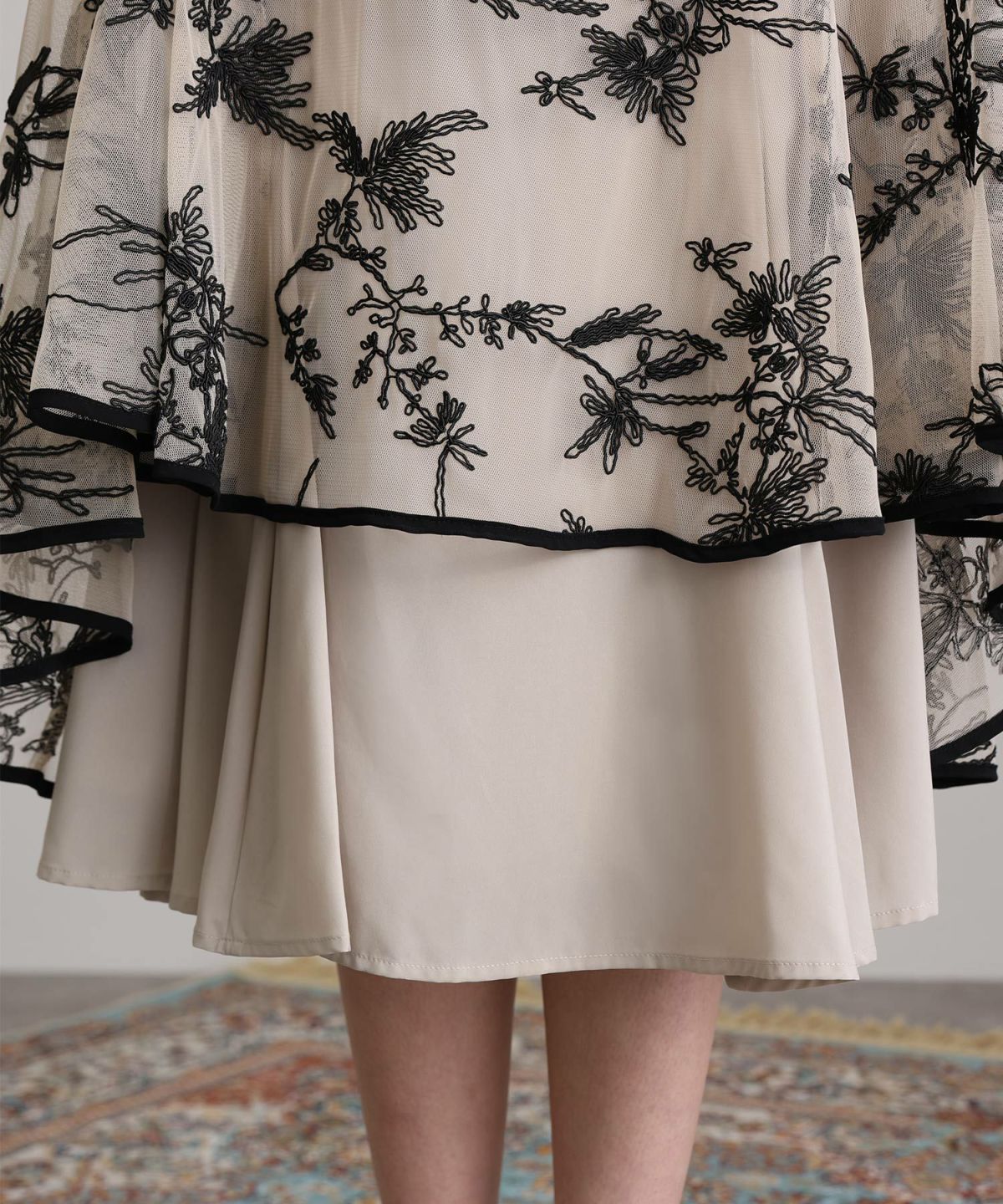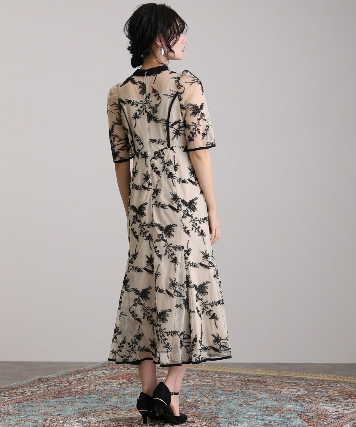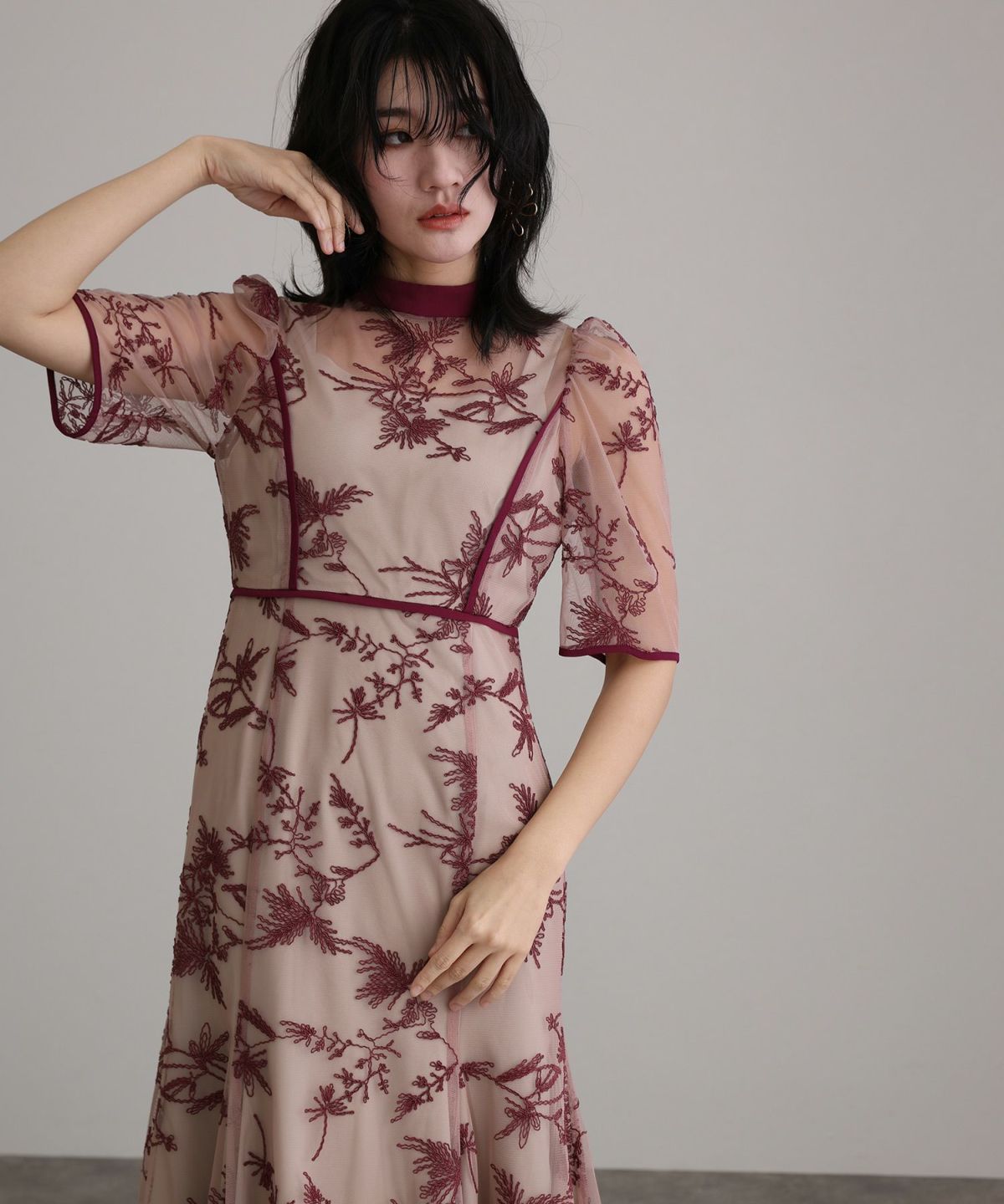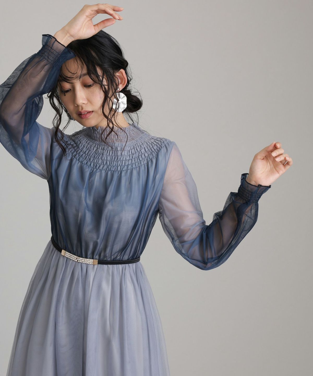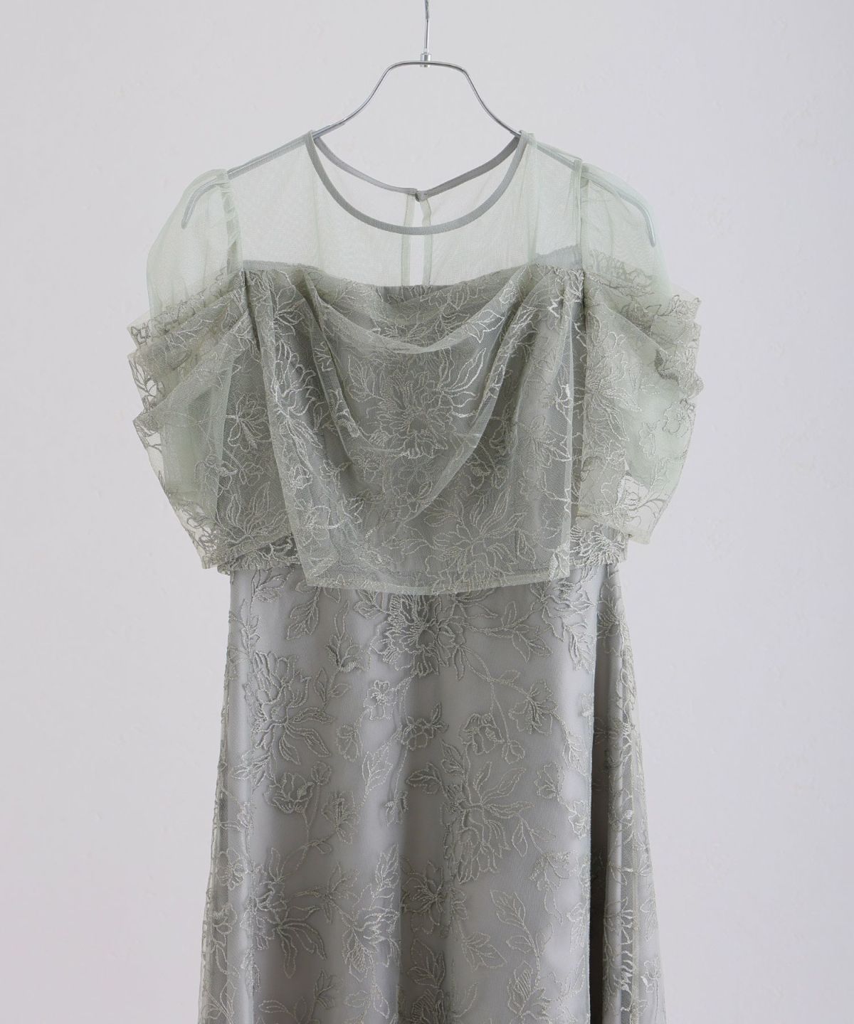 ギャザースリーブが大人可愛い 刺繍チュールシアーワンピース