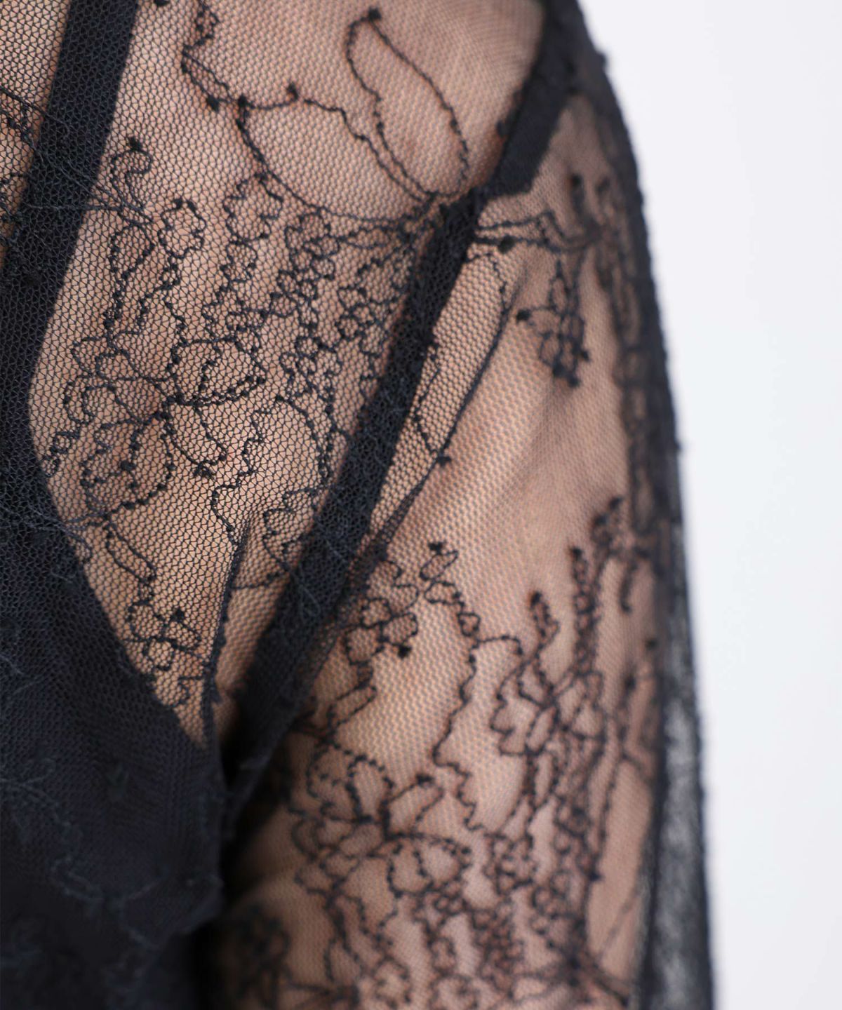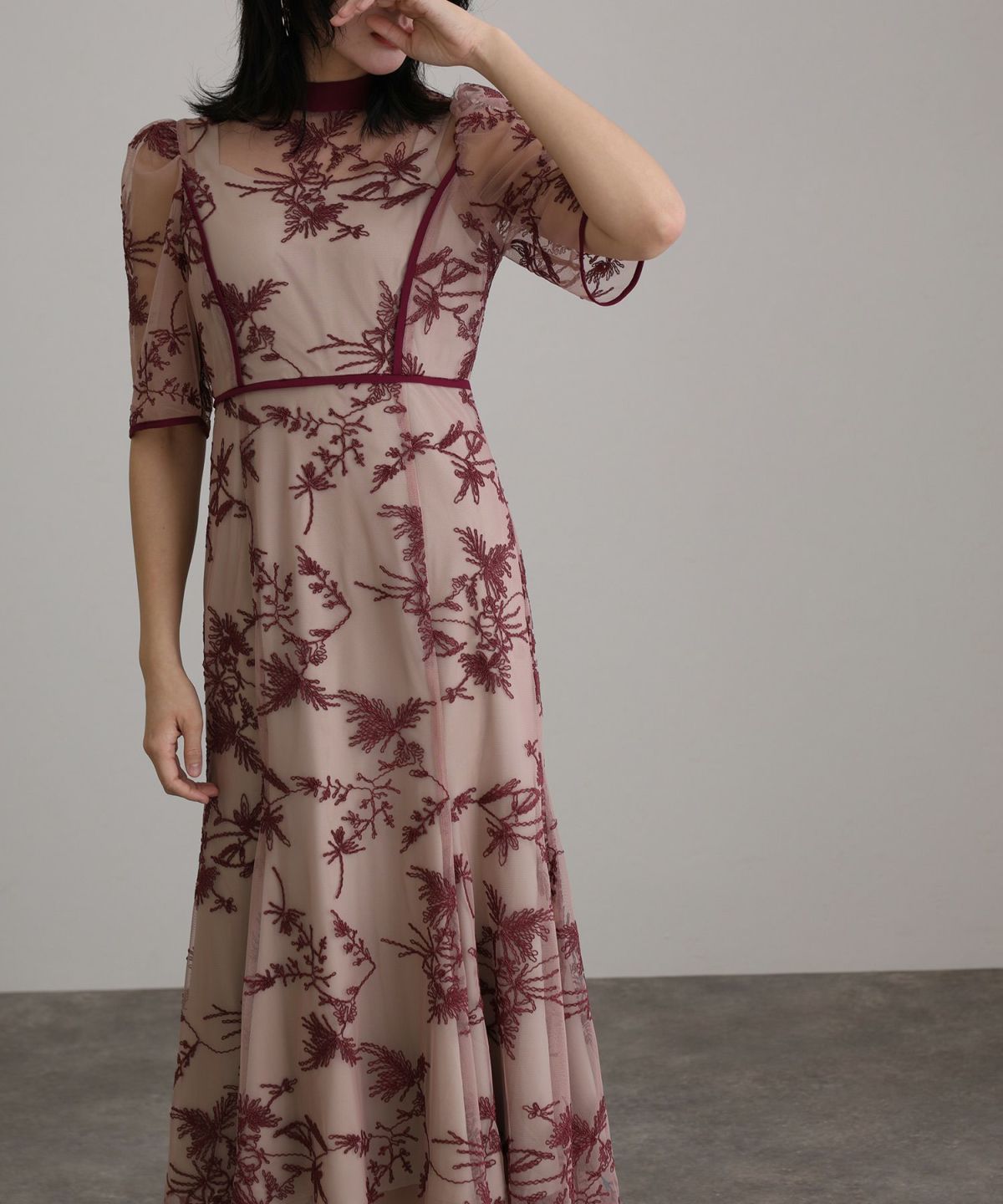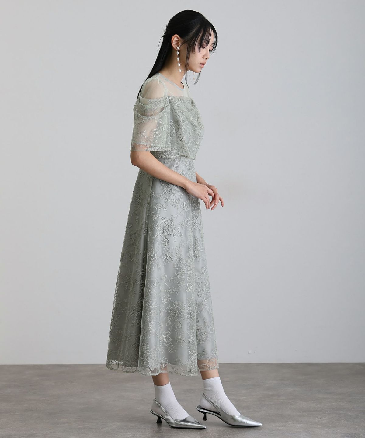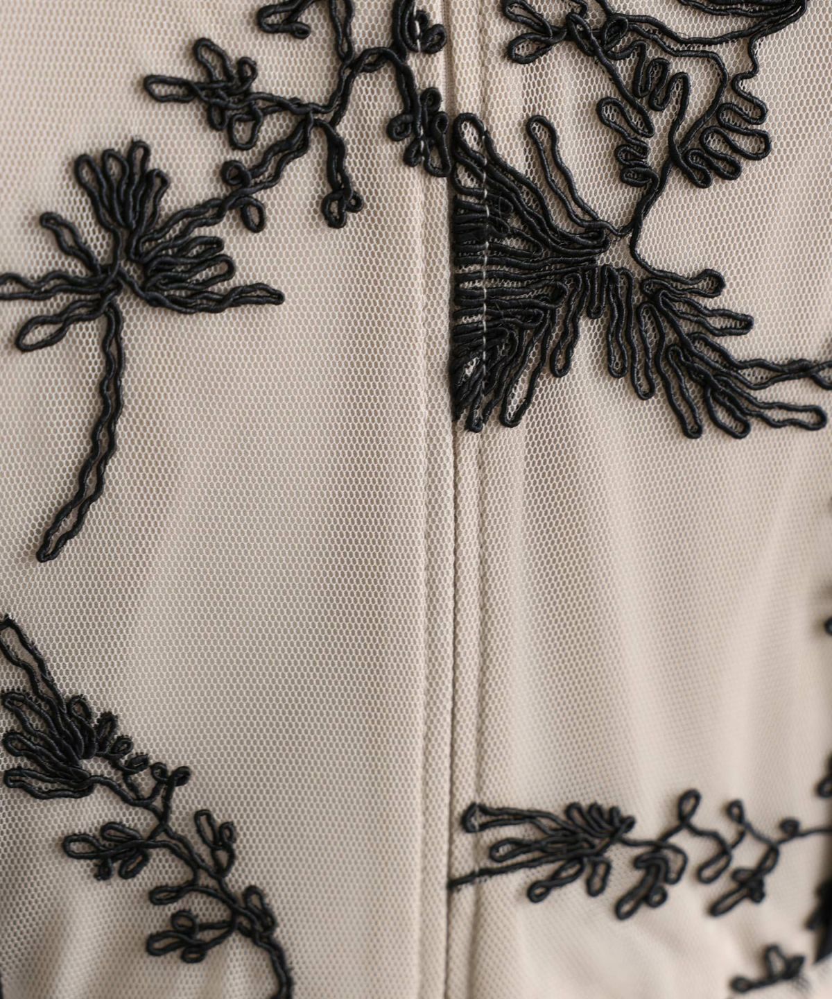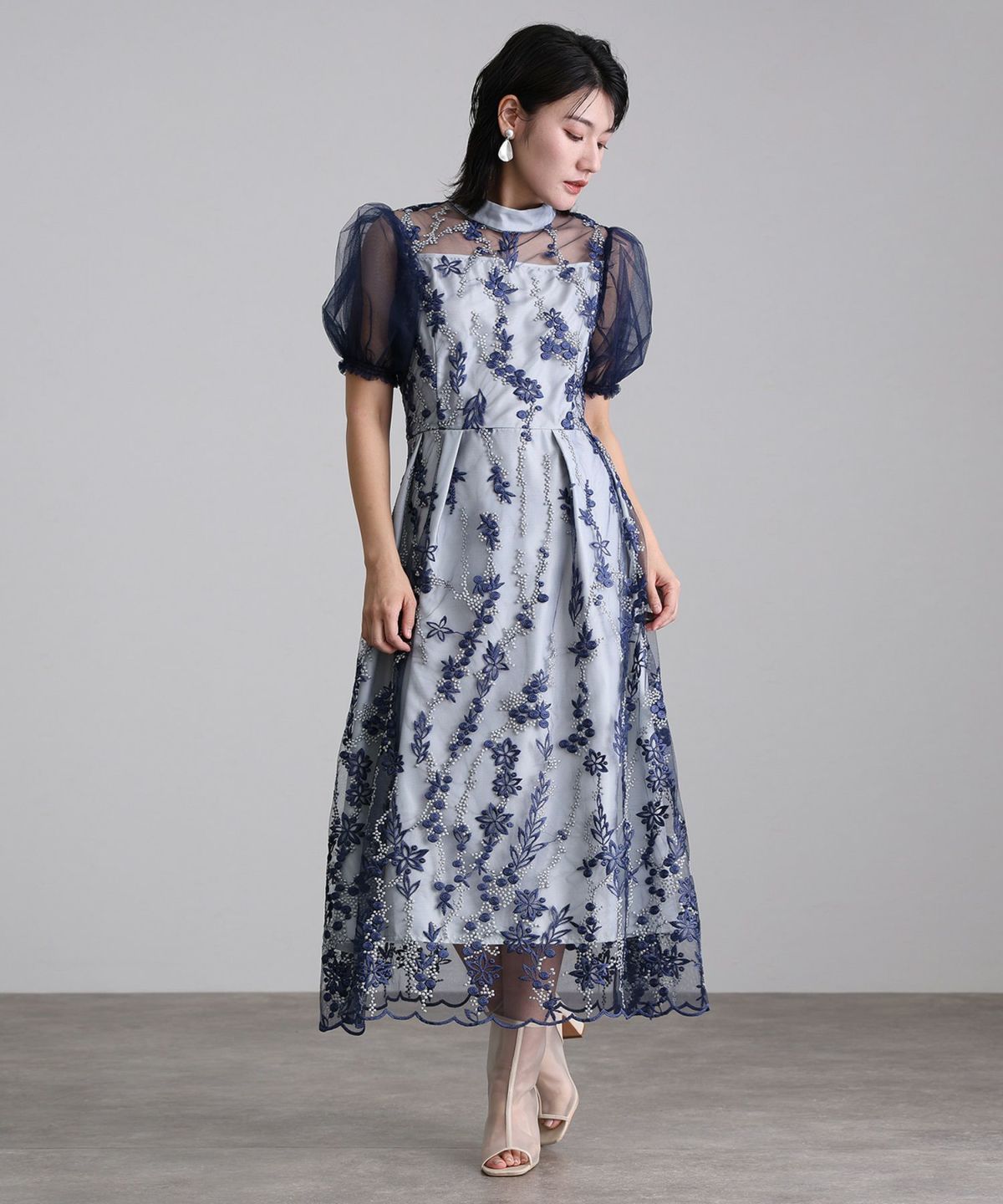 ギャザースリーブが大人可愛い 刺繍チュールシアーワンピース