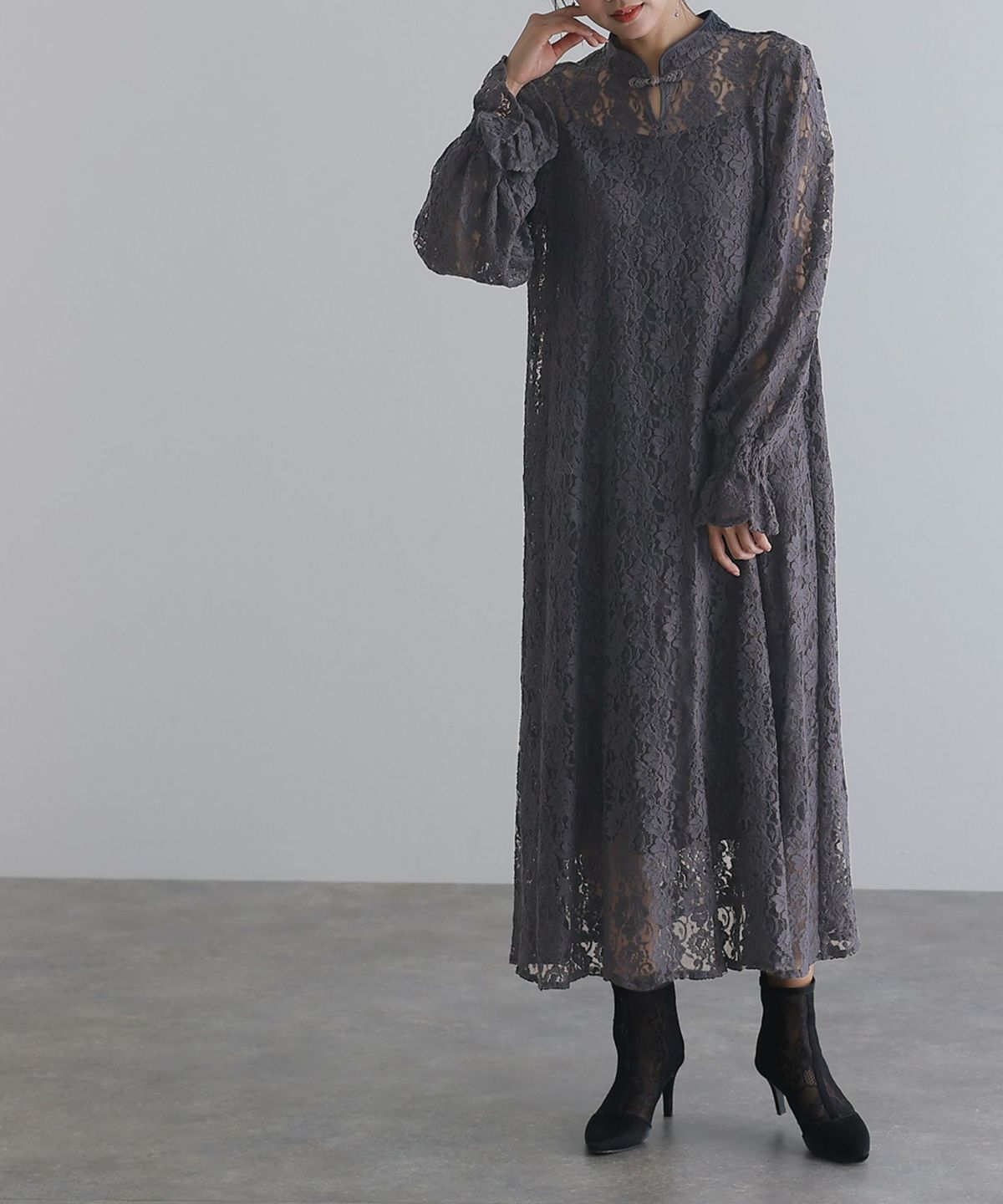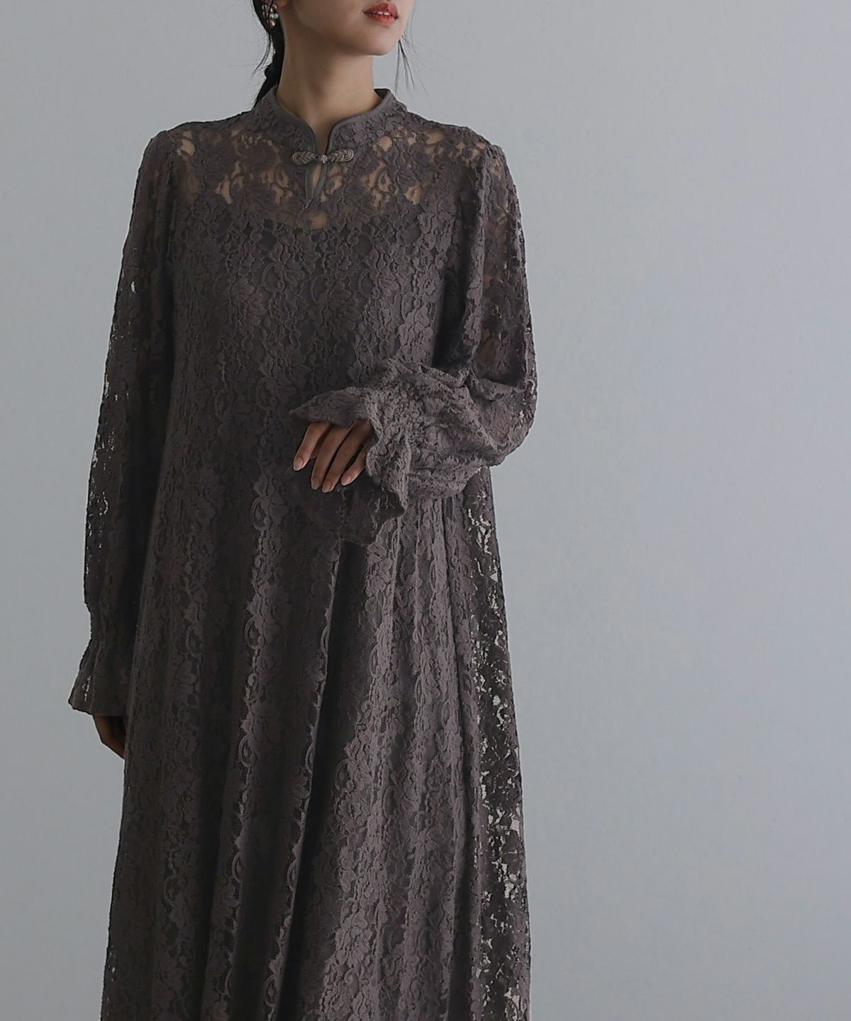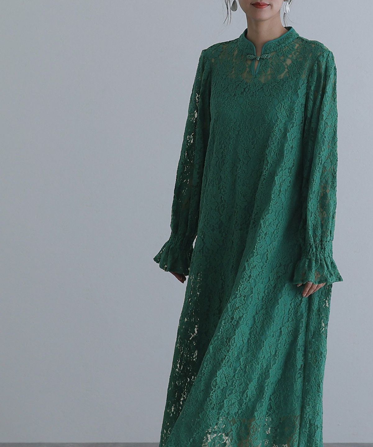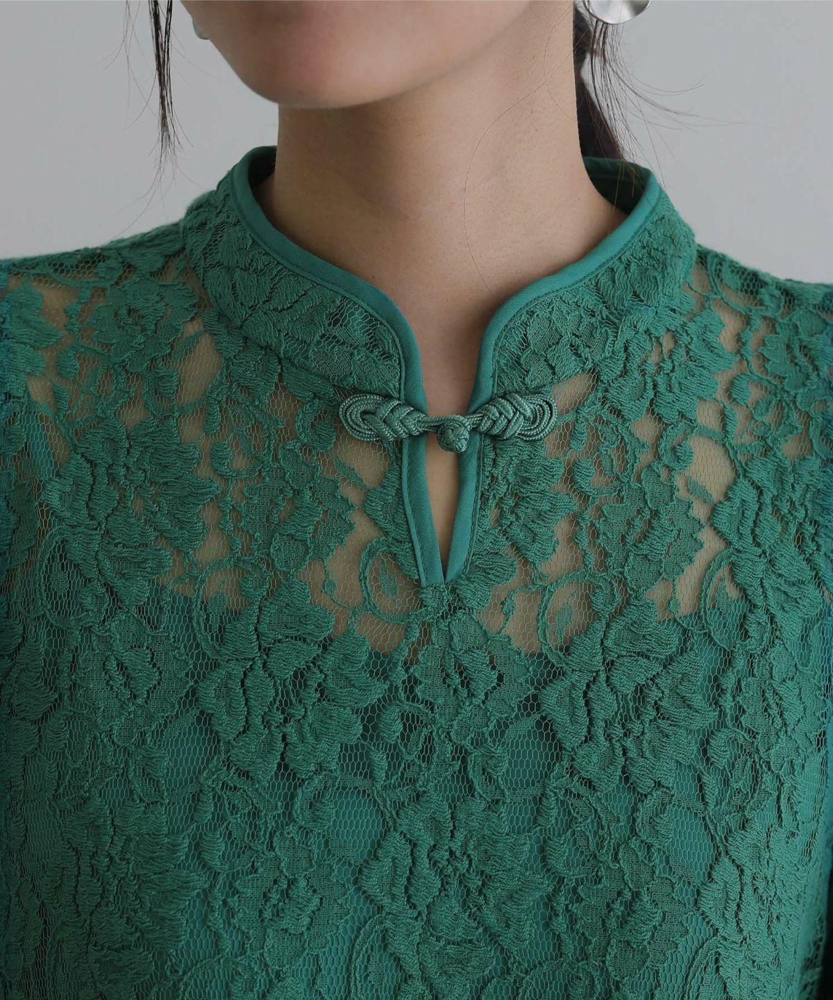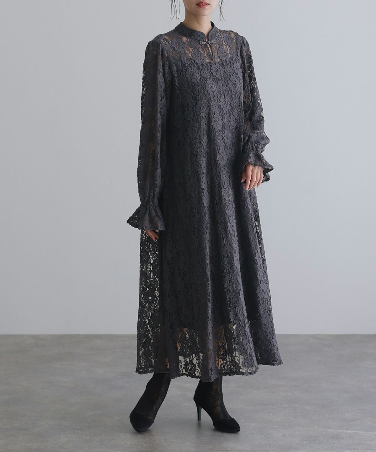 甘くなり過ぎないエレガントなデザイン チャイナ風レース切替ワンピース