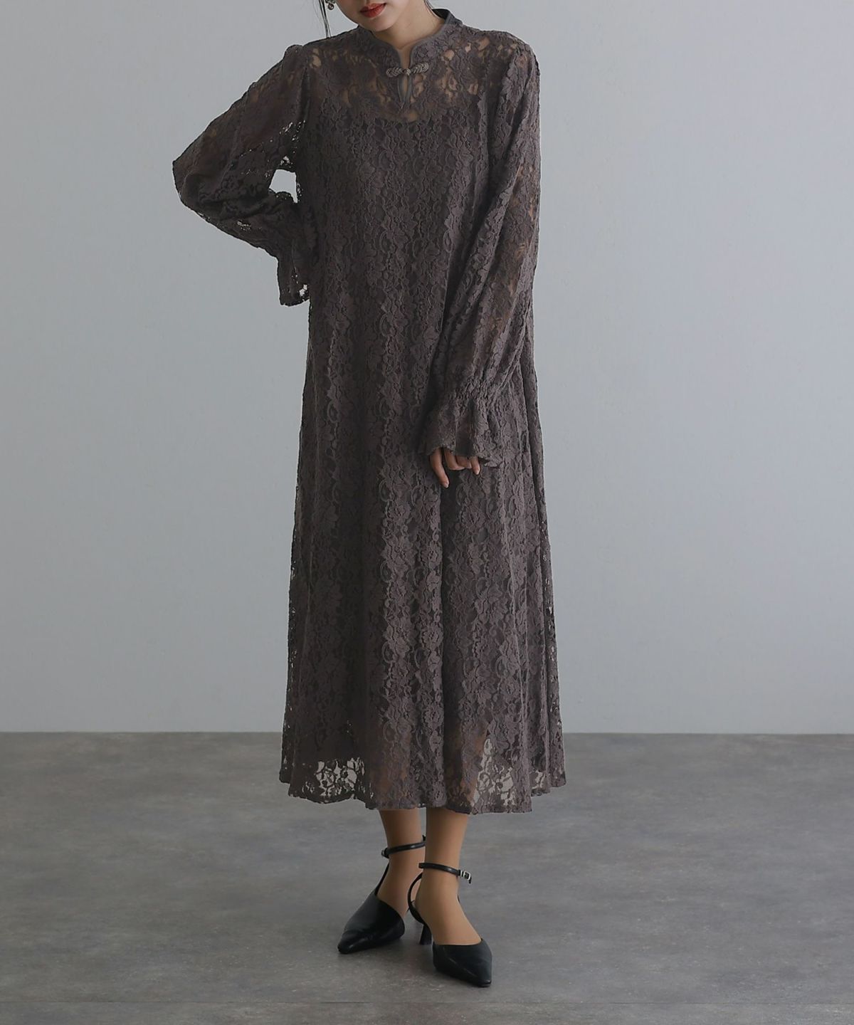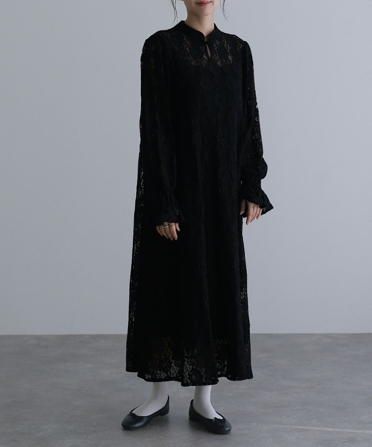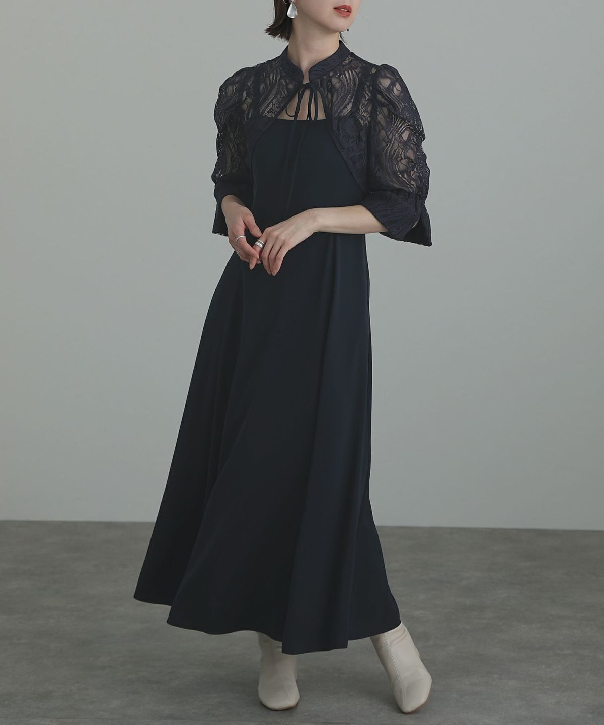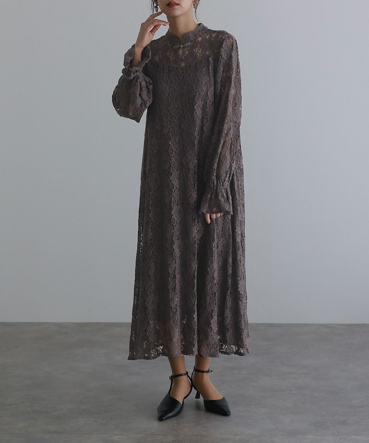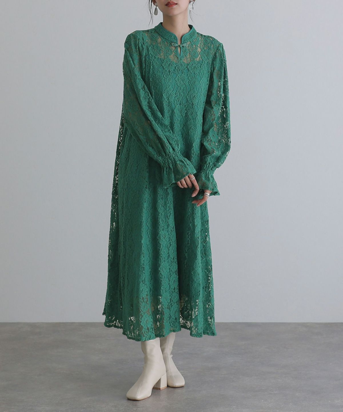 甘くなり過ぎないエレガントなデザイン チャイナ風レース切替ワンピース