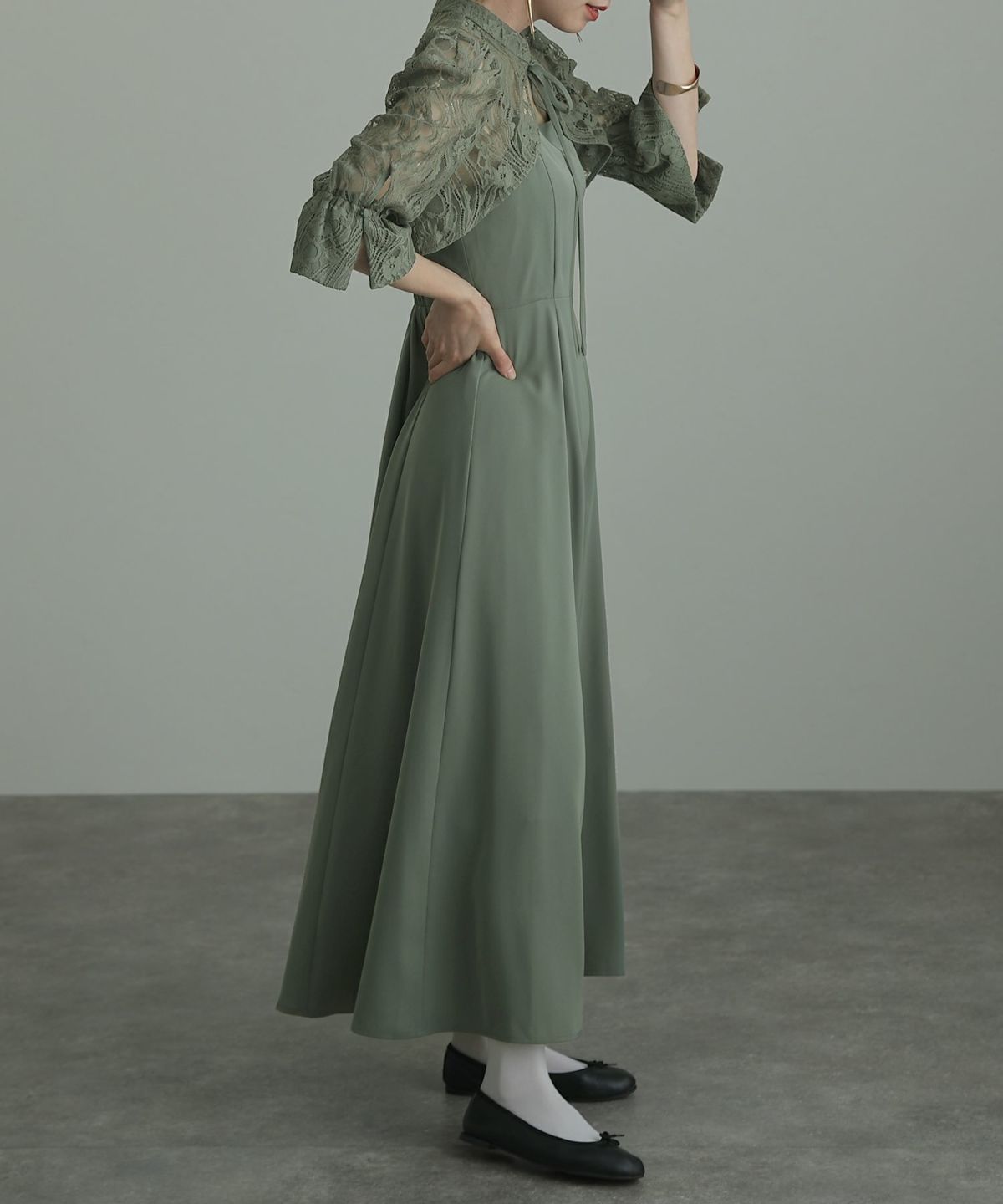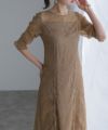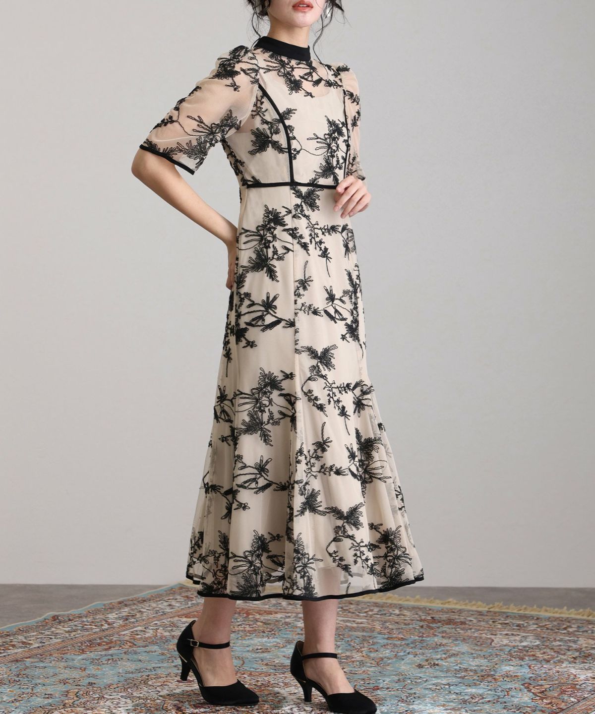 レトロ調×刺繍レース ボタニカルレース切替えワンピース