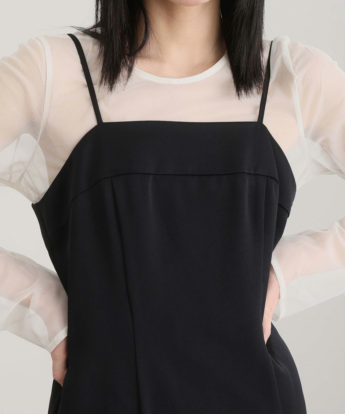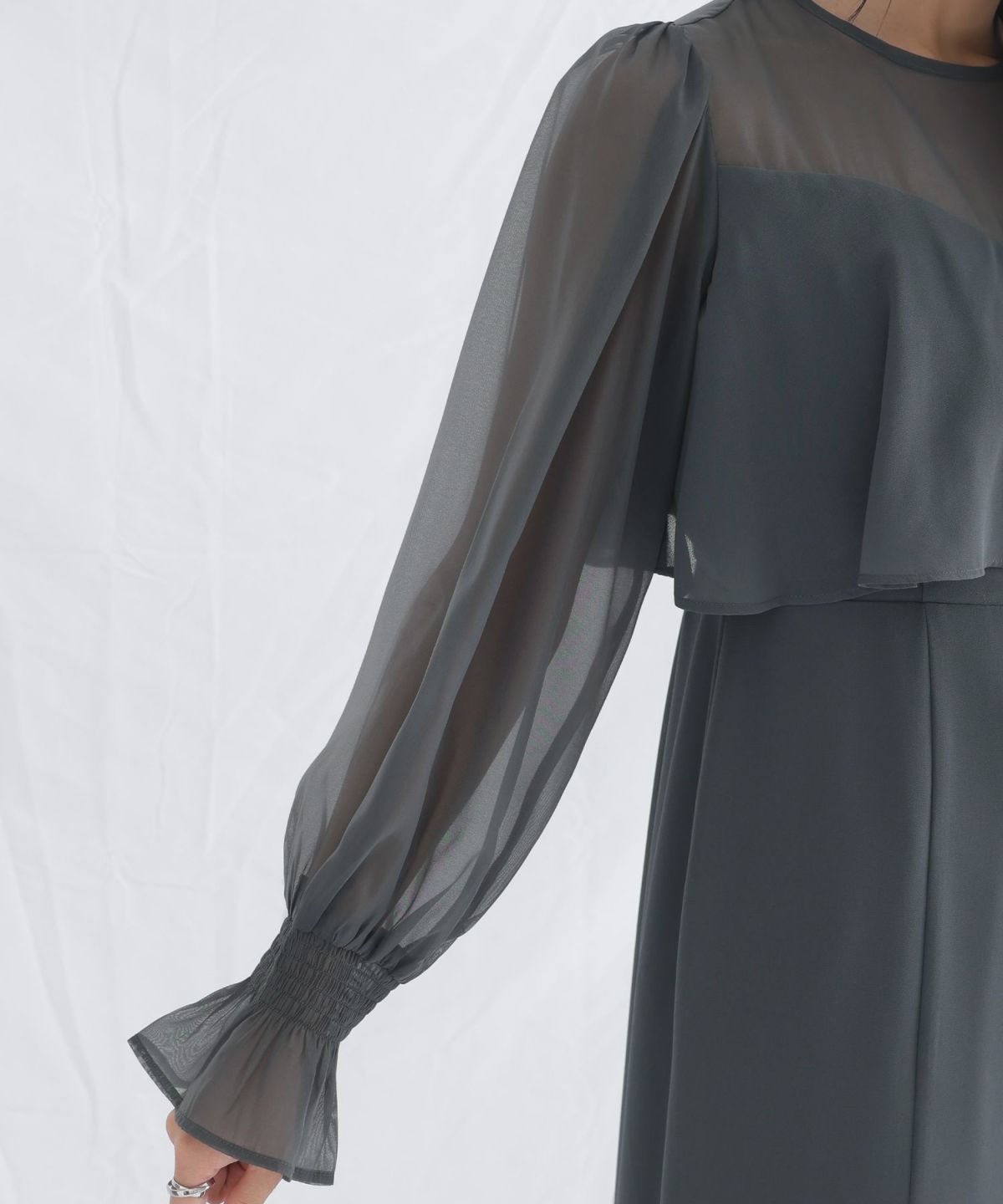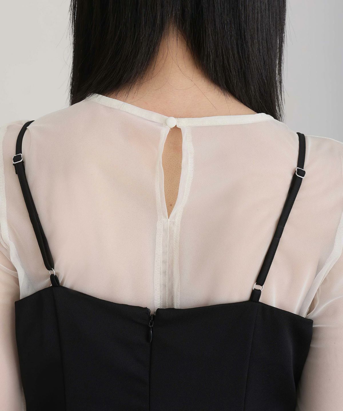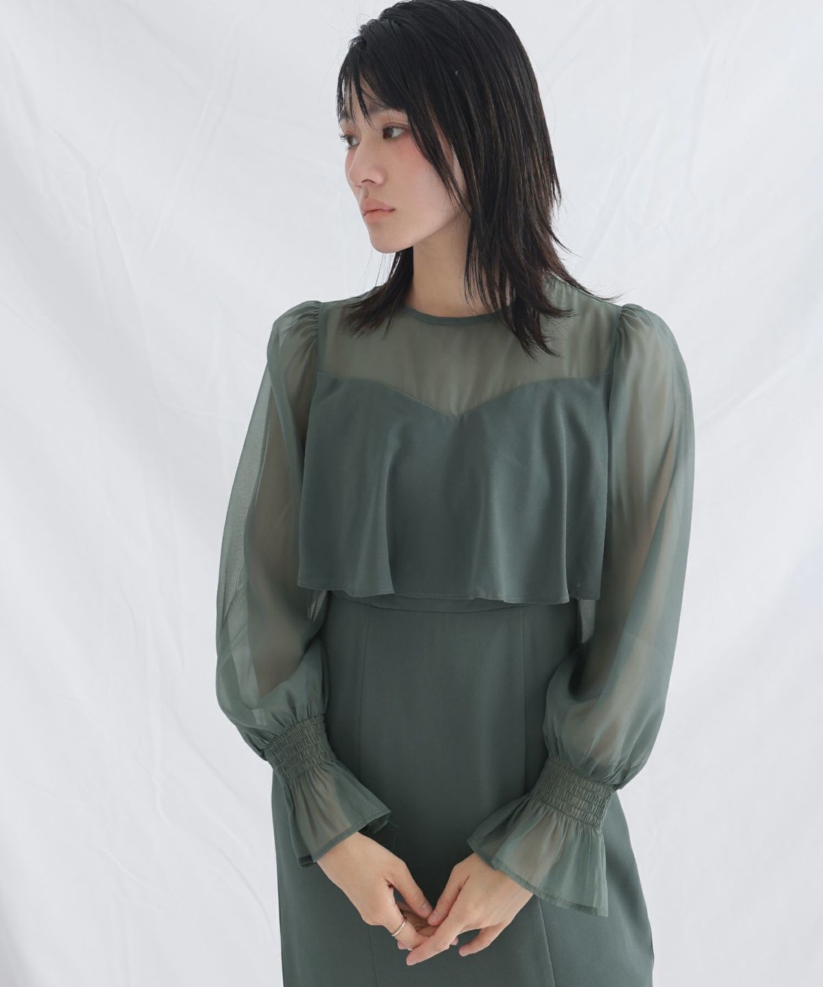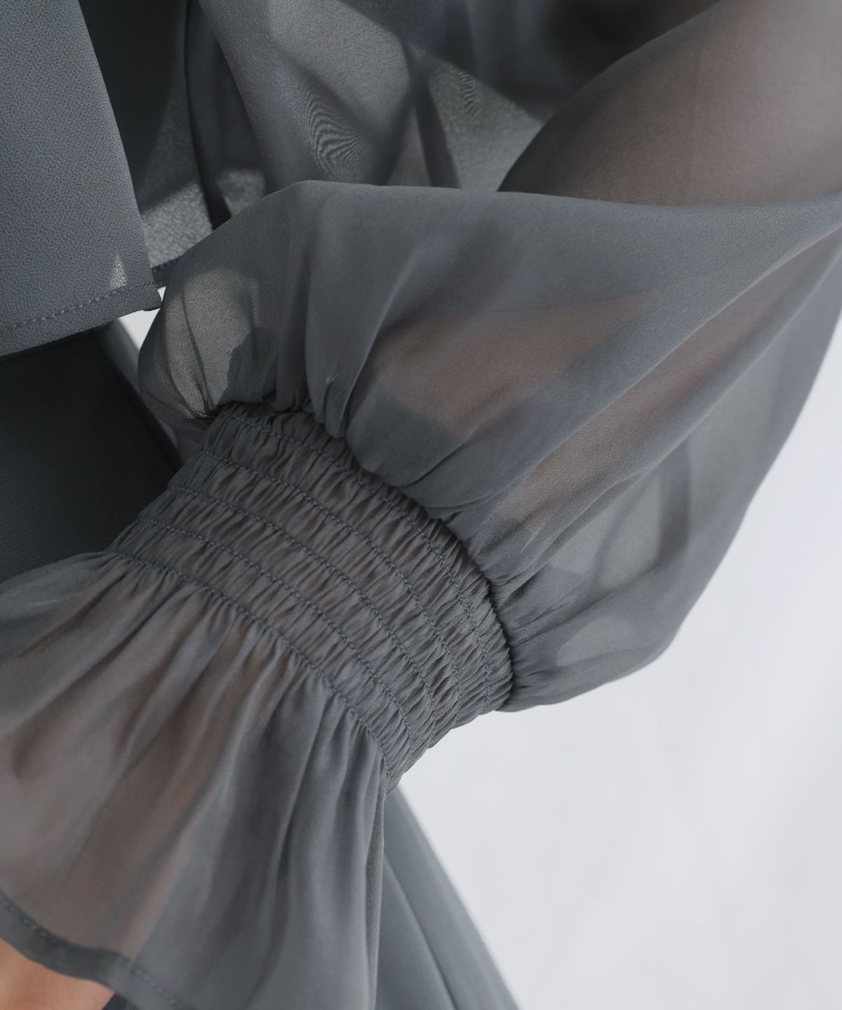 袖口のシャーリングでフェミニンな雰囲気に オーガンジー切り替えビスチェ風ワンピース