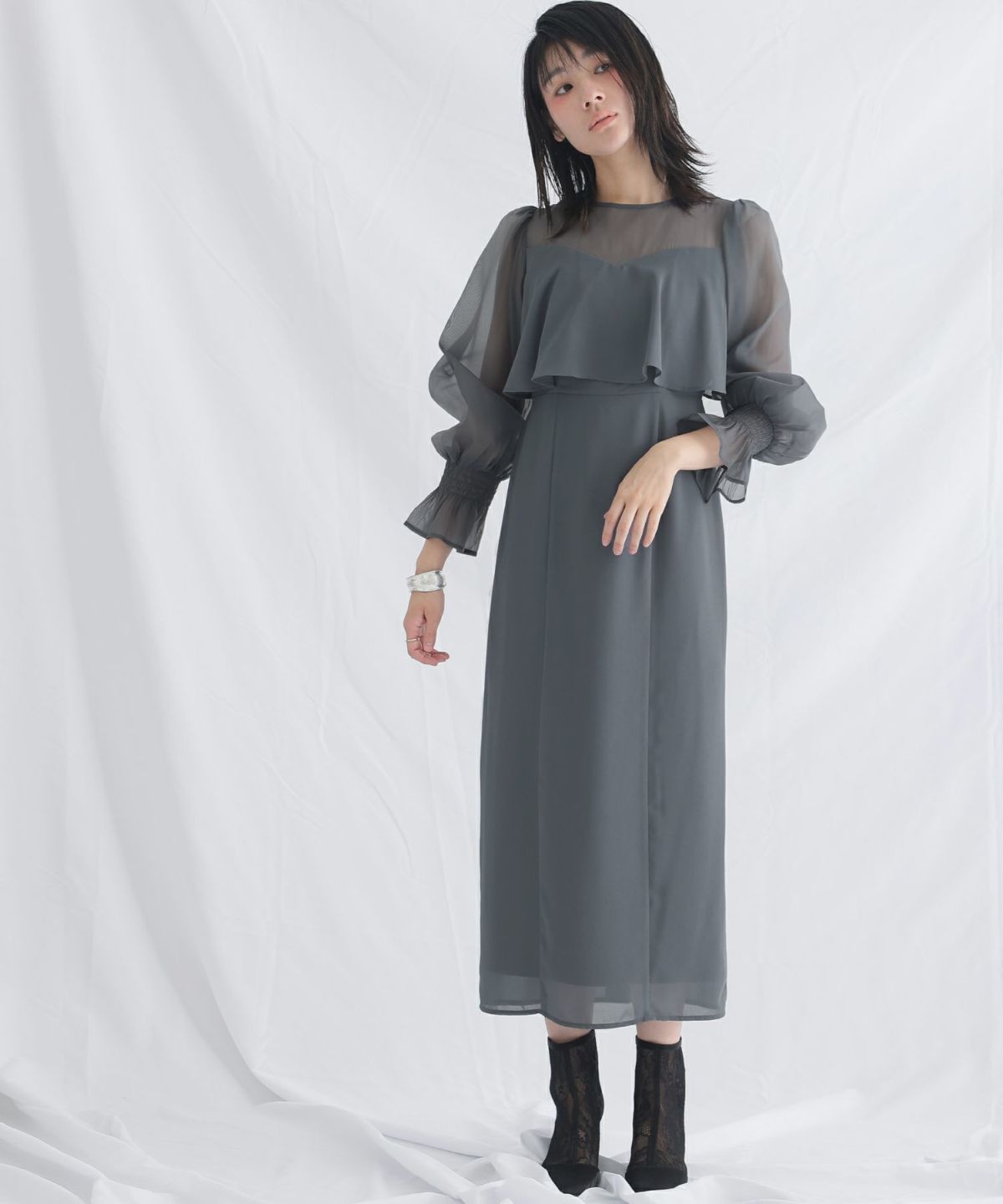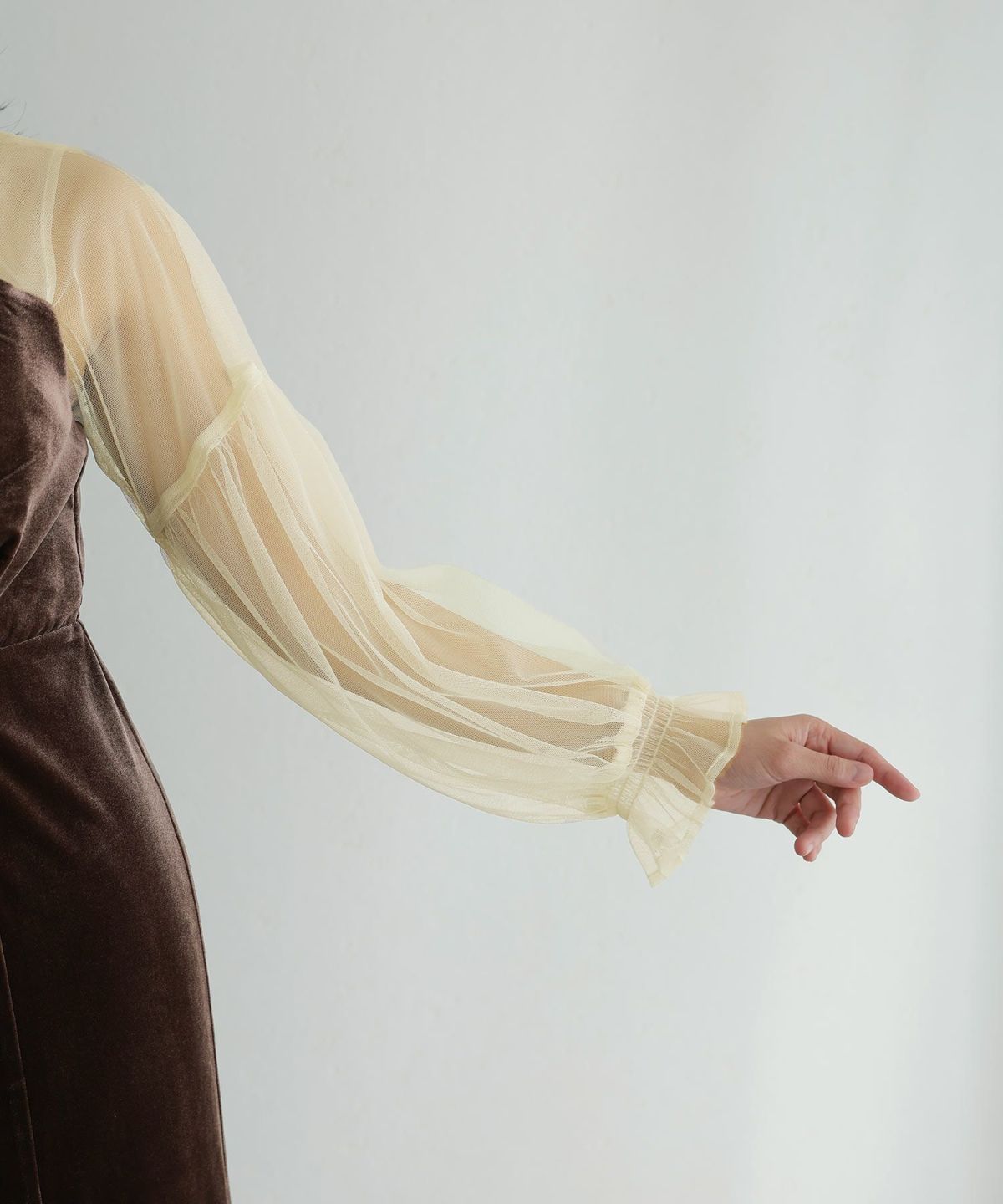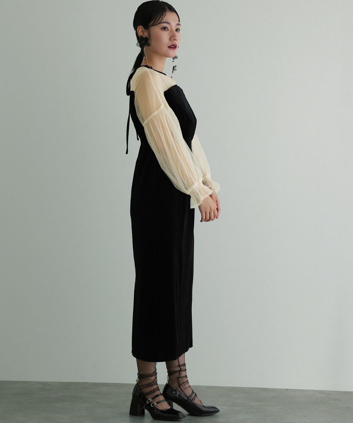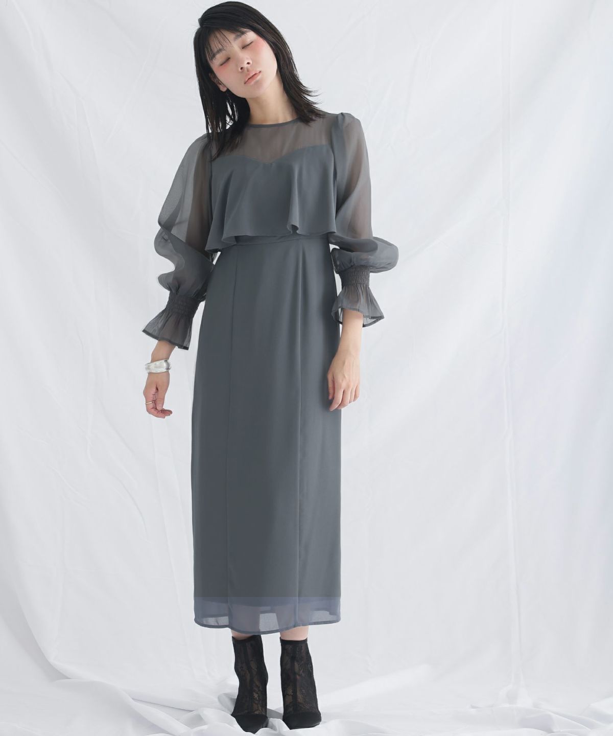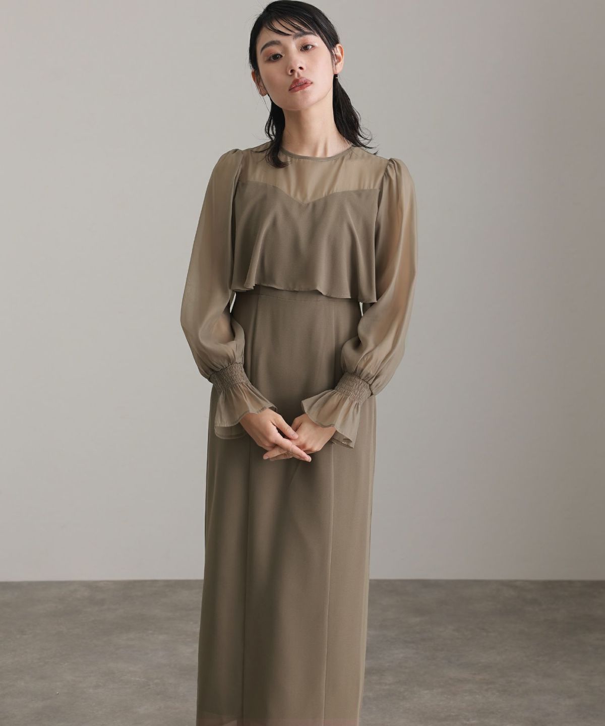 袖口のシャーリングでフェミニンな雰囲気に オーガンジー切り替えビスチェ風ワンピース