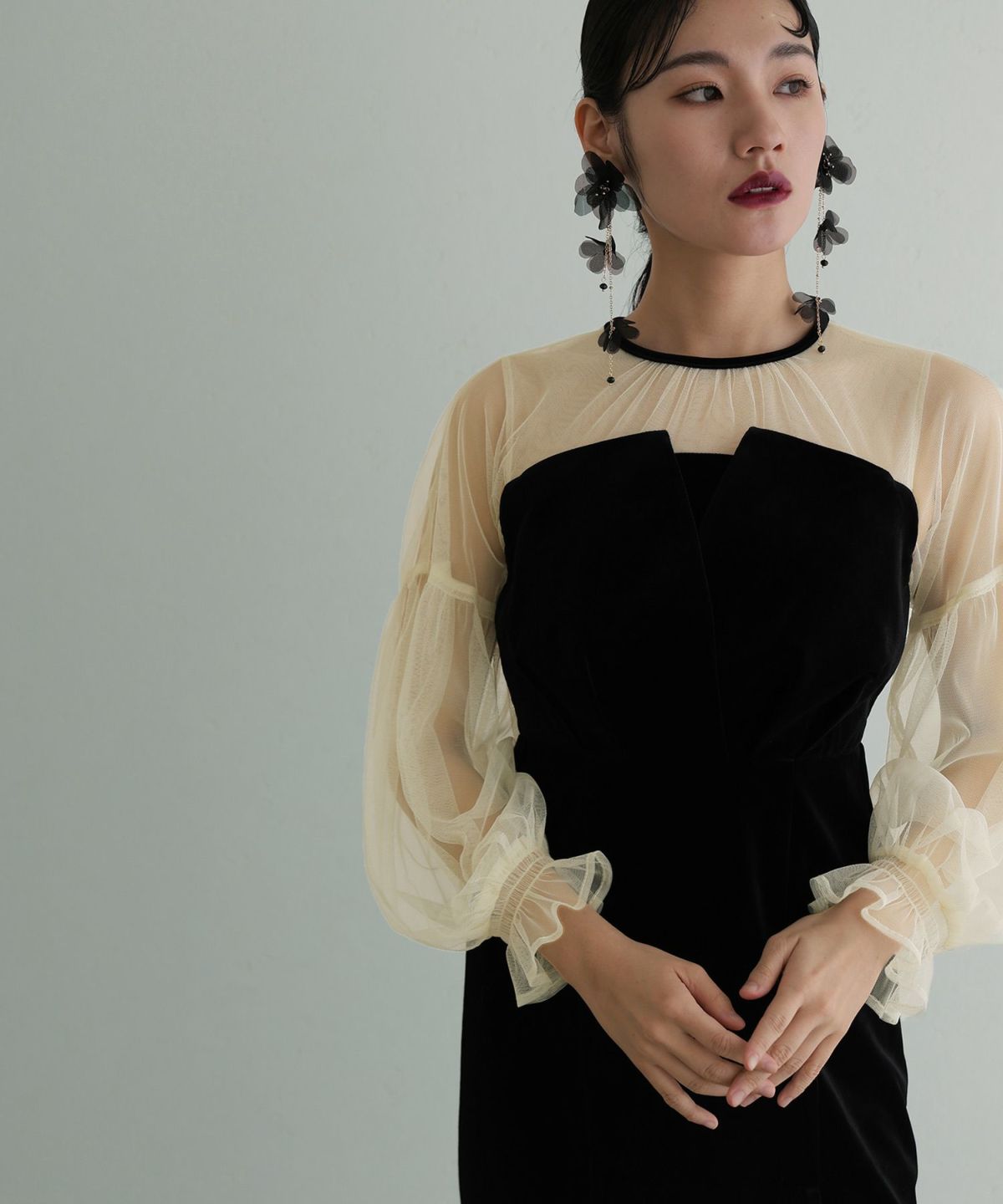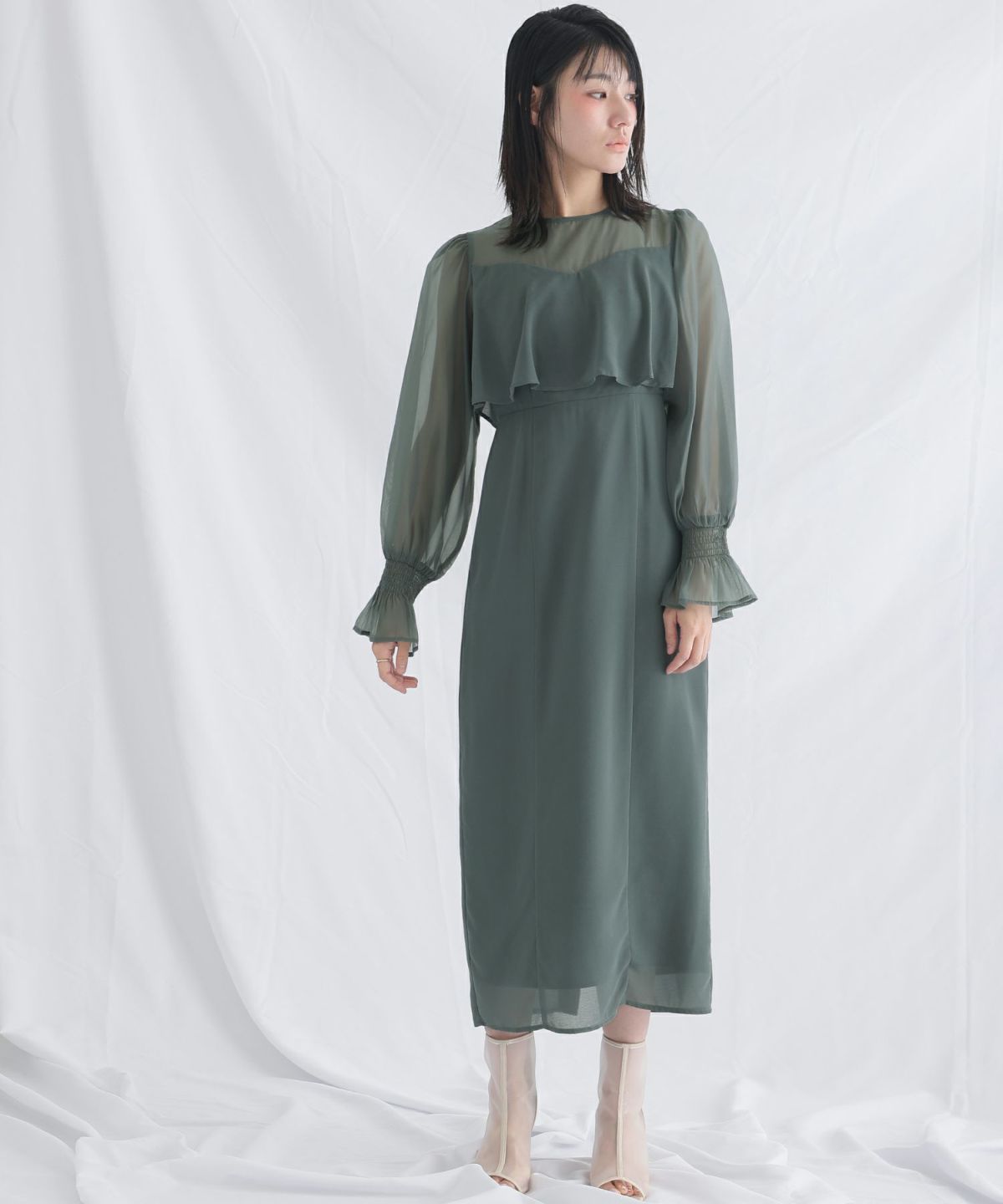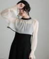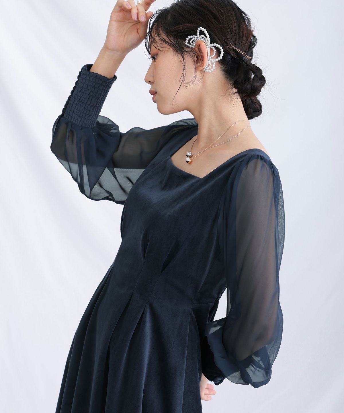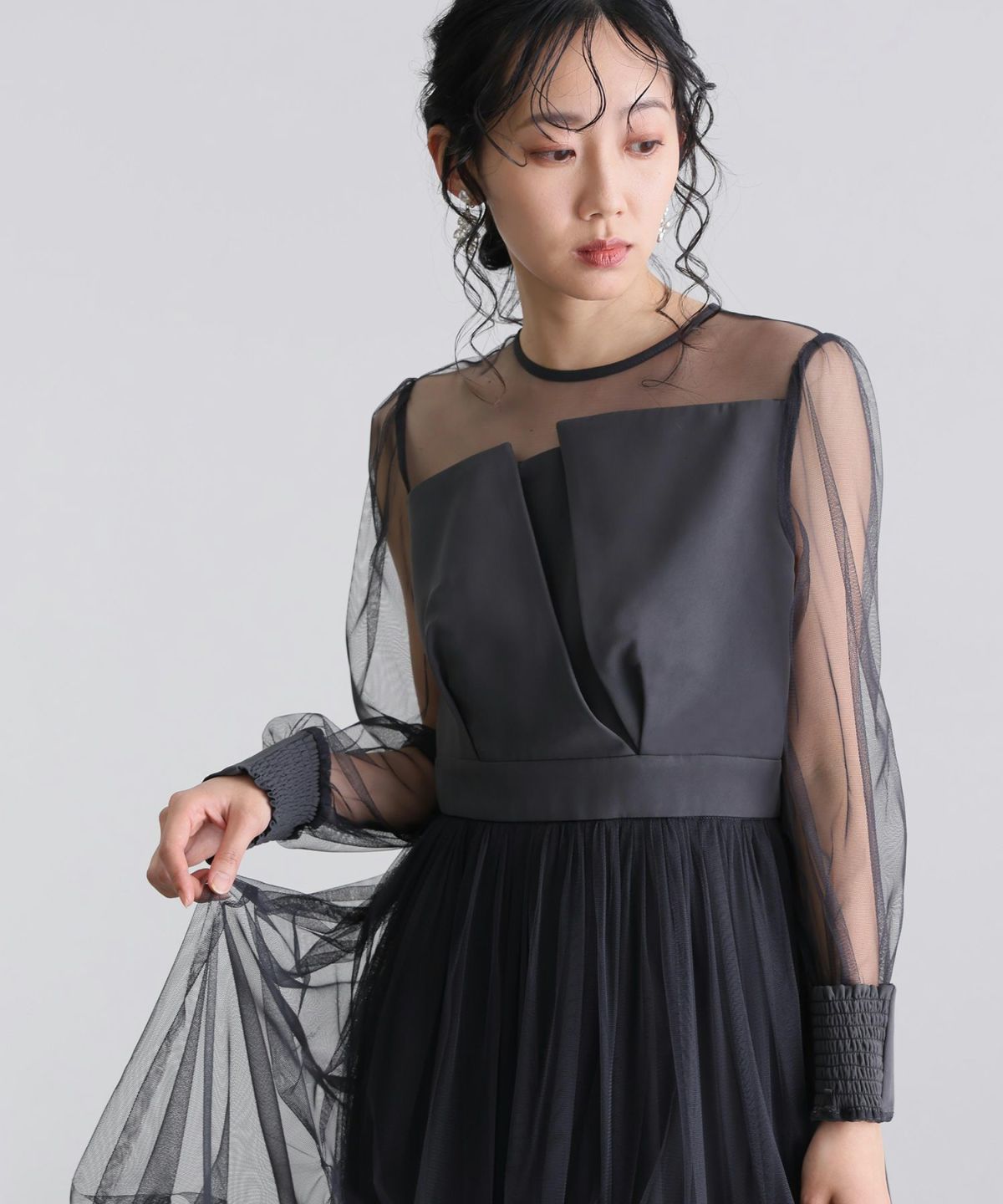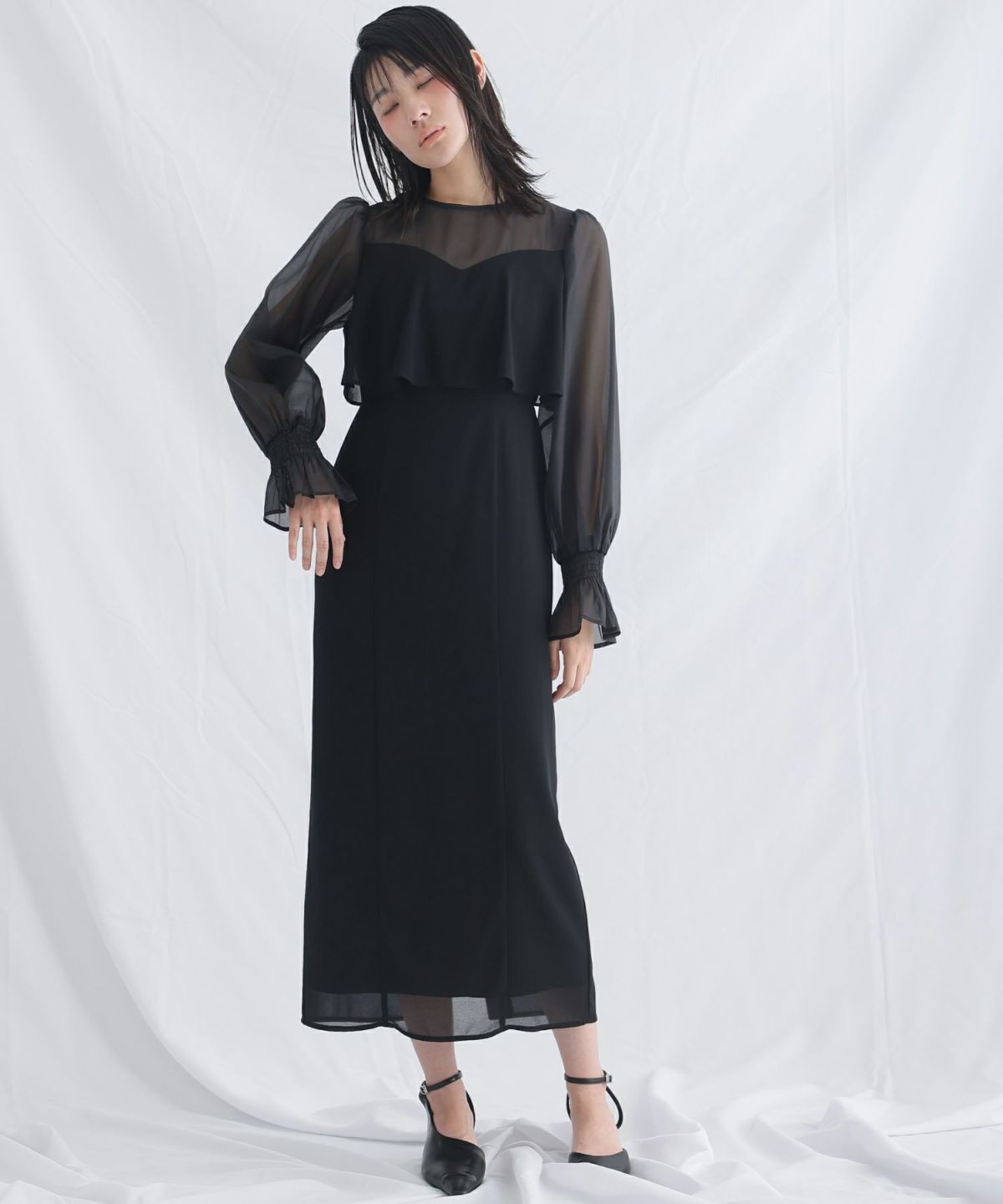 袖口のシャーリングでフェミニンな雰囲気に オーガンジー切り替えビスチェ風ワンピース