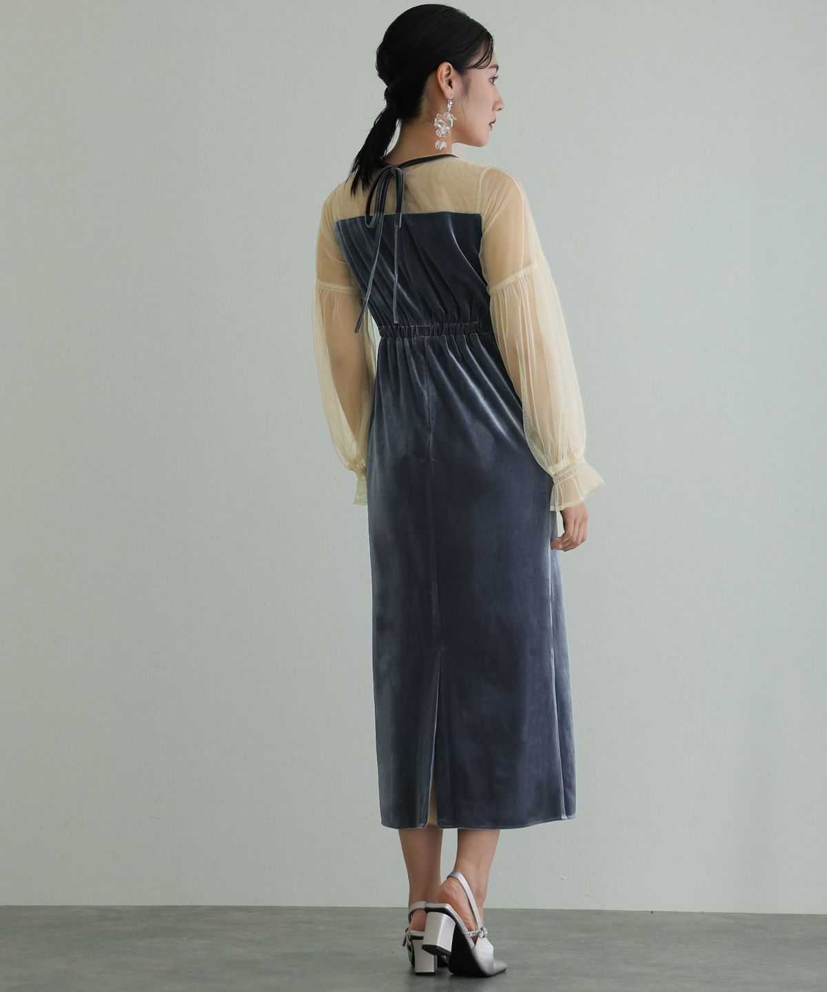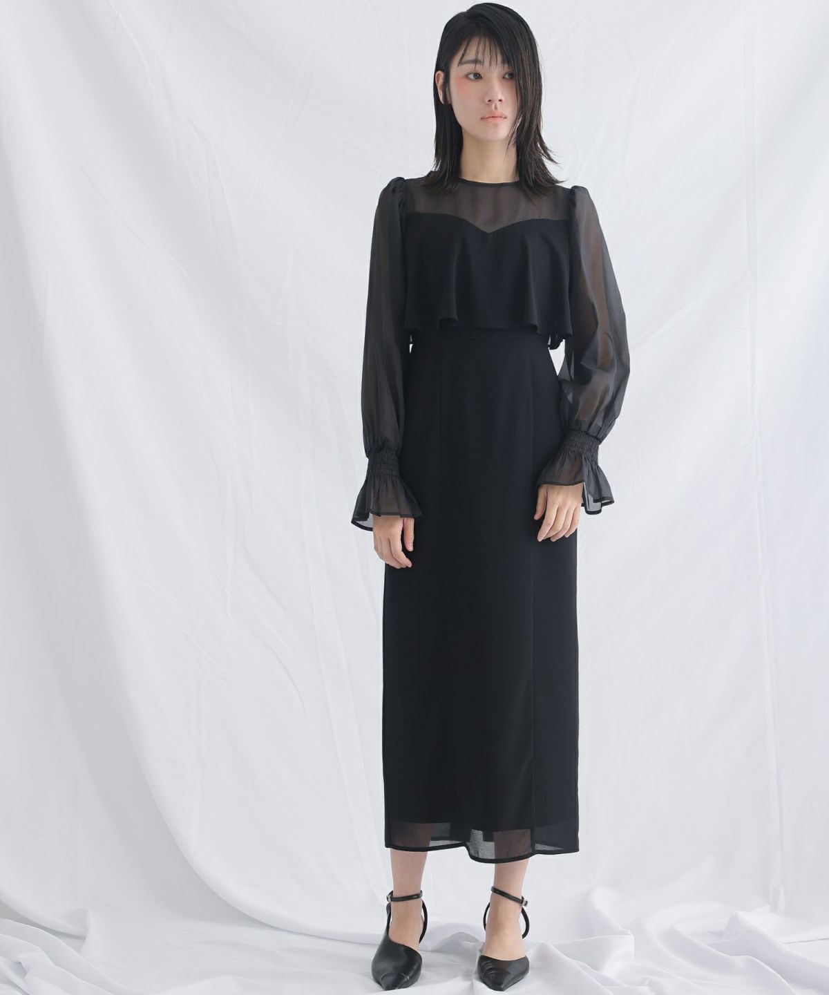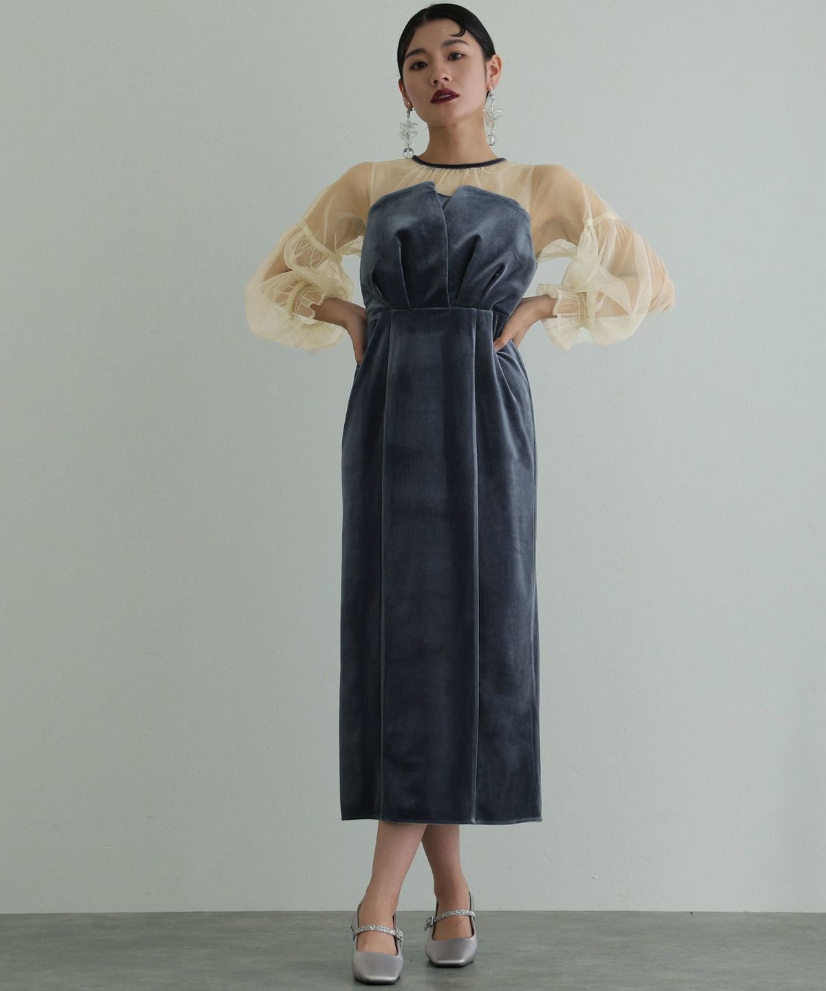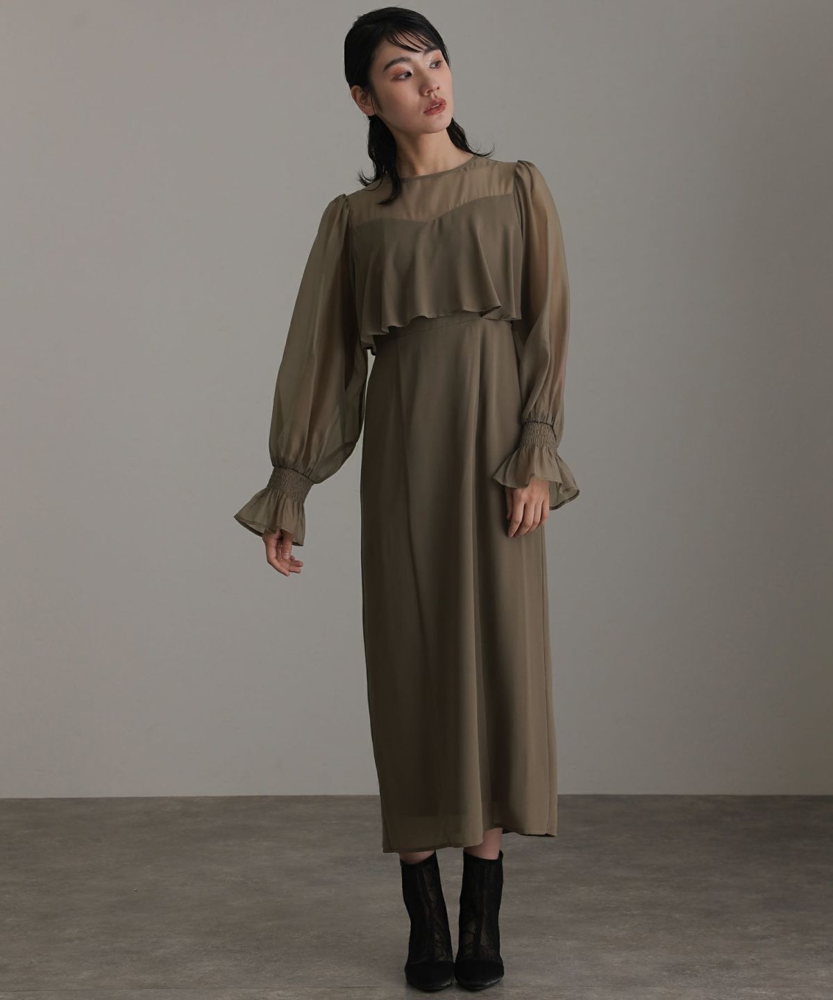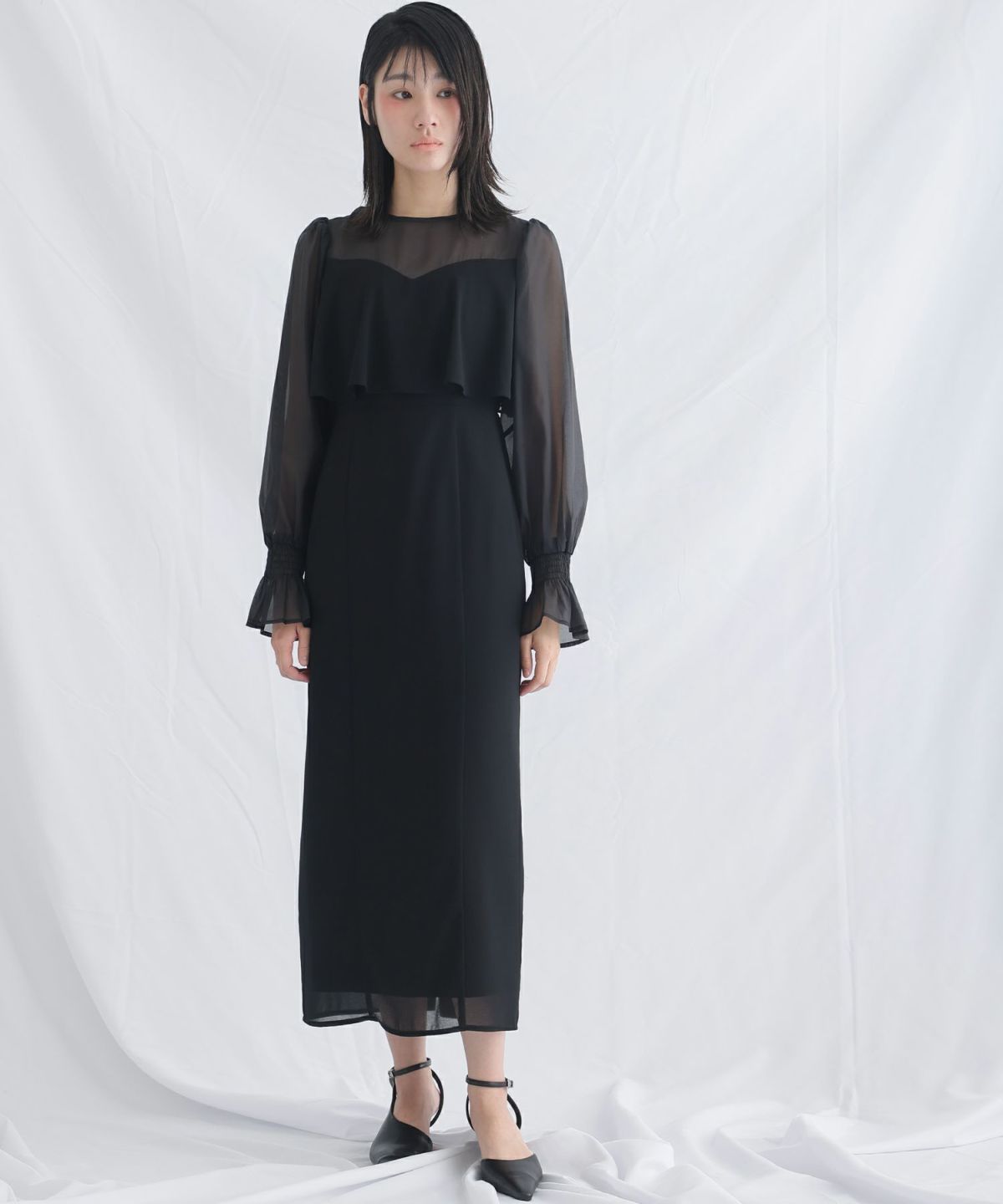 袖口のシャーリングでフェミニンな雰囲気に オーガンジー切り替えビスチェ風ワンピース