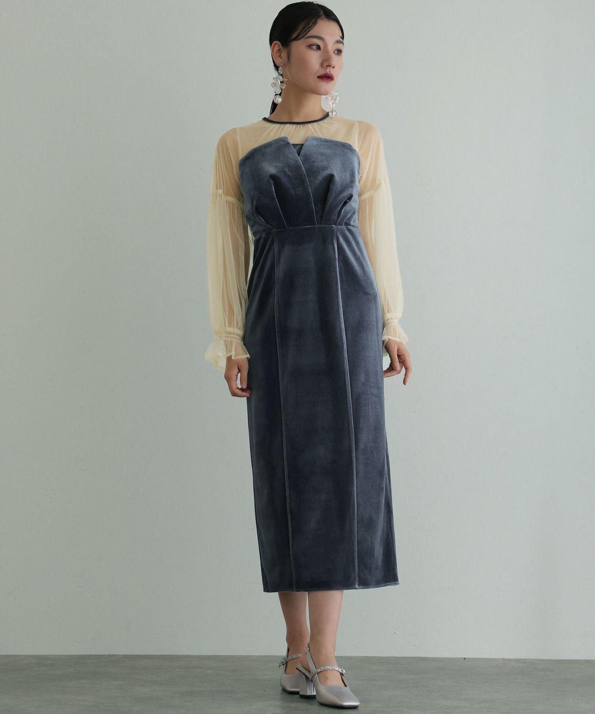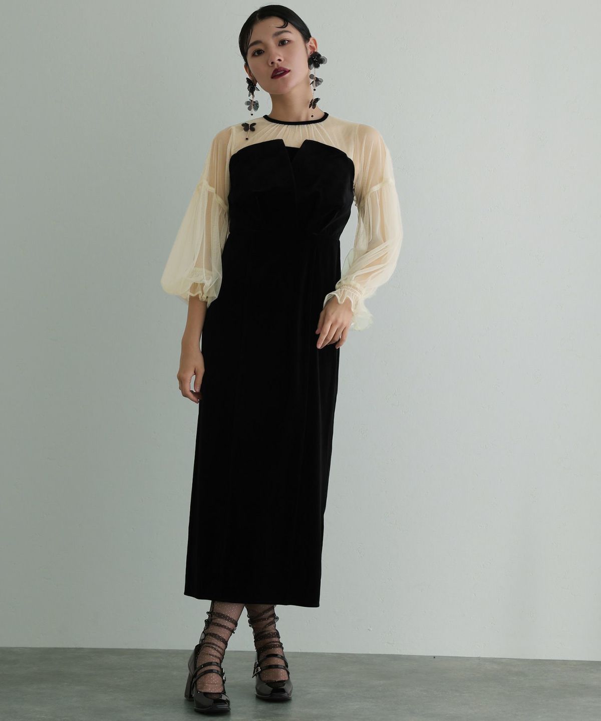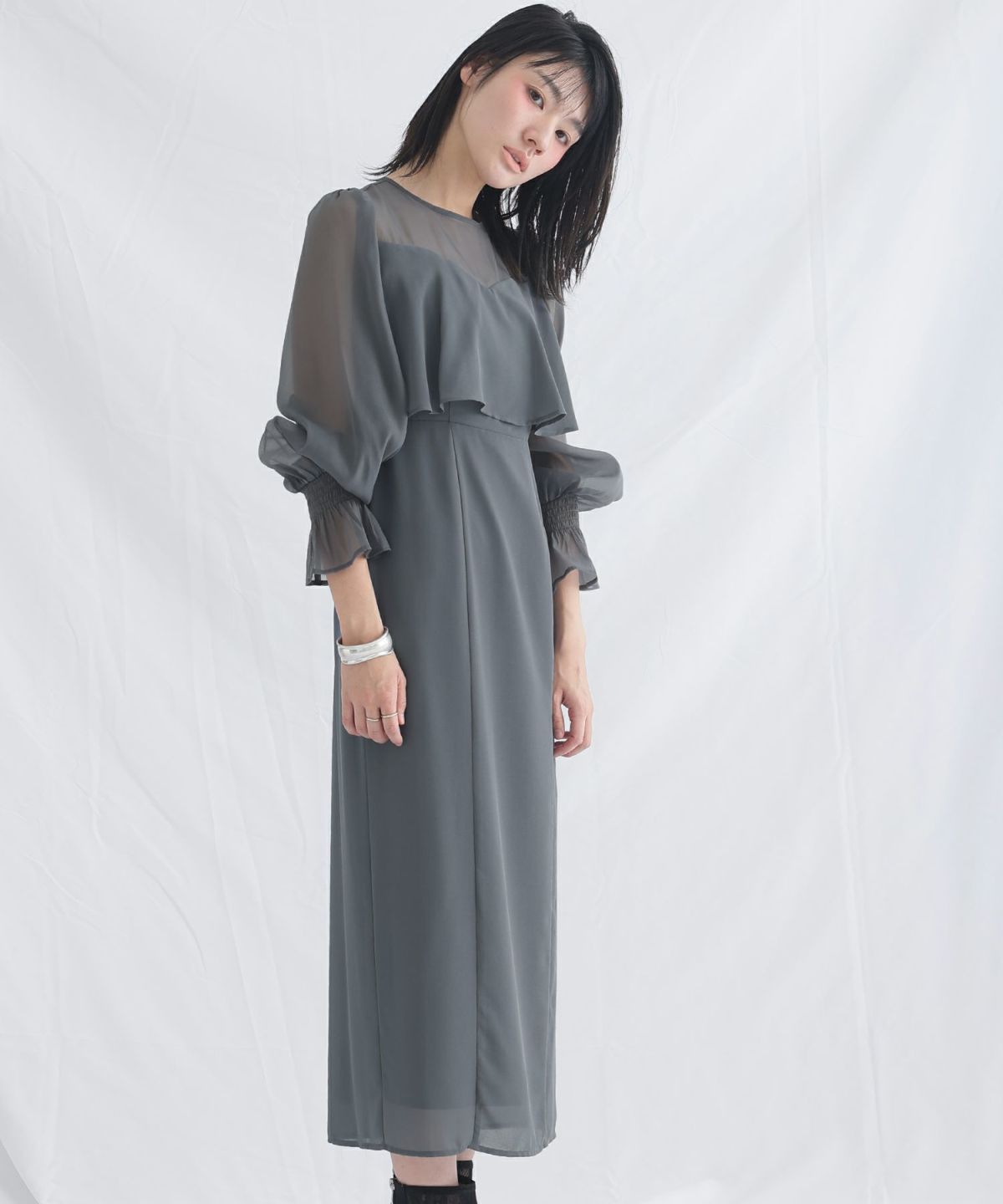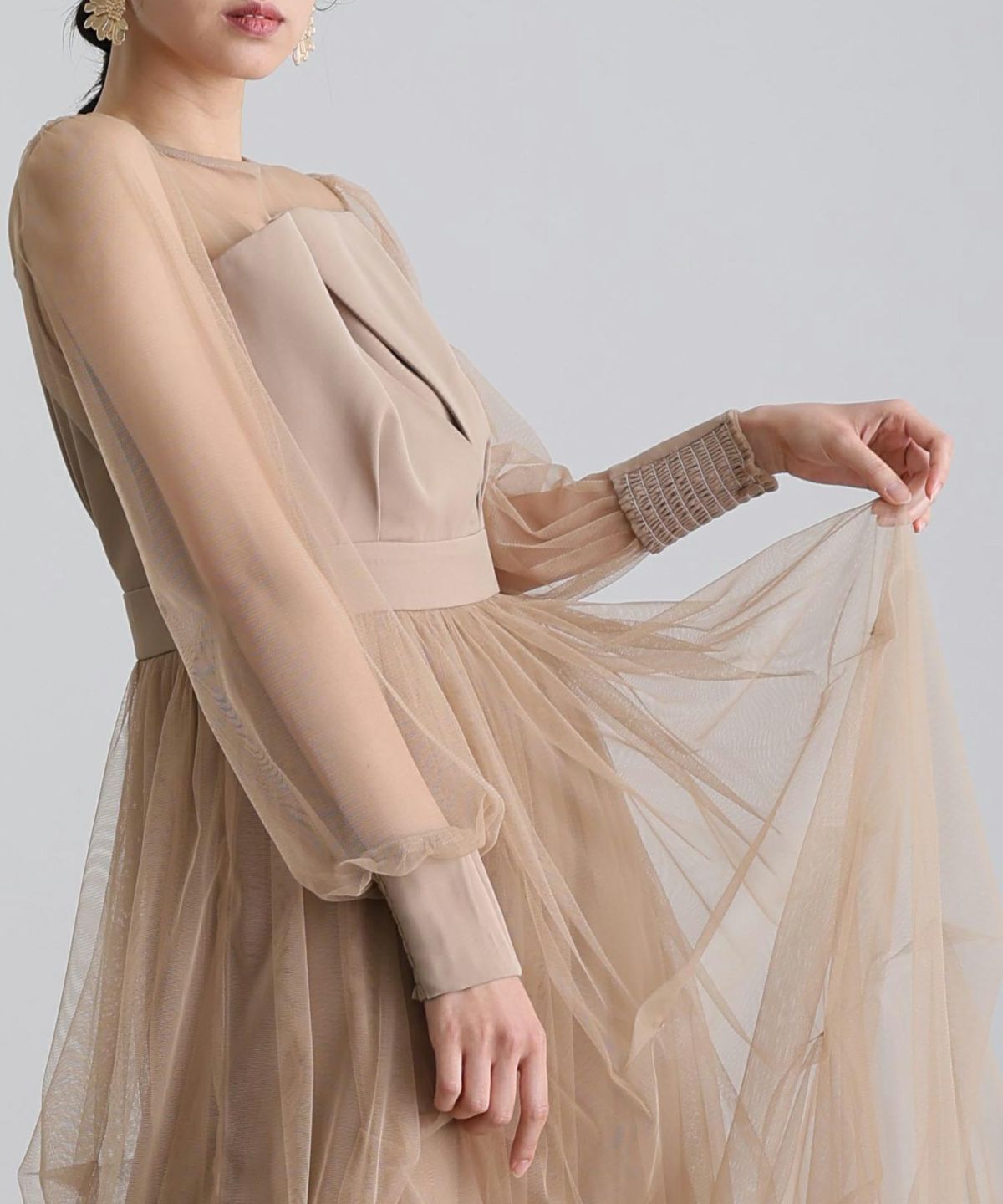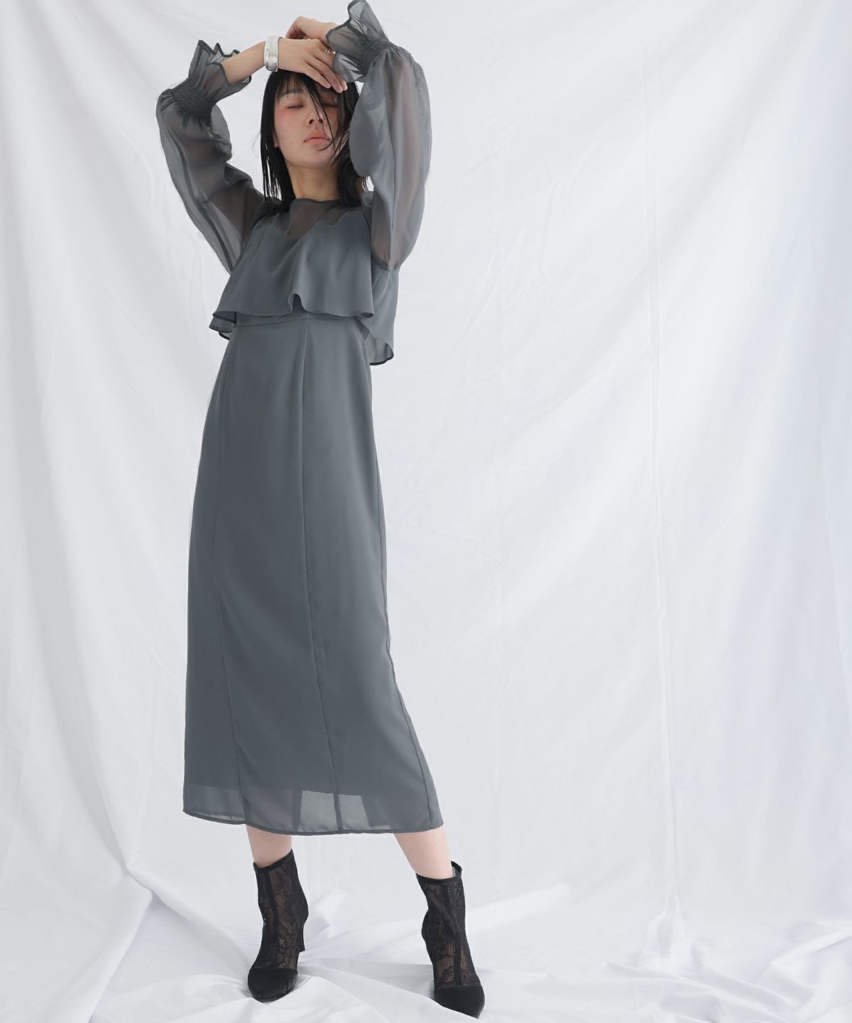 袖口のシャーリングでフェミニンな雰囲気に オーガンジー切り替えビスチェ風ワンピース