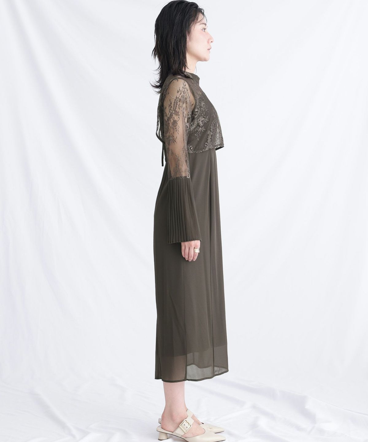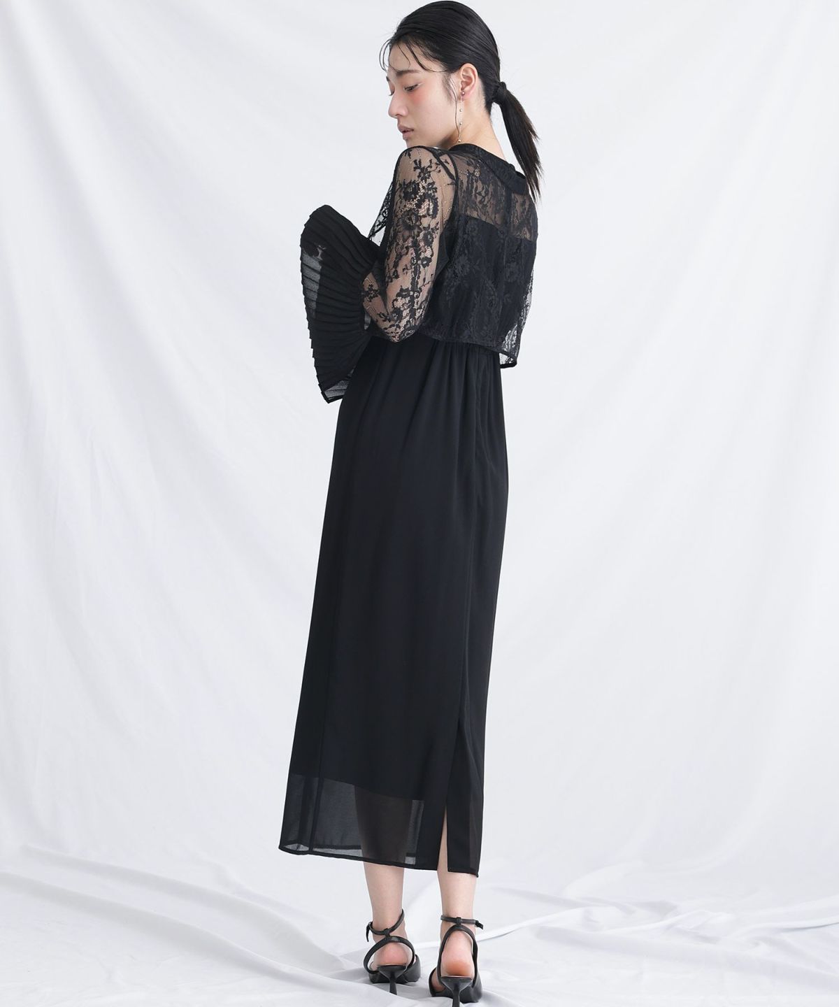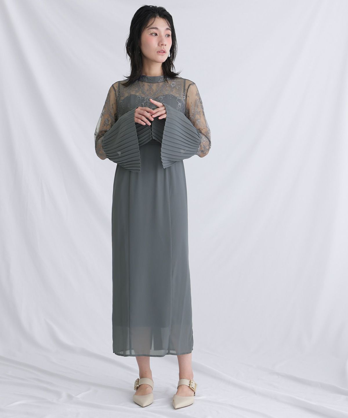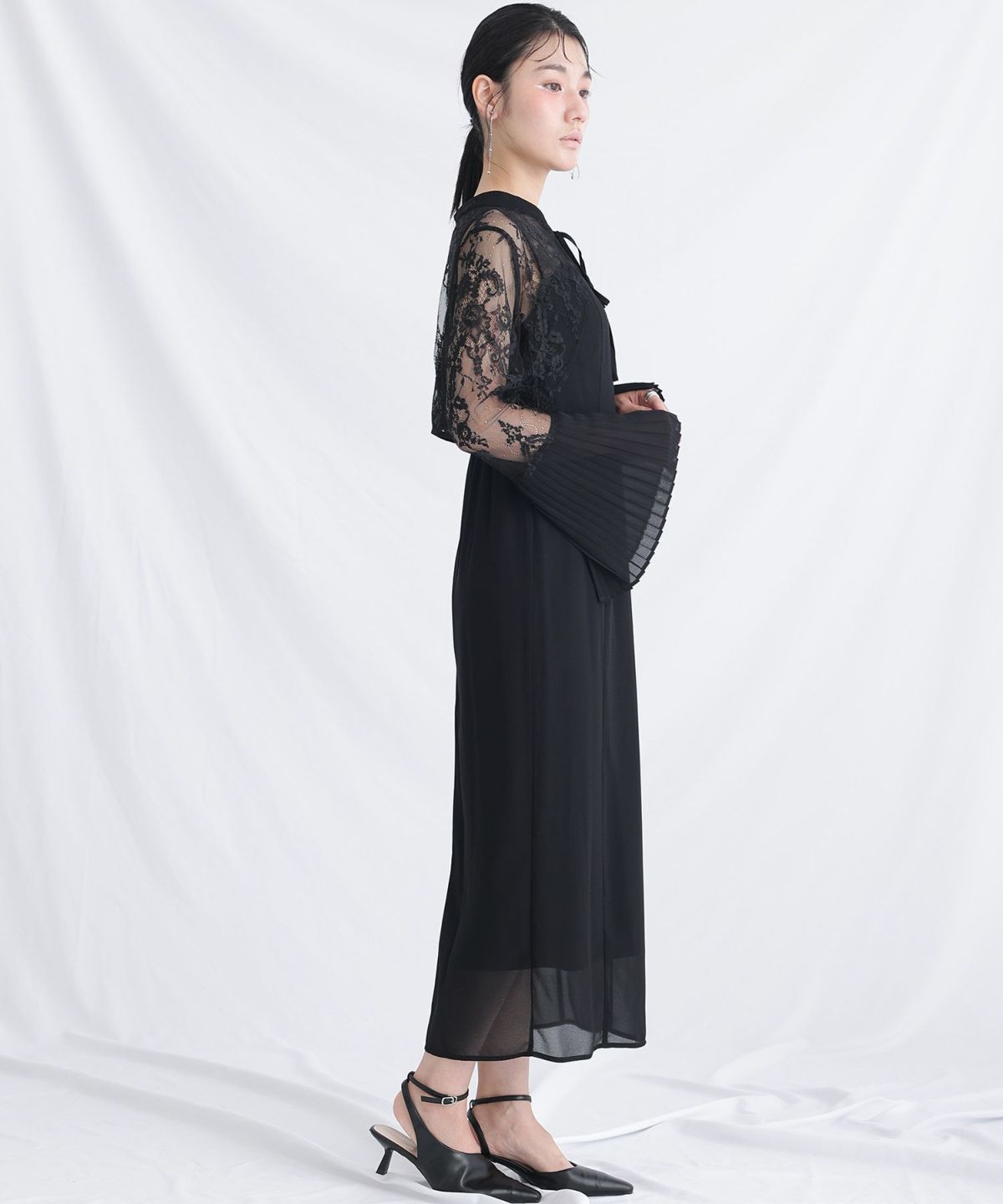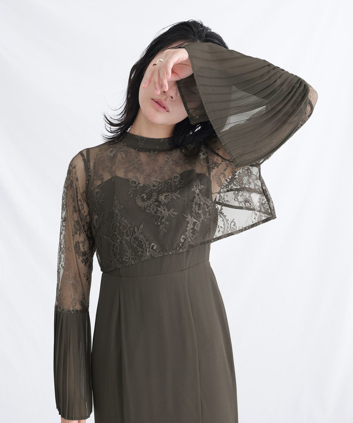 シャーリングが施された袖がふわりとかわいい レース×シフォンプリーツワンピース