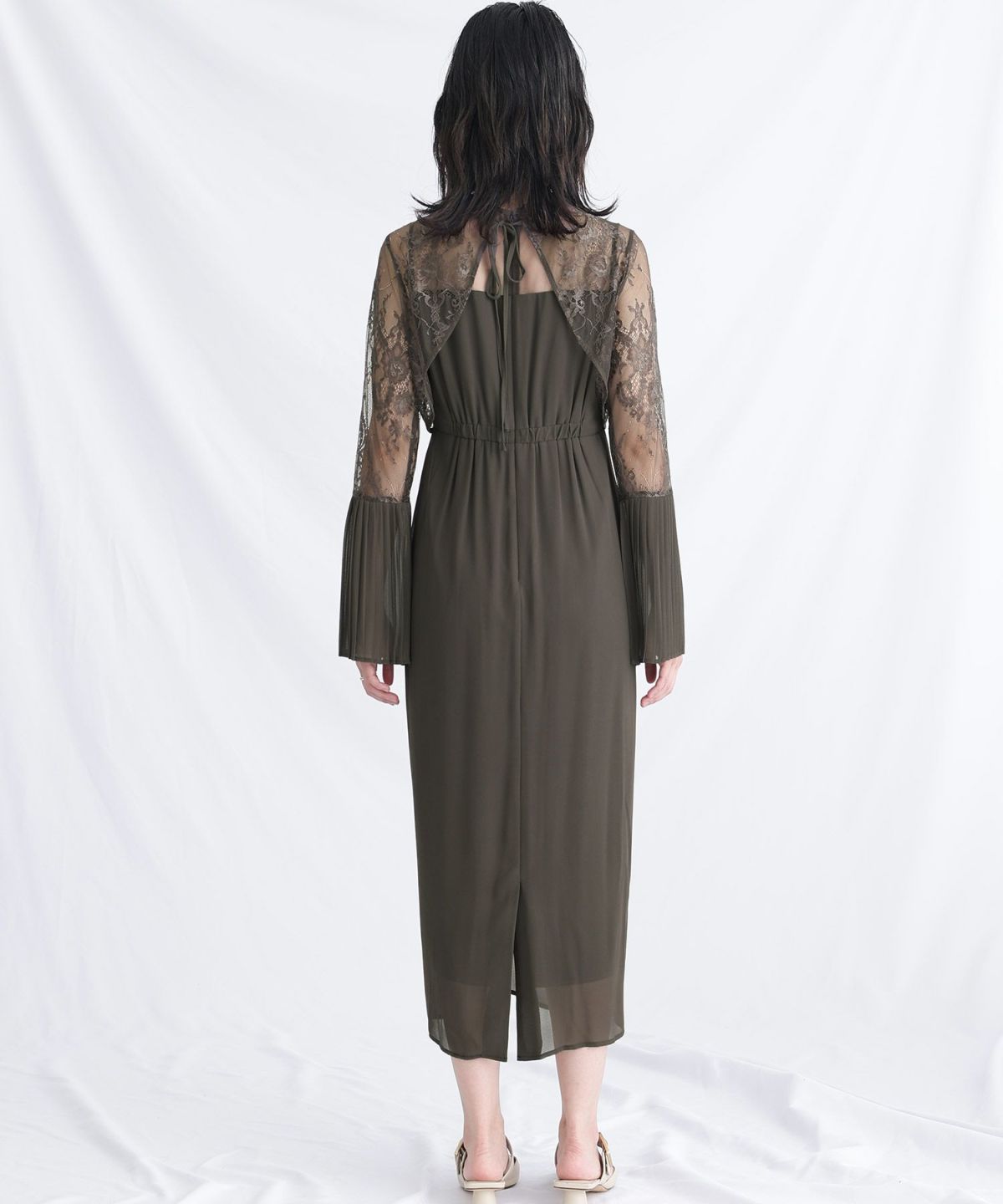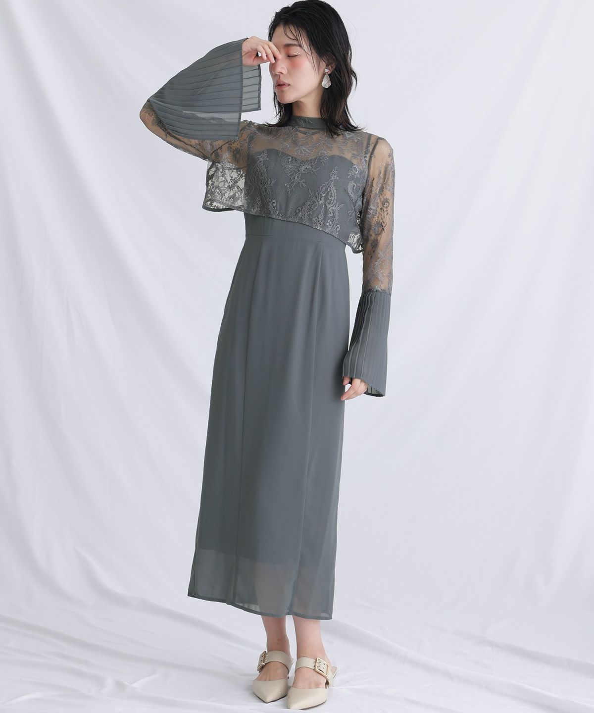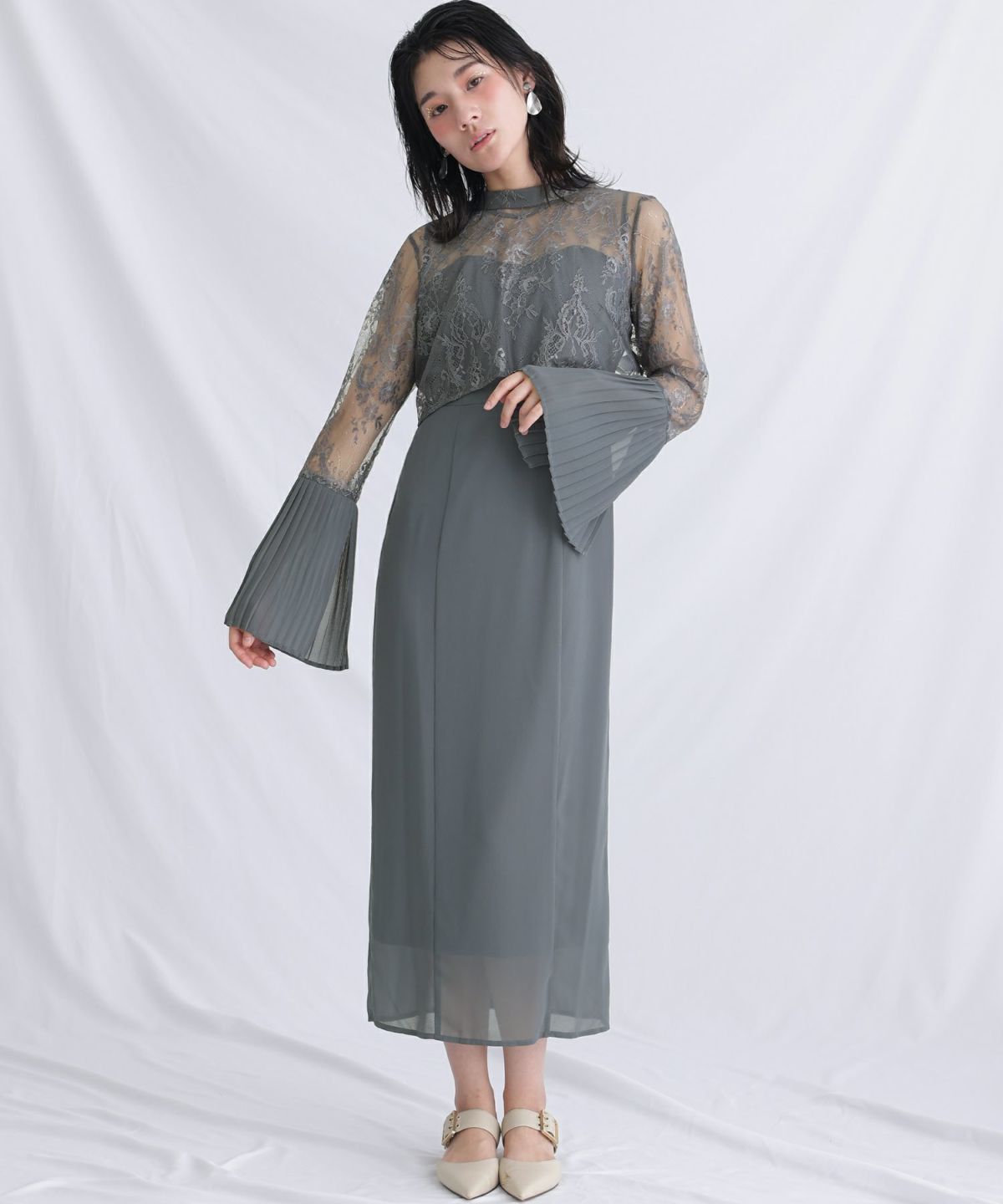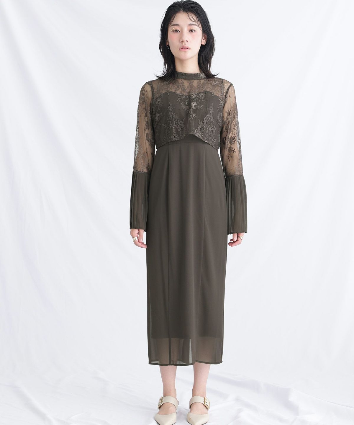 シャーリングが施された袖がふわりとかわいい レース×シフォンプリーツワンピース