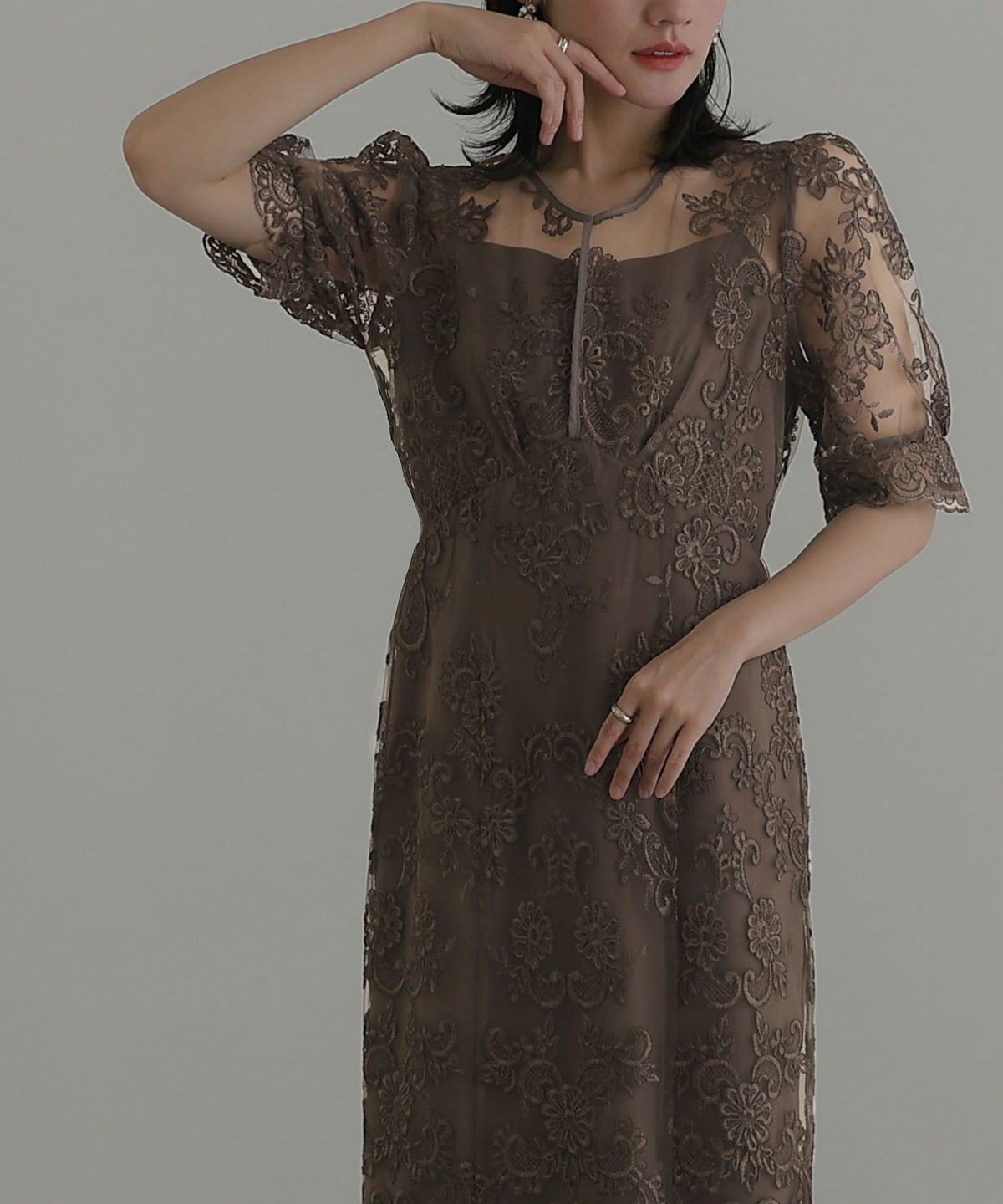 繊細な刺繍レースが施されたエレガントなドレス 総刺繍レースパフスリーブドレス