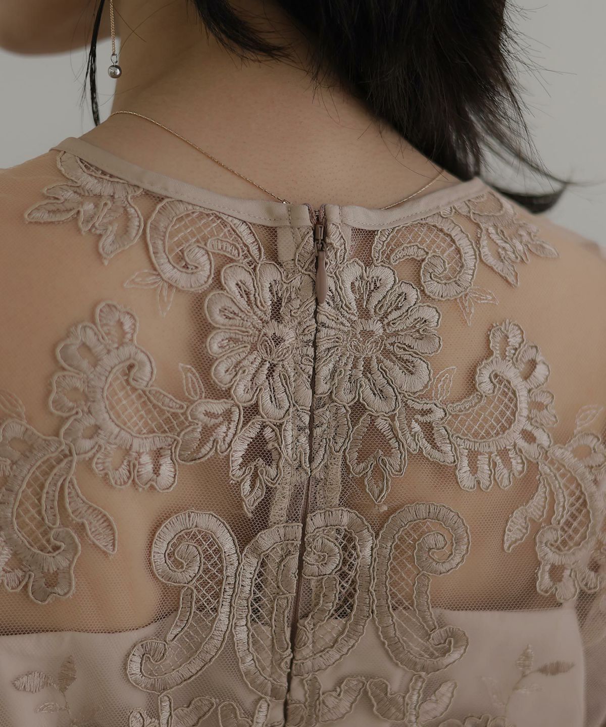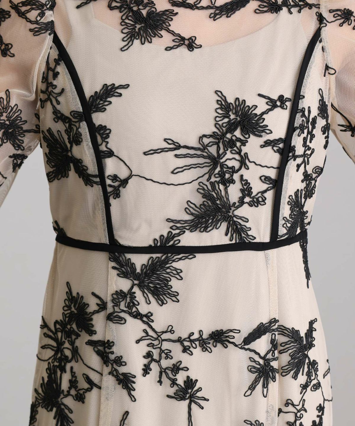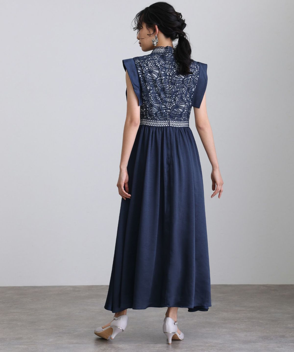 オリジナルの刺繍レースを贅沢に使用 Vネック2素材切替刺繍ドレス