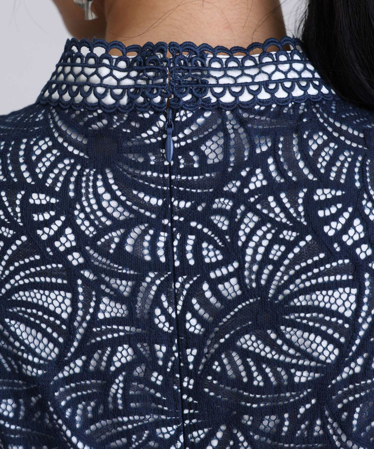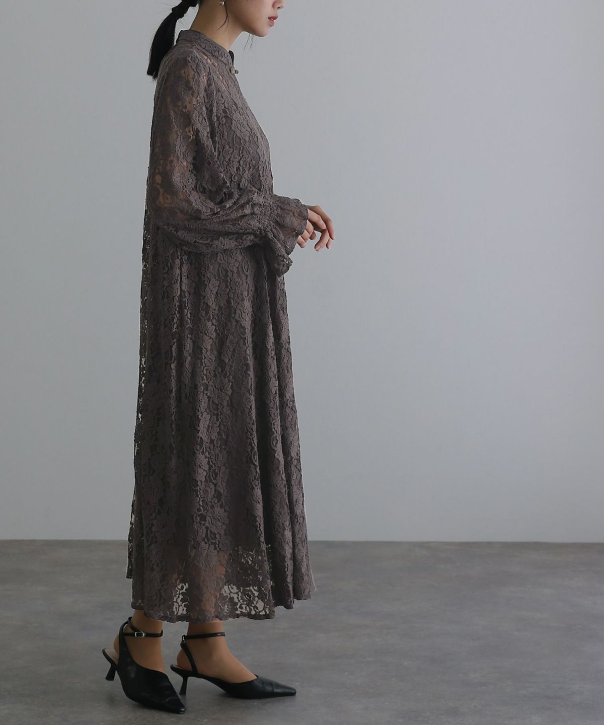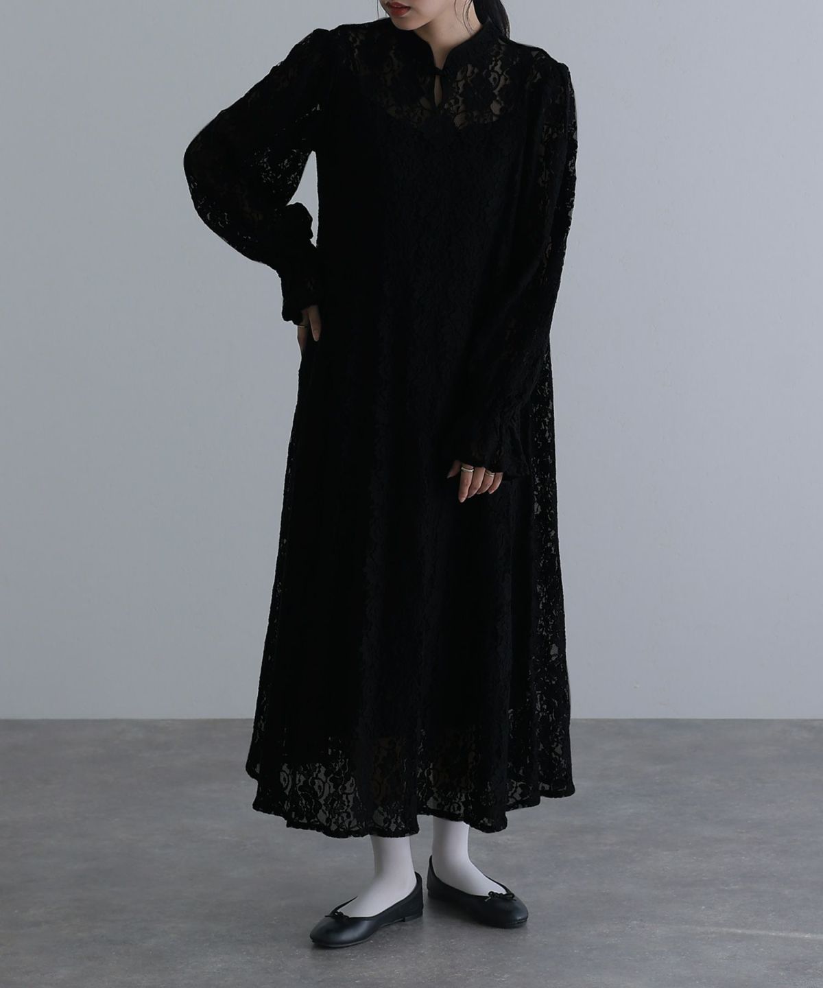 プチハイキーネック部分のチャイナ風デザインが個性的で可愛い レースサックワンピース
