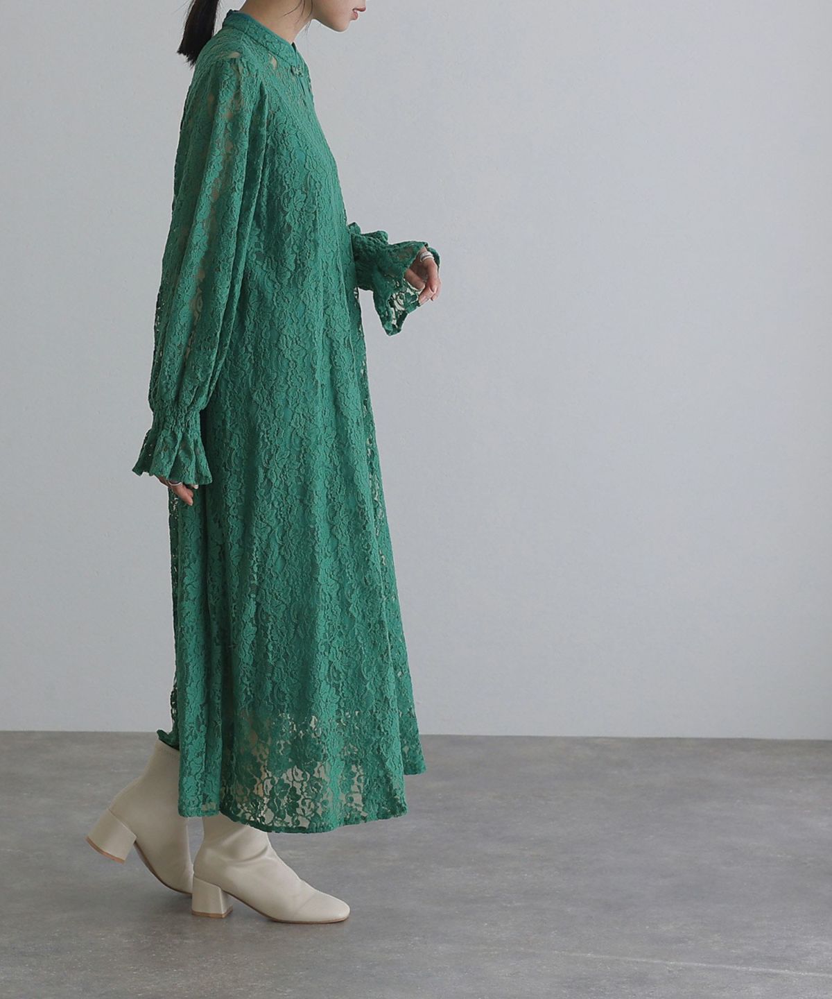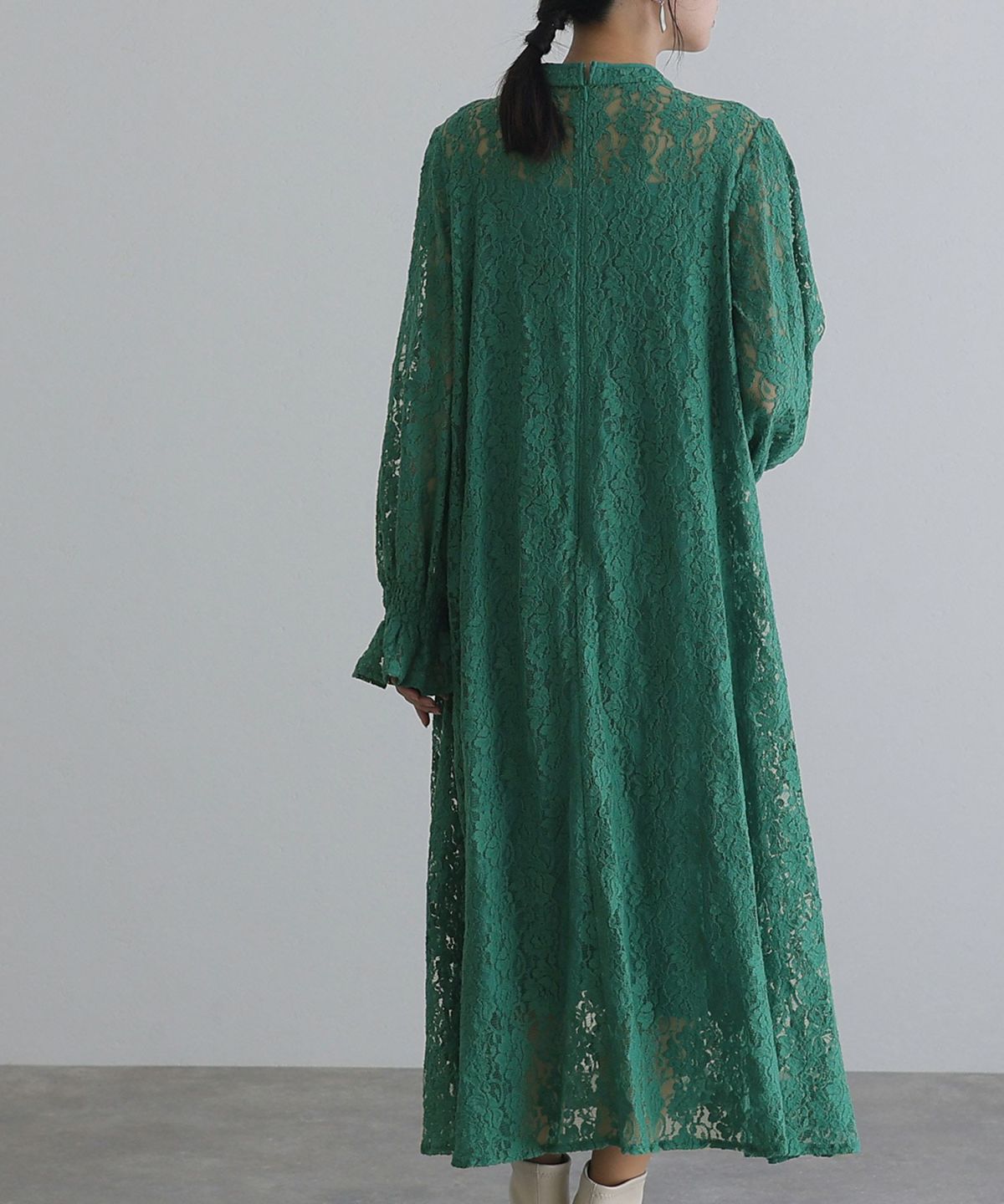 落ち着きのあるカラーとボタニカル柄が可愛い ラグランスリーブオールレースワンピース