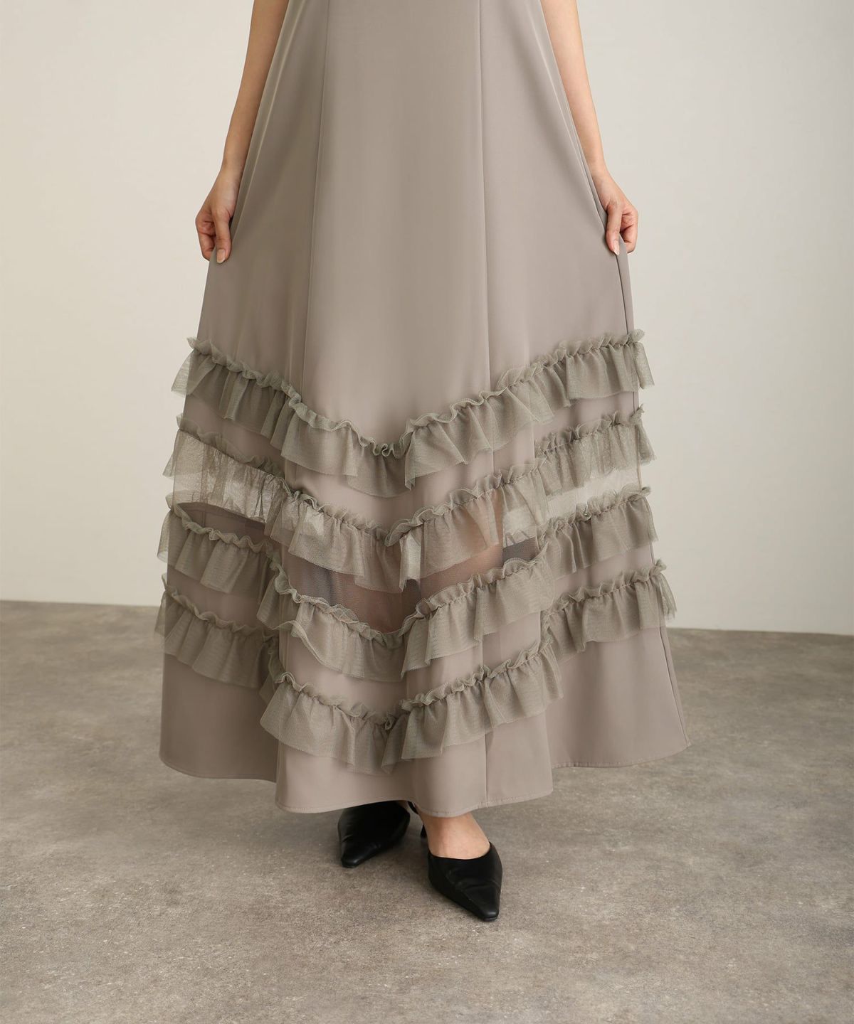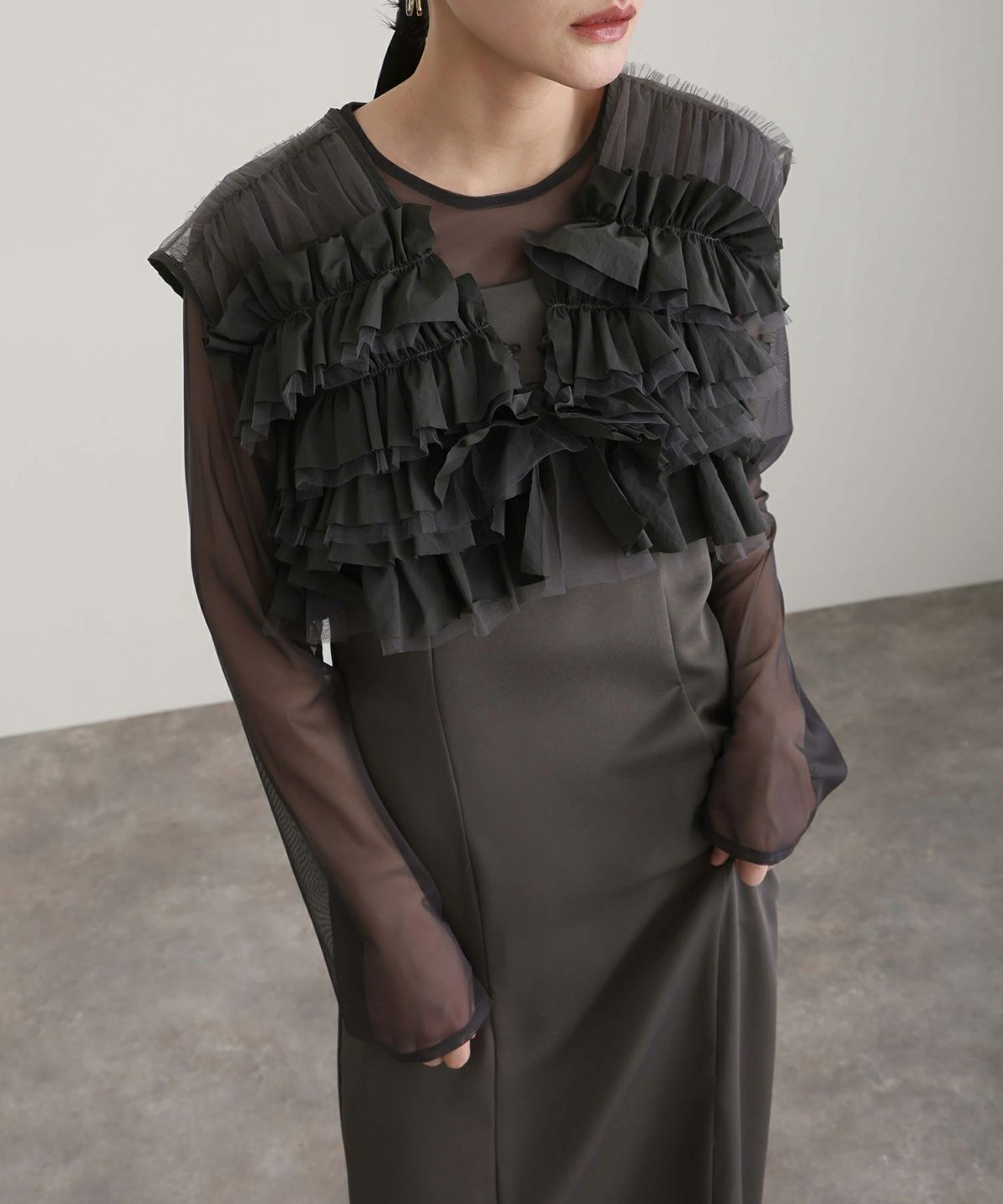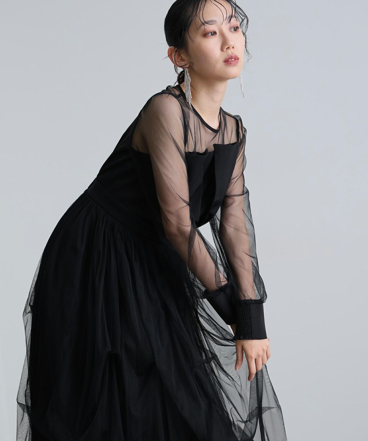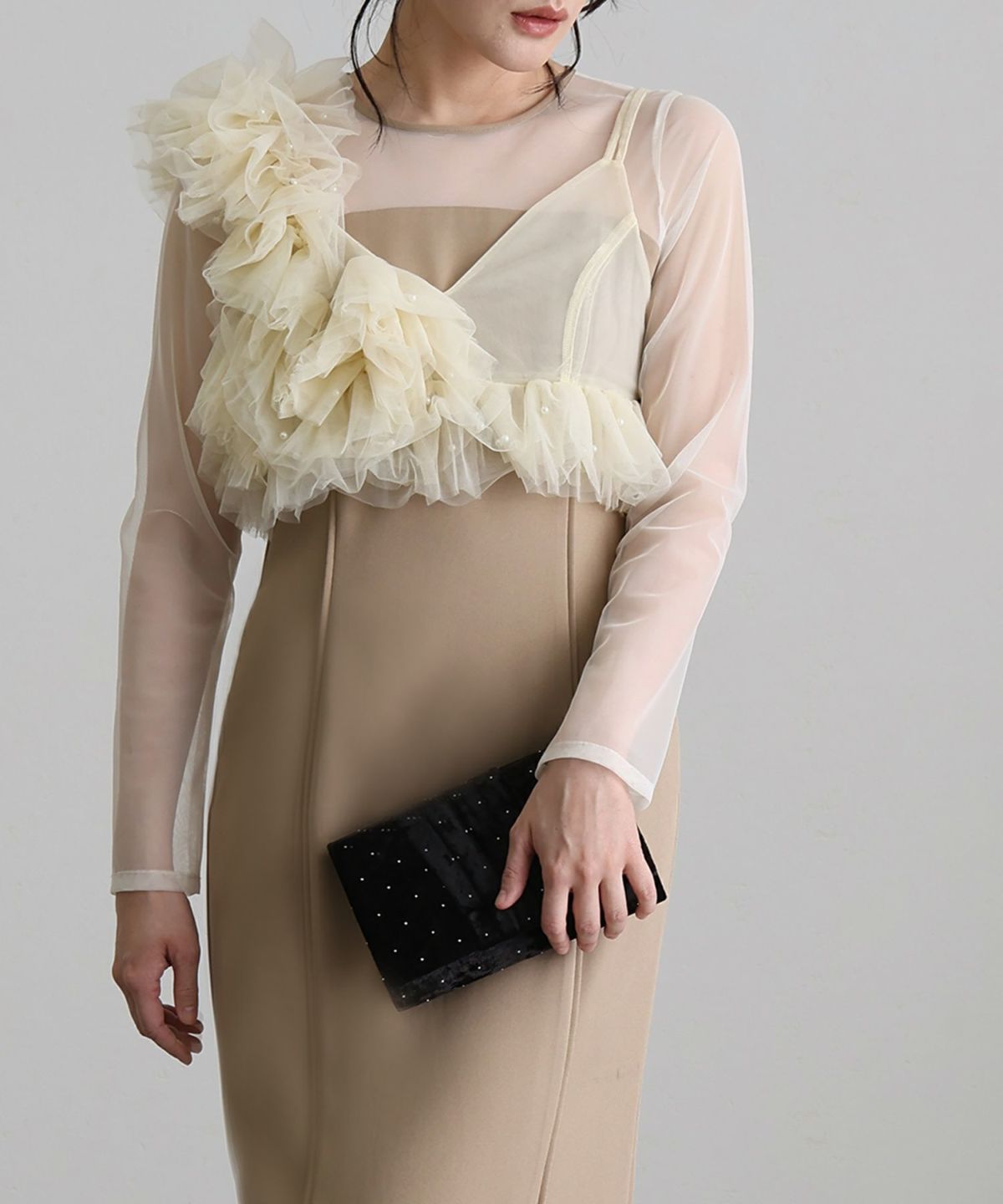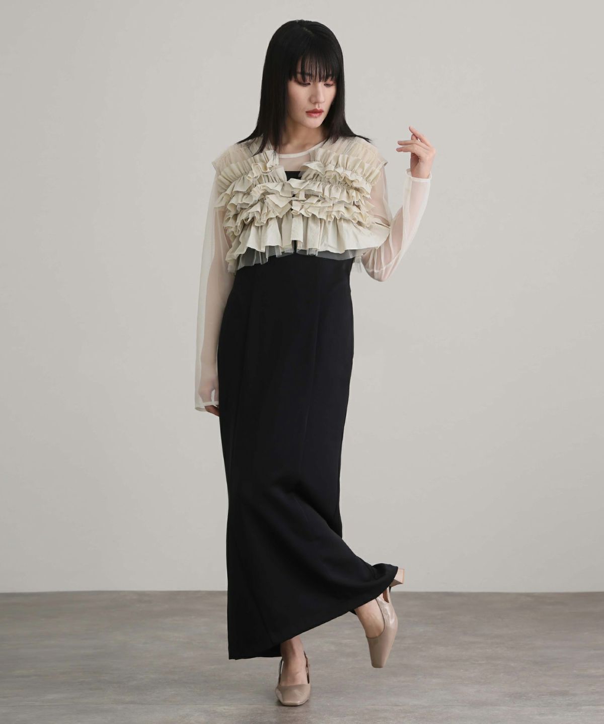 視線を惹きつけるチュールフリル トランスペアレントヘムセットアップドレス 2点セッ