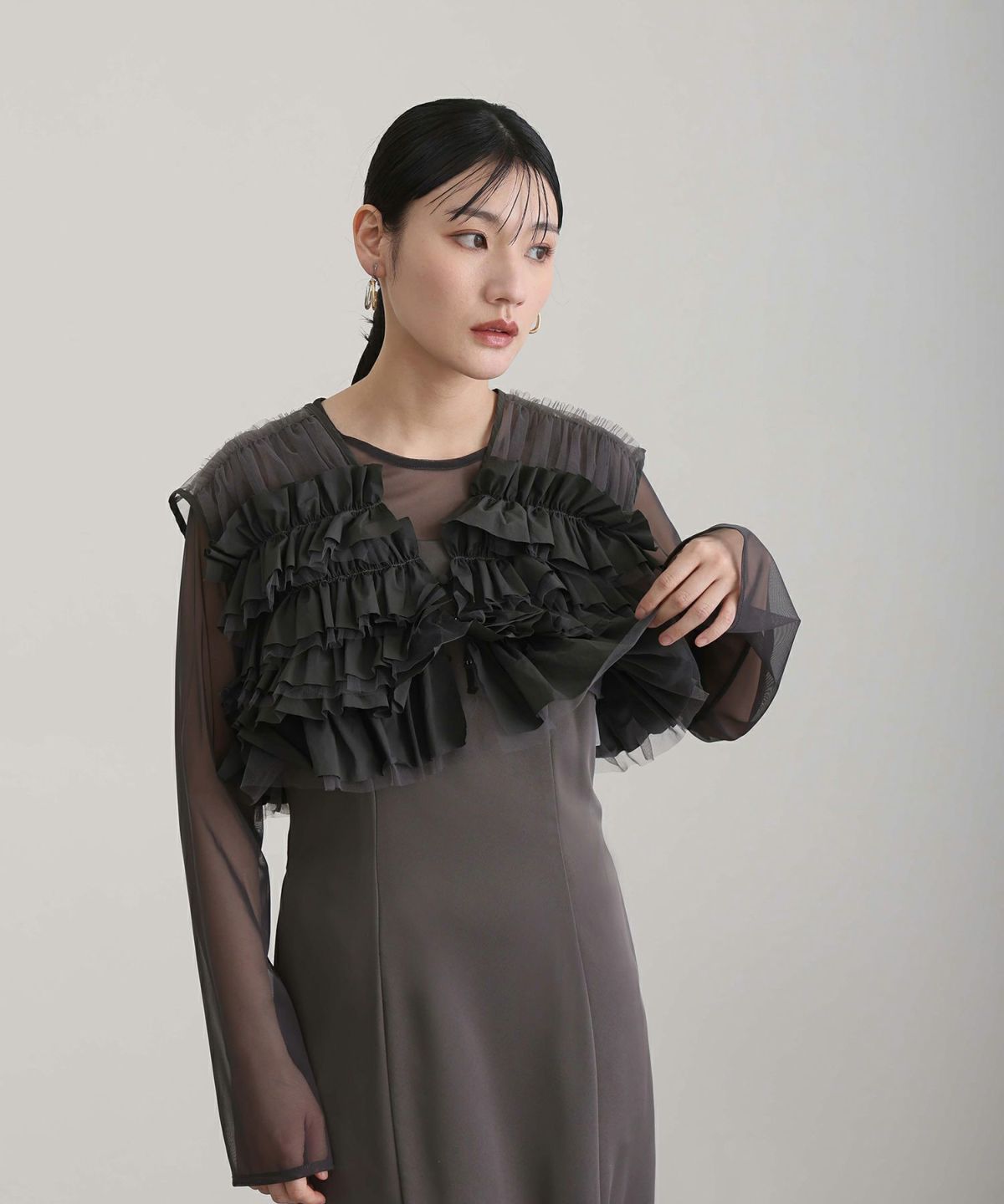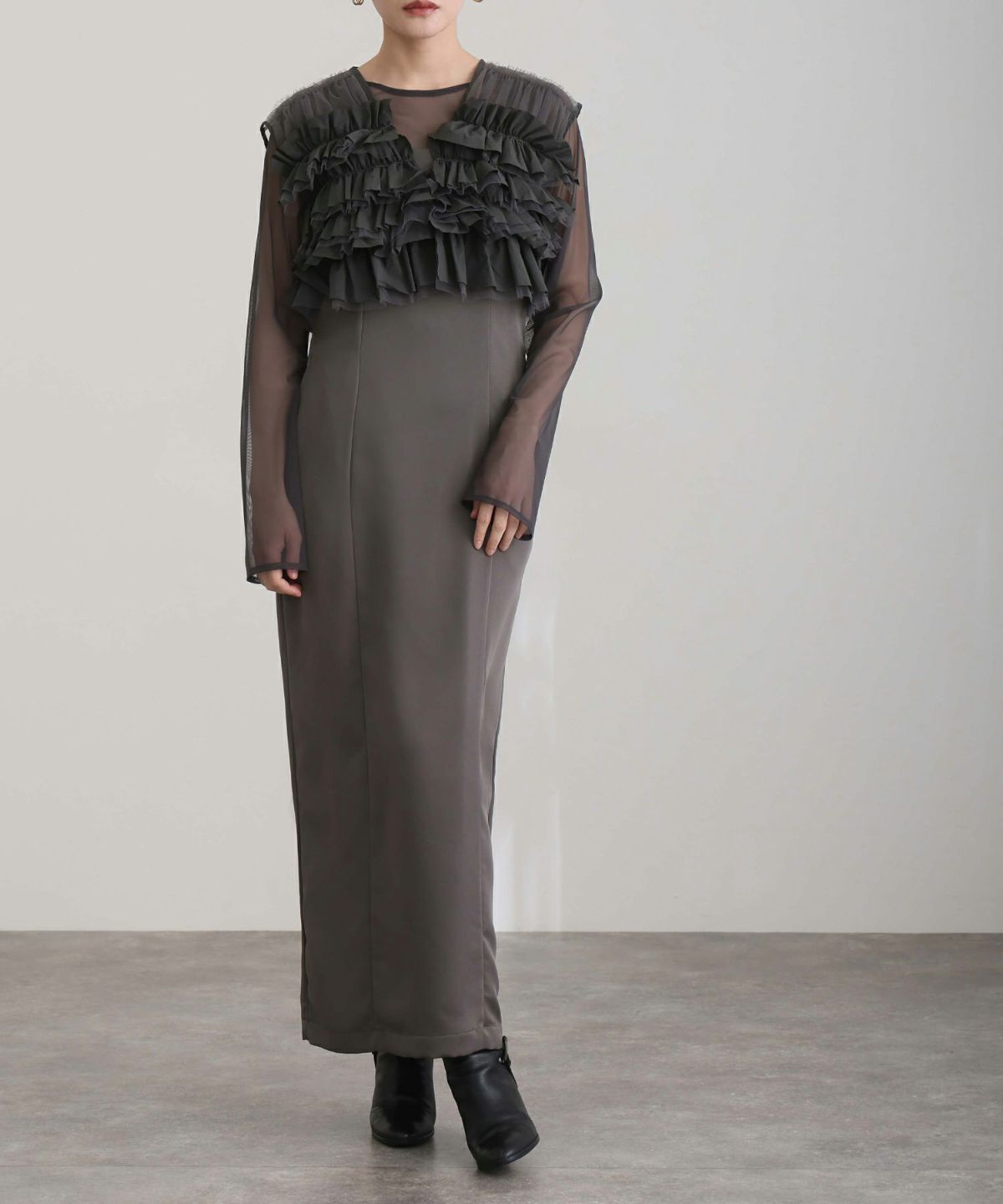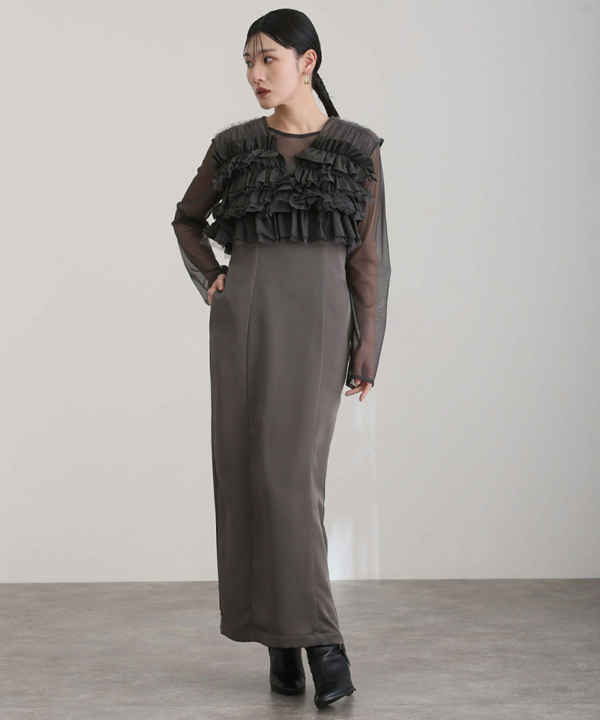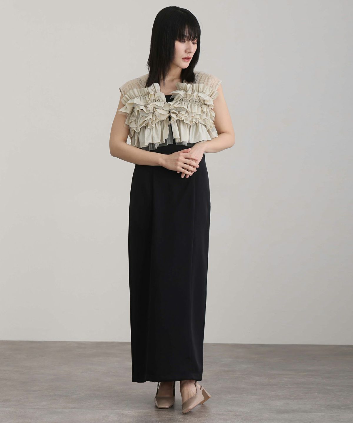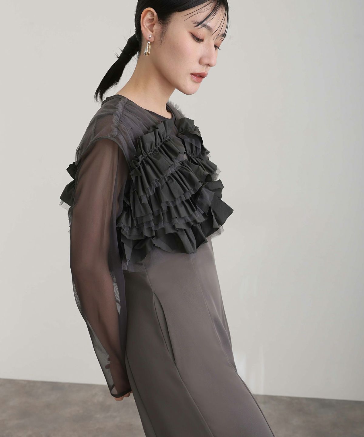 視線を惹きつけるチュールフリル トランスペアレントヘムセットアップドレス 2点セッ