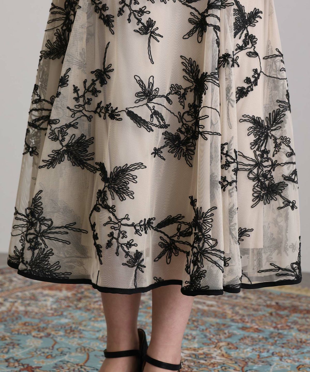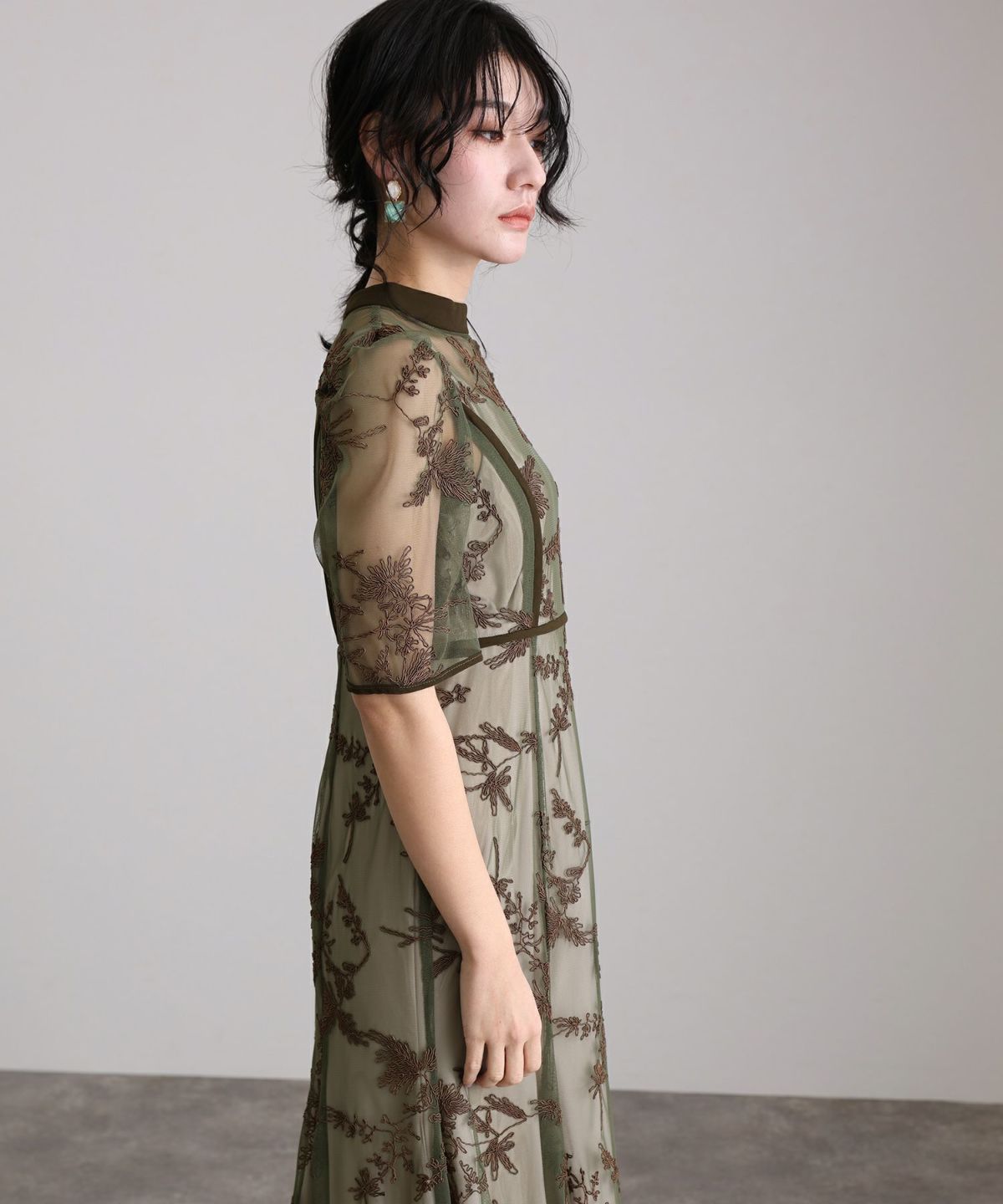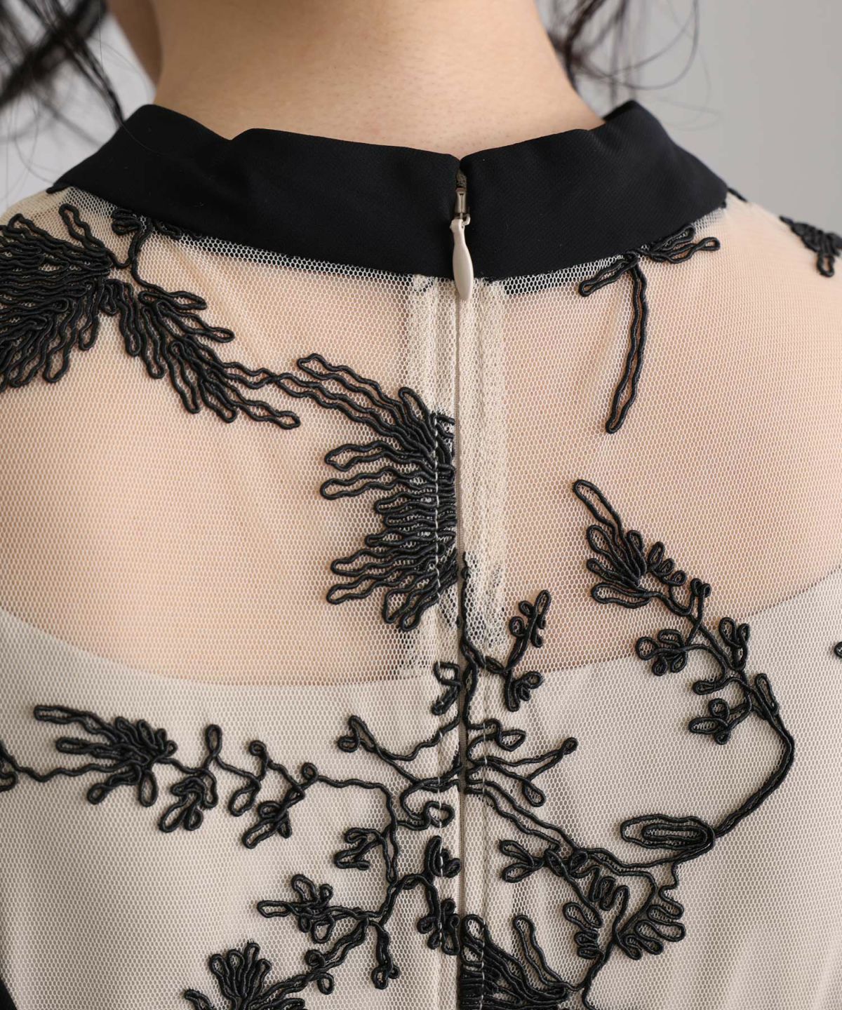 光沢のある糸を使用した花柄の刺繍がエレガントな印象に 刺繍レースタイトワンピース
