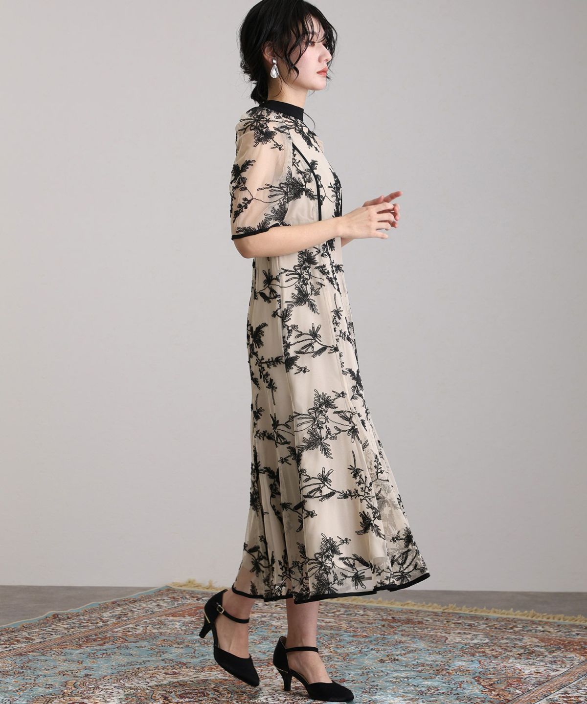 光沢感のある糸を使用した花柄レースが華やか 総レースクラシカルマーメイドワンピース