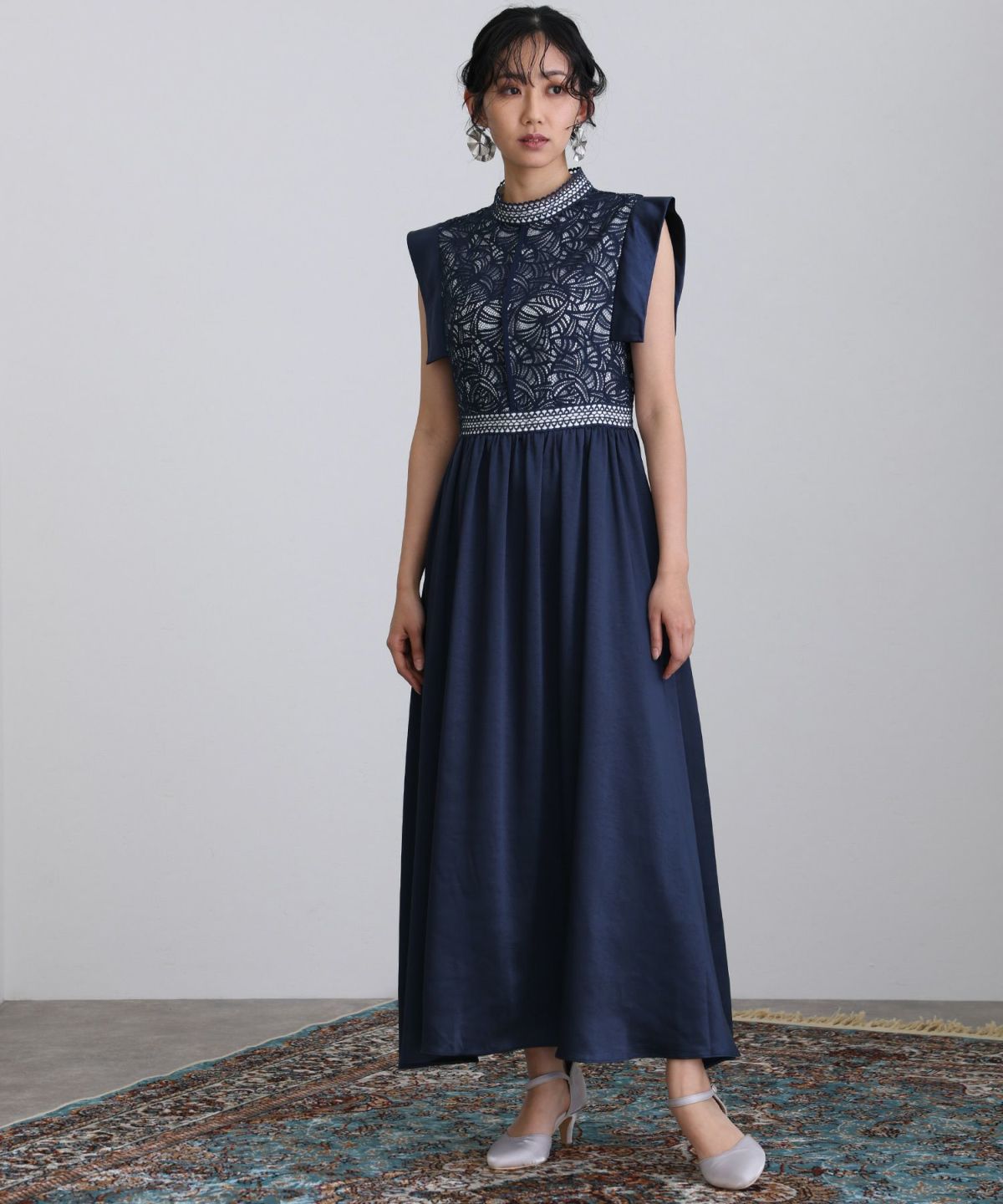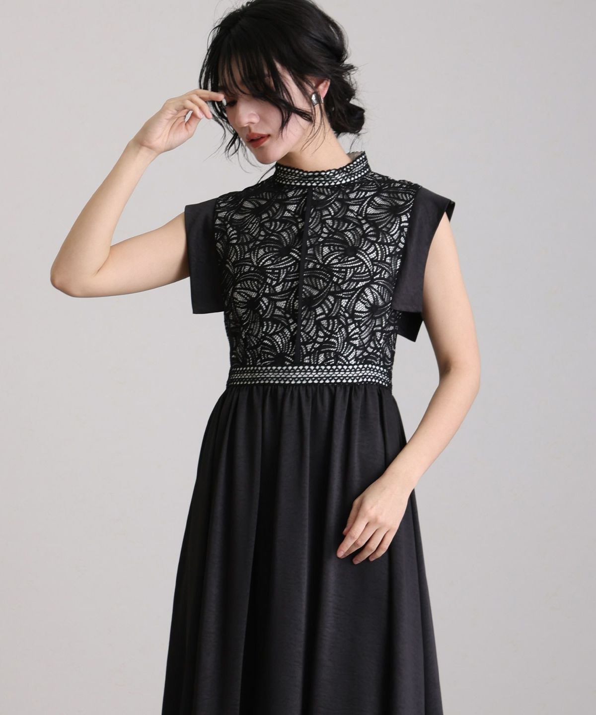 1枚でしっかり決まる華やかさ 幾何学レースサテンドレス