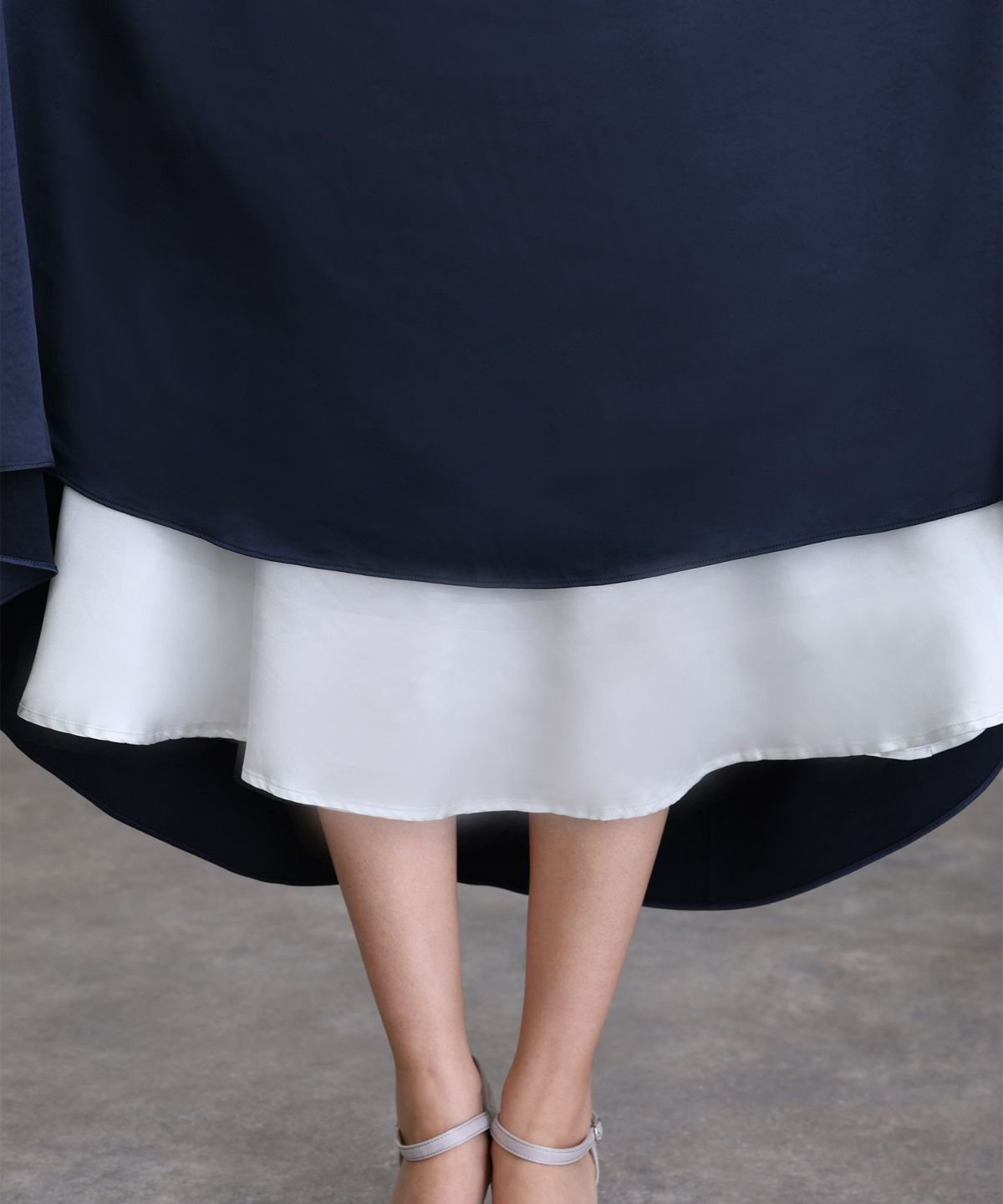 デコルテのカッティングデザインがこだわりポイント オープンティアドロップドレス
