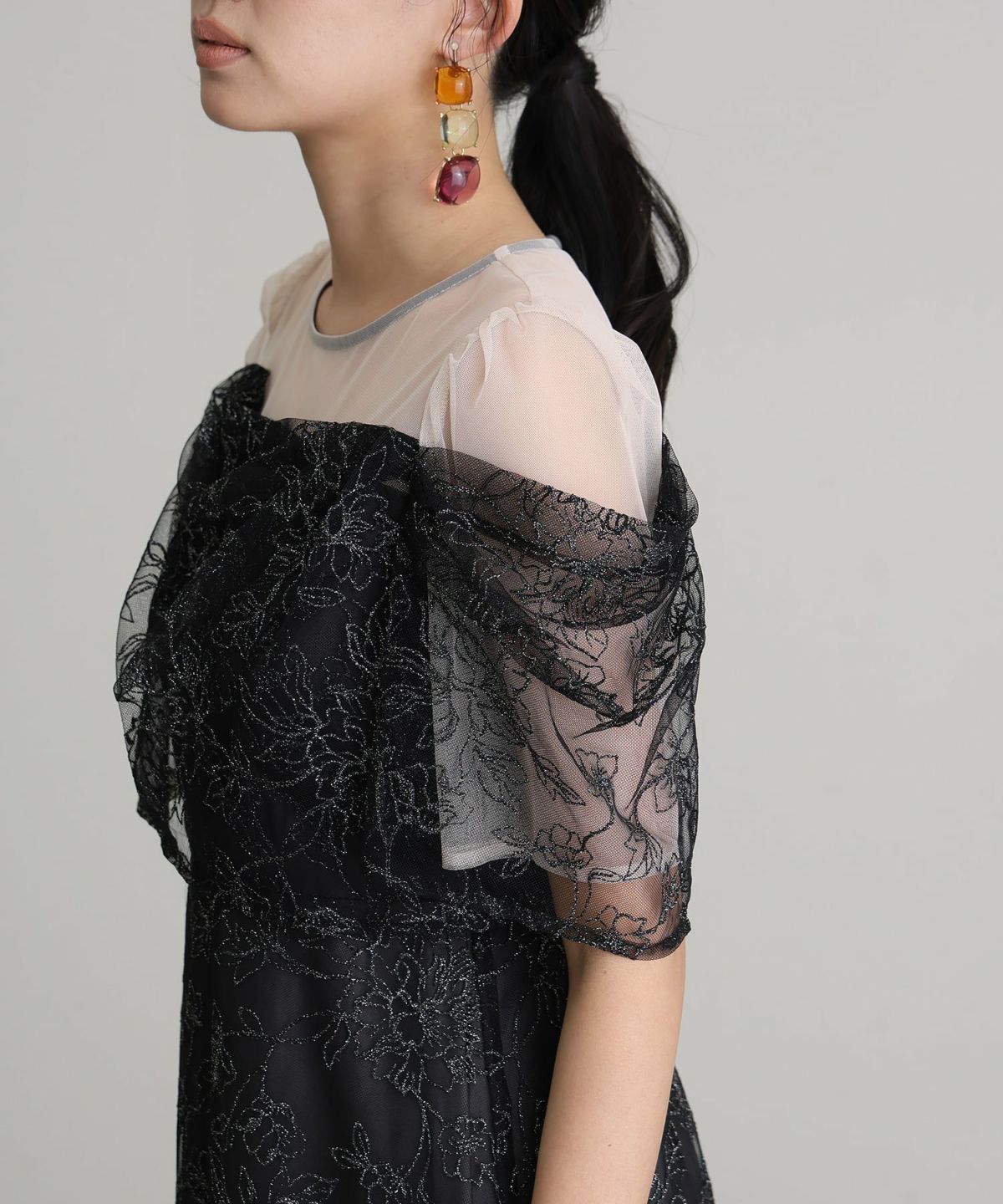 オフショル風のデザインが女性らしい ドレープラメ刺繍ドレス