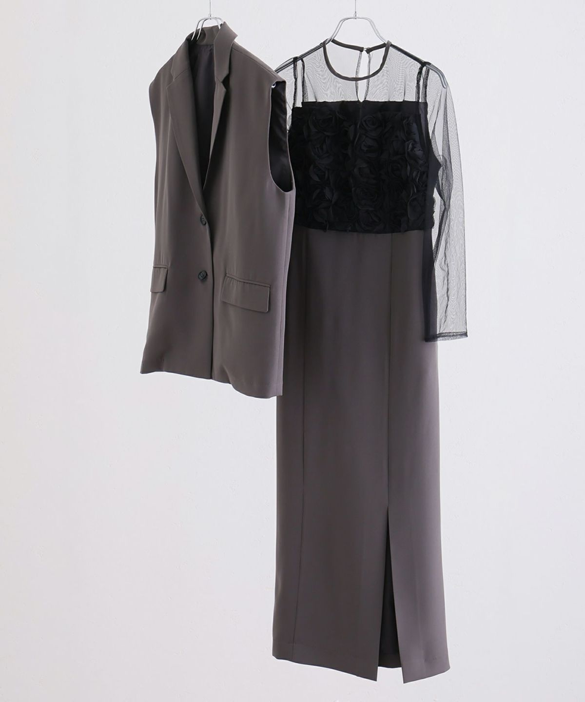 シンプルな中にも上品な存在感 フラワーモチーフワンピースジレ2点セット
