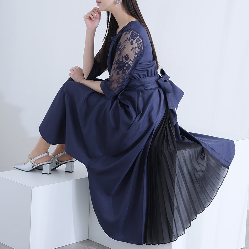 PourVous・atloのパンツドレスは、パーティードレスとしての華やかさと、上品なきちんと感を兼ね備えた一着。