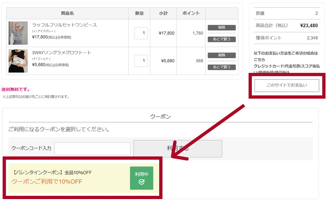 クーポンは自動で取得されます。適用されているクーポンは、お支払い画面にてご確認いただけます。